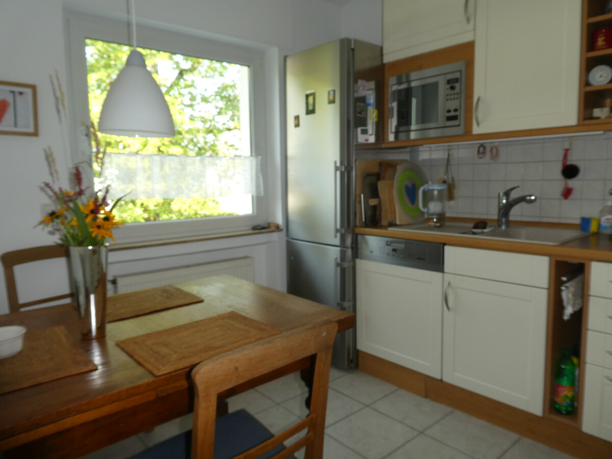 Der Eingang der Wohnung befindet sich im Erdgeschoss und führt über eine Treppe direkt in die Wohnräume. Beim Betreten empfängt Sie ein einladender Flur, der direkt in den großzügigen Wohn- und Essbereich führt. Hier sorgt ein Kamin für eine gemütliche Atmosphäre. Die angrenzende Küche ist praktisch gestaltet und bietet ausreichend Platz für kulinarische Entfaltung. Ein Gäste-WC mit Dusche ergänzt das Raumangebot im Erdgeschoss.