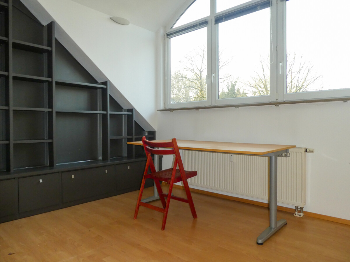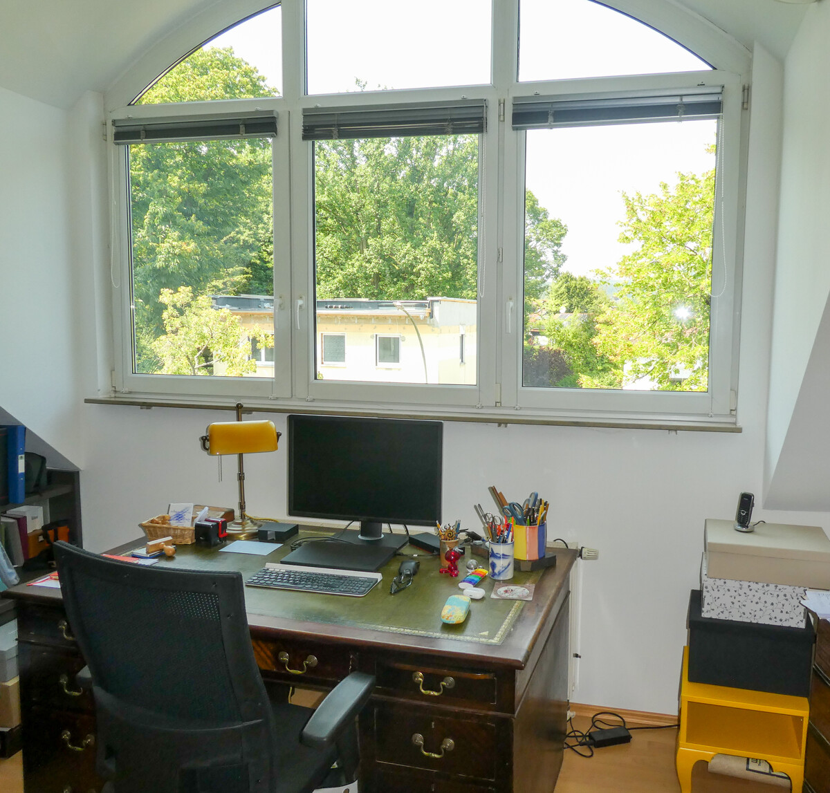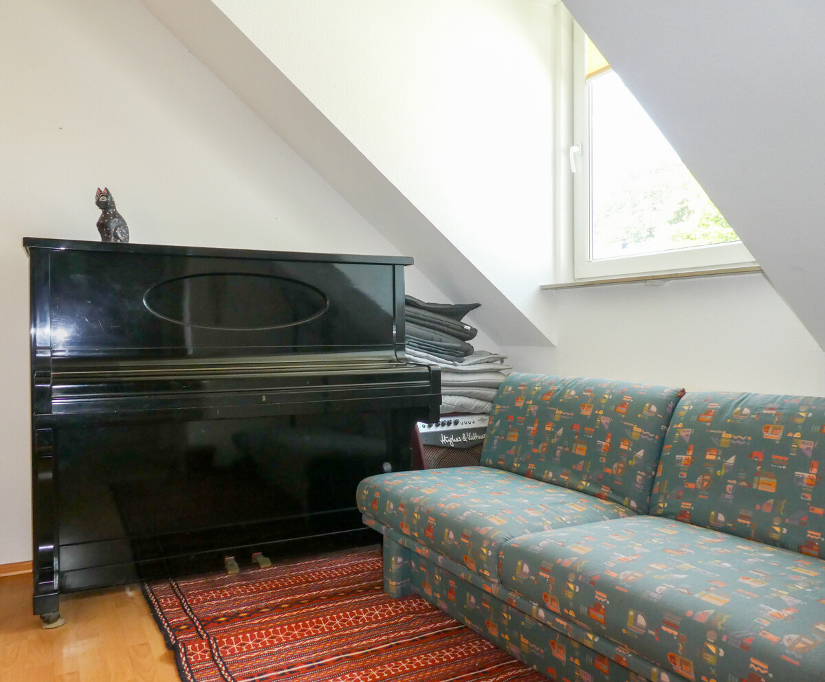 Im Obergeschoss befinden sich die privaten Rückzugsorte: ein geräumiges Schlafzimmer, ein Kinderzimmer und ein Arbeitszimmer. Ein modernes Badezimmer mit Badewanne und Dusche sorgt für den nötigen Komfort. Die Dachterrasse lädt zum Entspannen und Genießen der Aussicht ein.