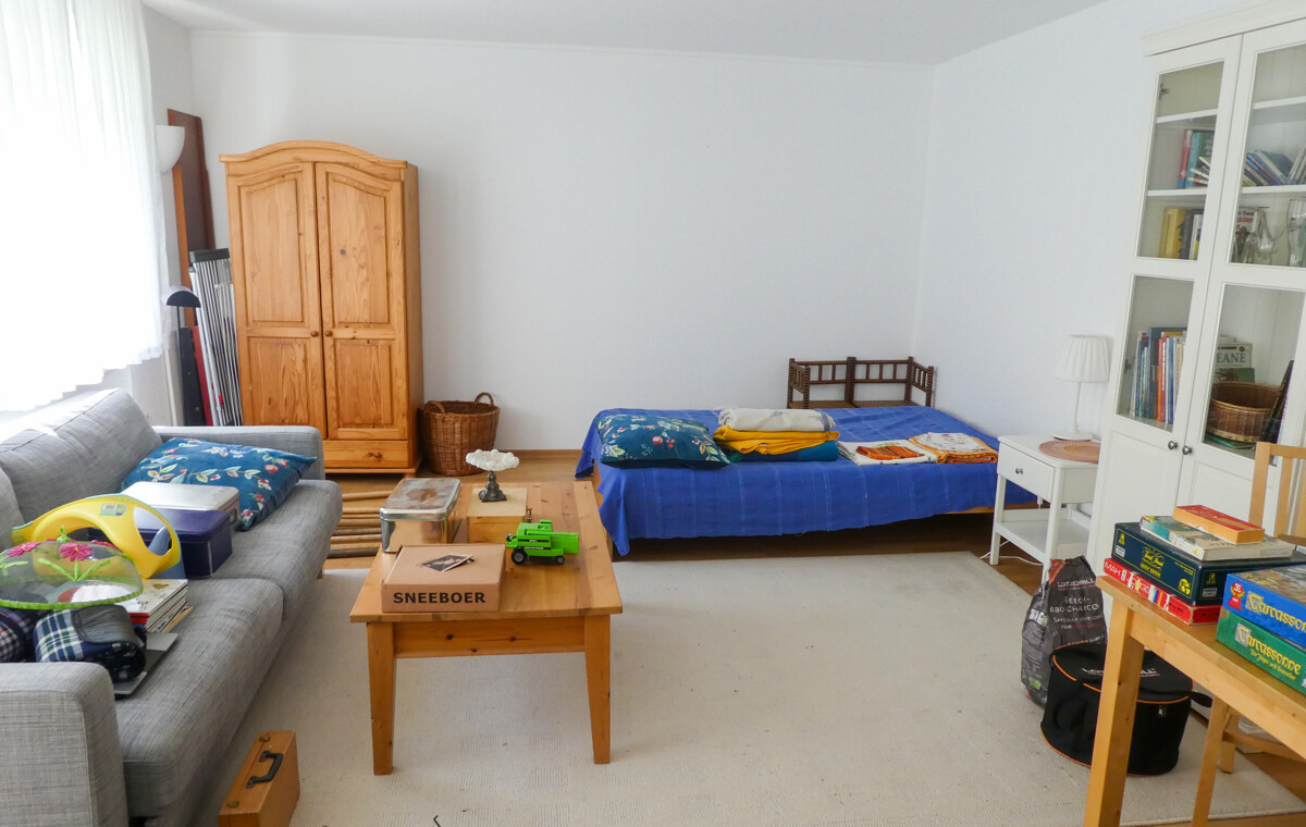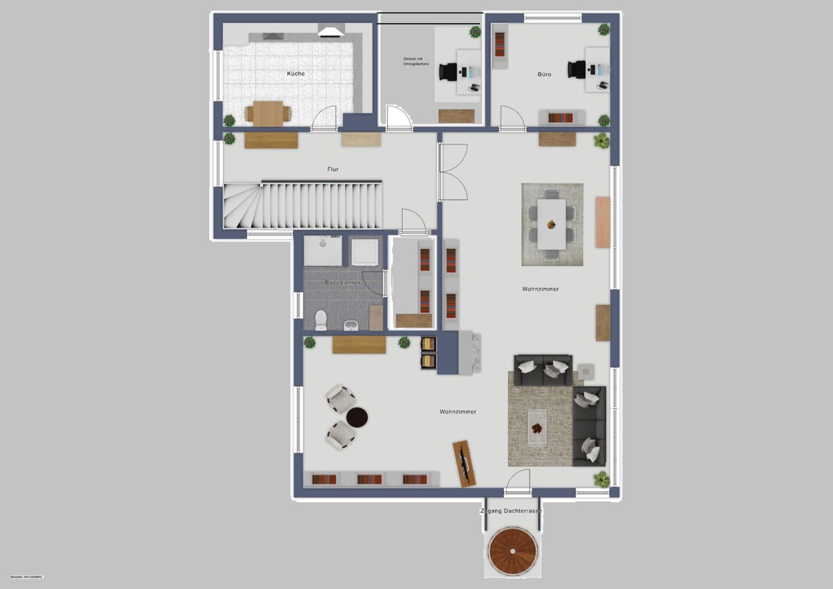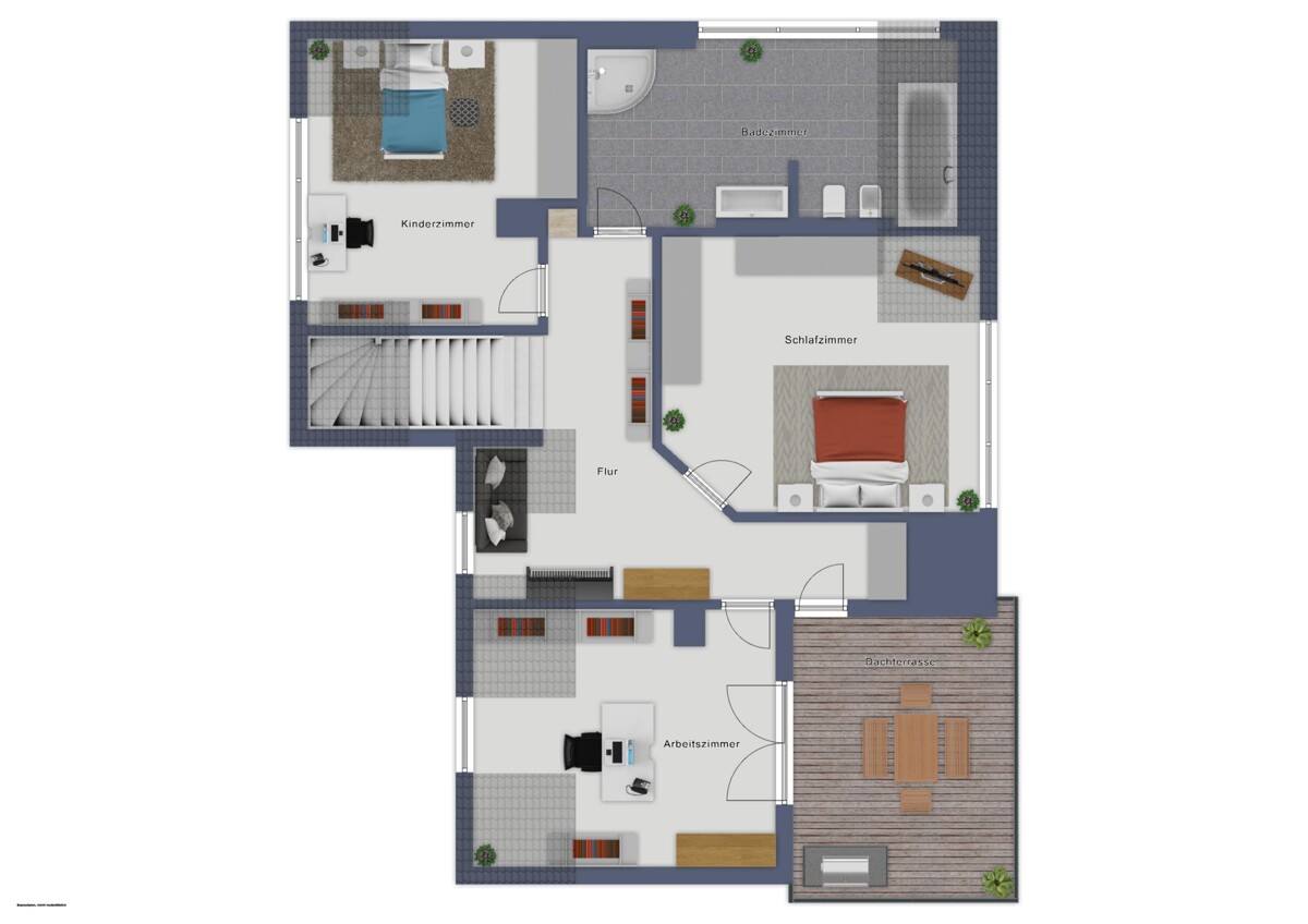 Im Obergeschoss befinden sich die privaten Rückzugsorte: ein geräumiges Schlafzimmer, ein Kinderzimmer und ein Arbeitszimmer. Ein modernes Badezimmer mit Badewanne und Dusche sorgt für den nötigen Komfort. Die Dachterrasse lädt zum Entspannen und Genießen der Aussicht ein.