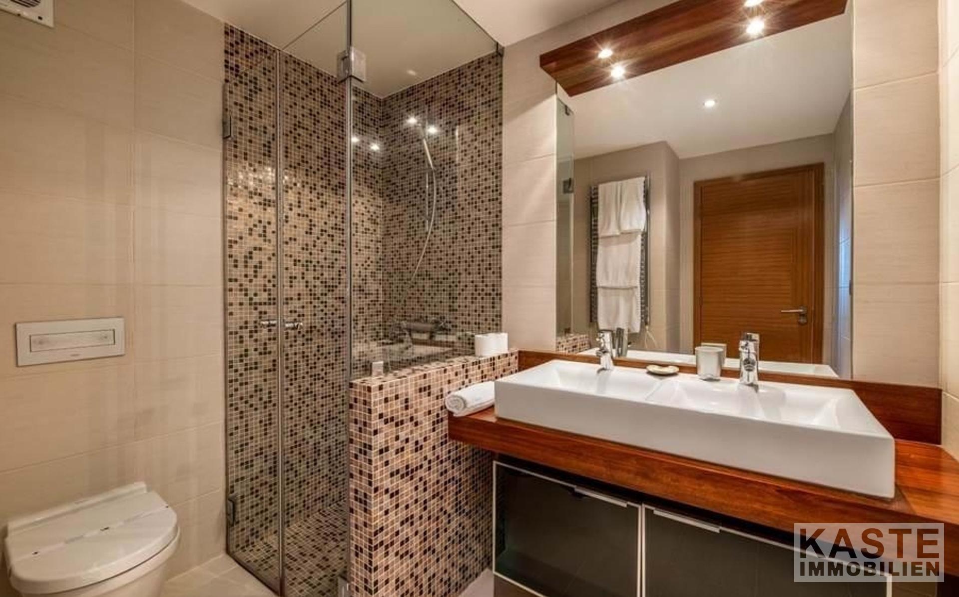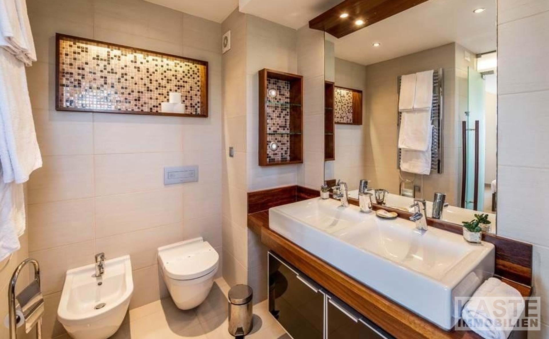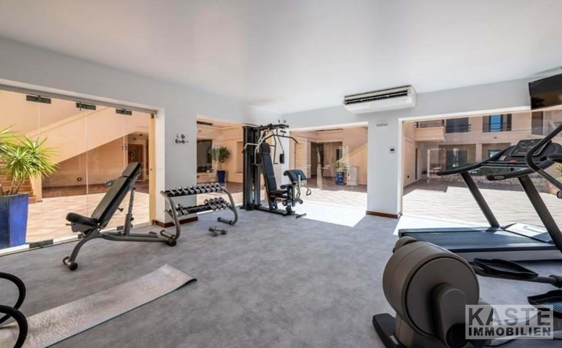 Zusätzliche Annehmlichkeiten wie ein Video-Eingangssystem, Satellitenfernsehen, Doppelverglasung, elektrische Rollläden und ein zentrales Staubsaugersystem sorgen für maximalen Komfort. Ein voll ausgestatteter Fitnessraum, eine Terrasse mit Sonnenliegen, ein traditionelles türkisches Bad und ein großzügiger Balkon bieten reichlich Platz für Entspannung und Freizeit.