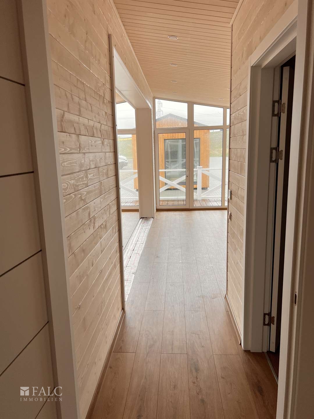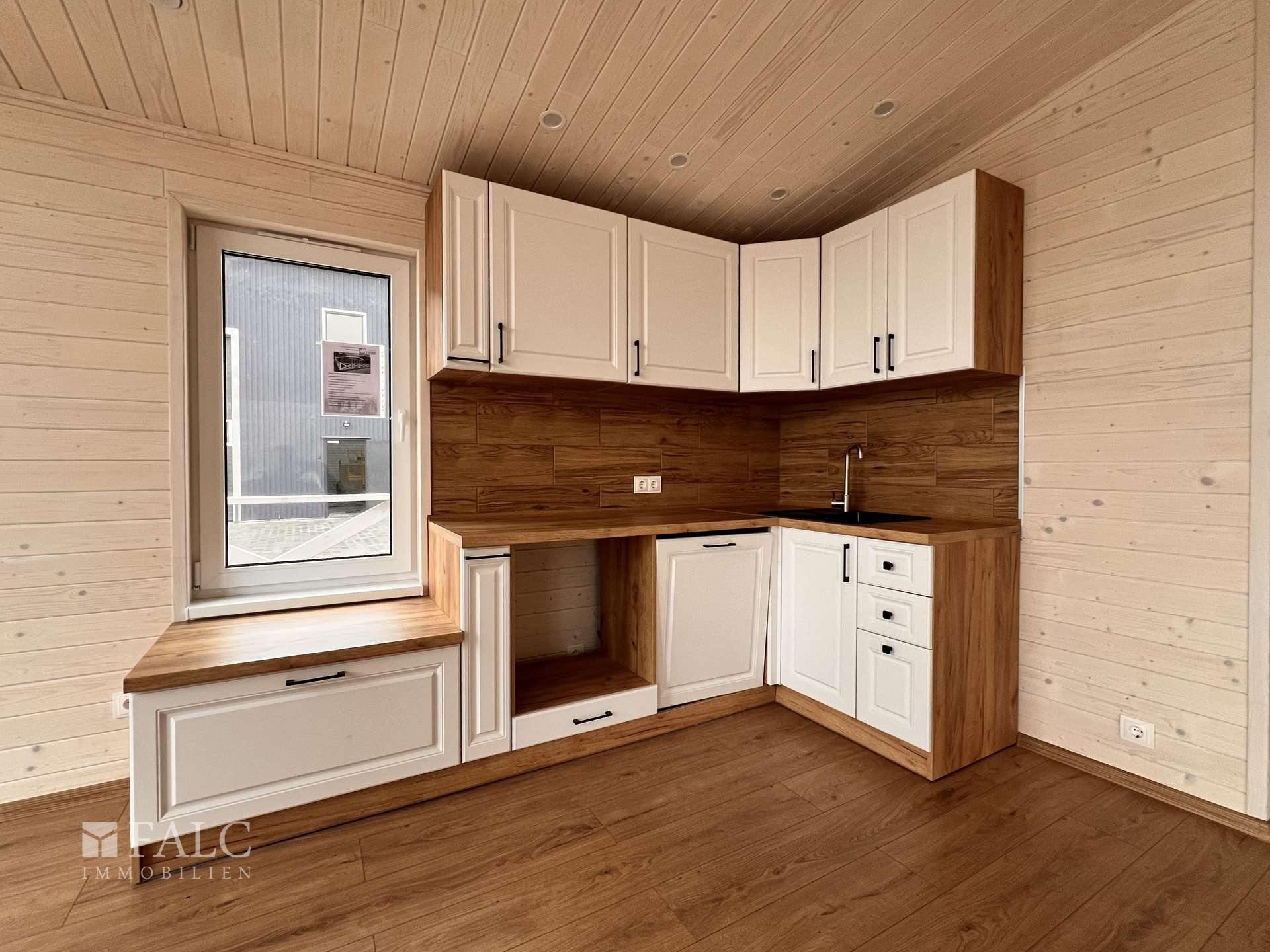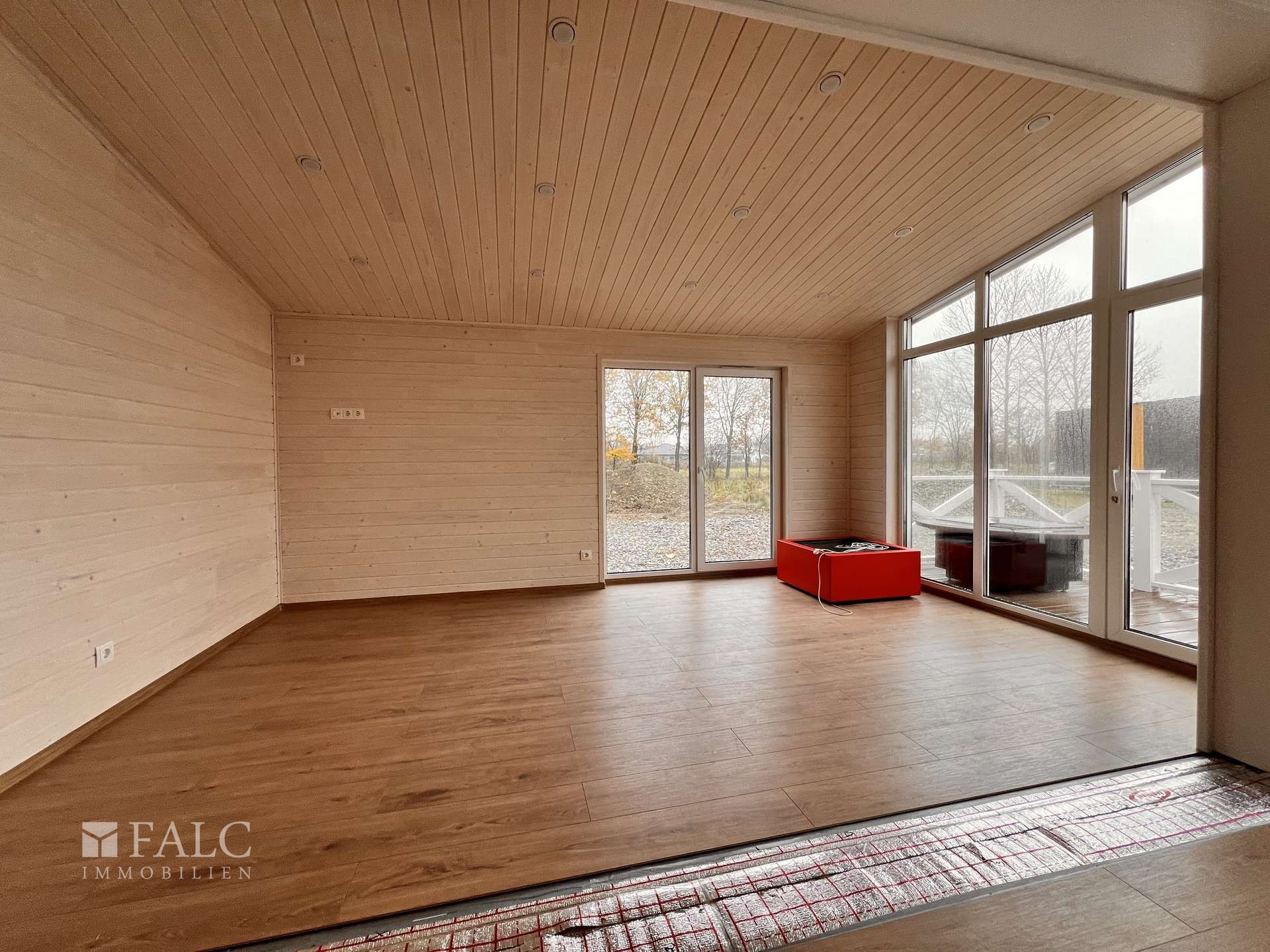 Wohn- und Essbereich mit offener Küche Das Herzstück des Hauses bildet das lichtdurchflutete Wohnzimmer mit integrierter, offener Küche. Bodentiefe Fenster sorgen für ein helles, freundliches Ambiente und ermöglichen den direkten Zugang auf die Terrasse sowie einen herrlichen Blick ins Grüne. Hier verbindet sich stilvolles Wohnen mit Gemütlichkeit – der perfekte Ort zum Kochen, Essen und gemeinsamen Beisammensein.