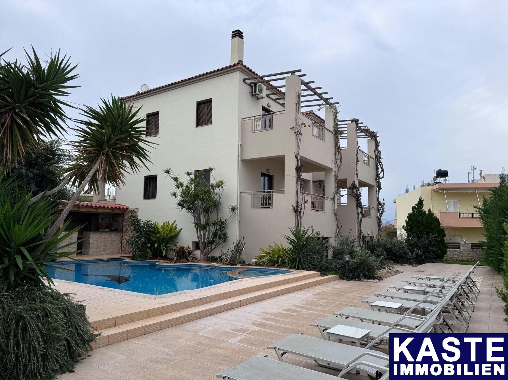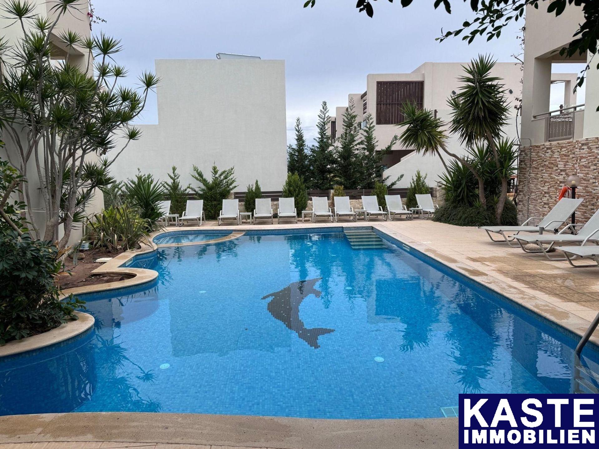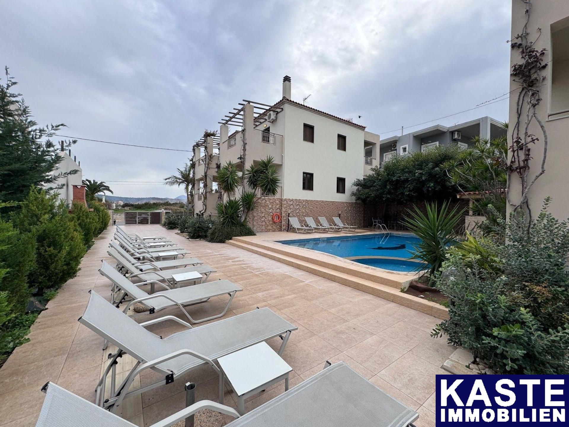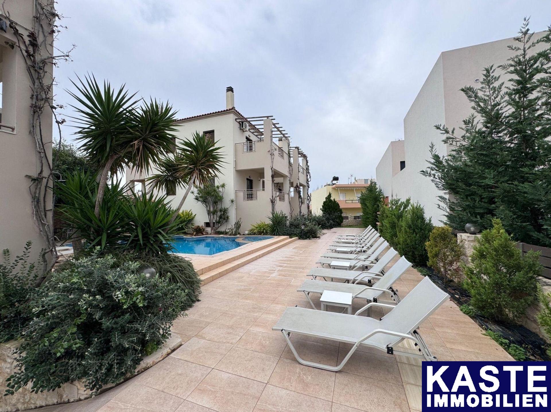Im Außenbereich bietet die Wohnanlage einen gemeinschaftlichen Swimmingpool sowie eine liebevoll angelegte Gartenanlage, die zum Verweilen einlädt. Die privilegierte Lage dieser Immobilie macht sie zu einer herausragenden Investitionsmöglichkeit. Sie vereint ruhigen Luxus mit der unmittelbaren Nähe zum Strand von Skaleta und liegt nur wenige Kilometer von der Stadt Rethymno entfernt.