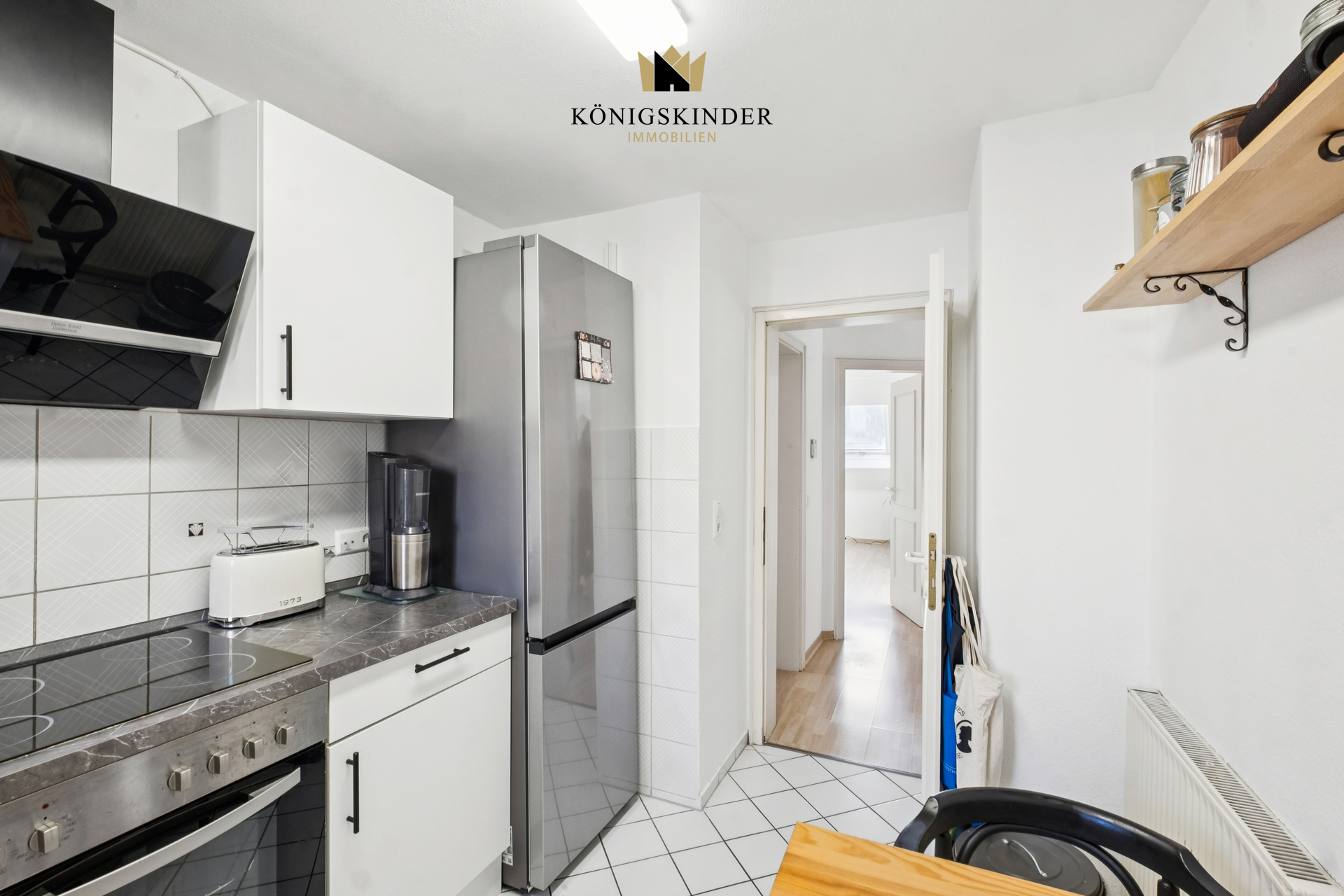 Der großzügige Wohnbereich bildet das Herz der Wohnung – ideal zum Entspannen, Kochen und Zusammensein. Die Küche ist separat gelegen und mit einer Einbauküche ausgestattet.