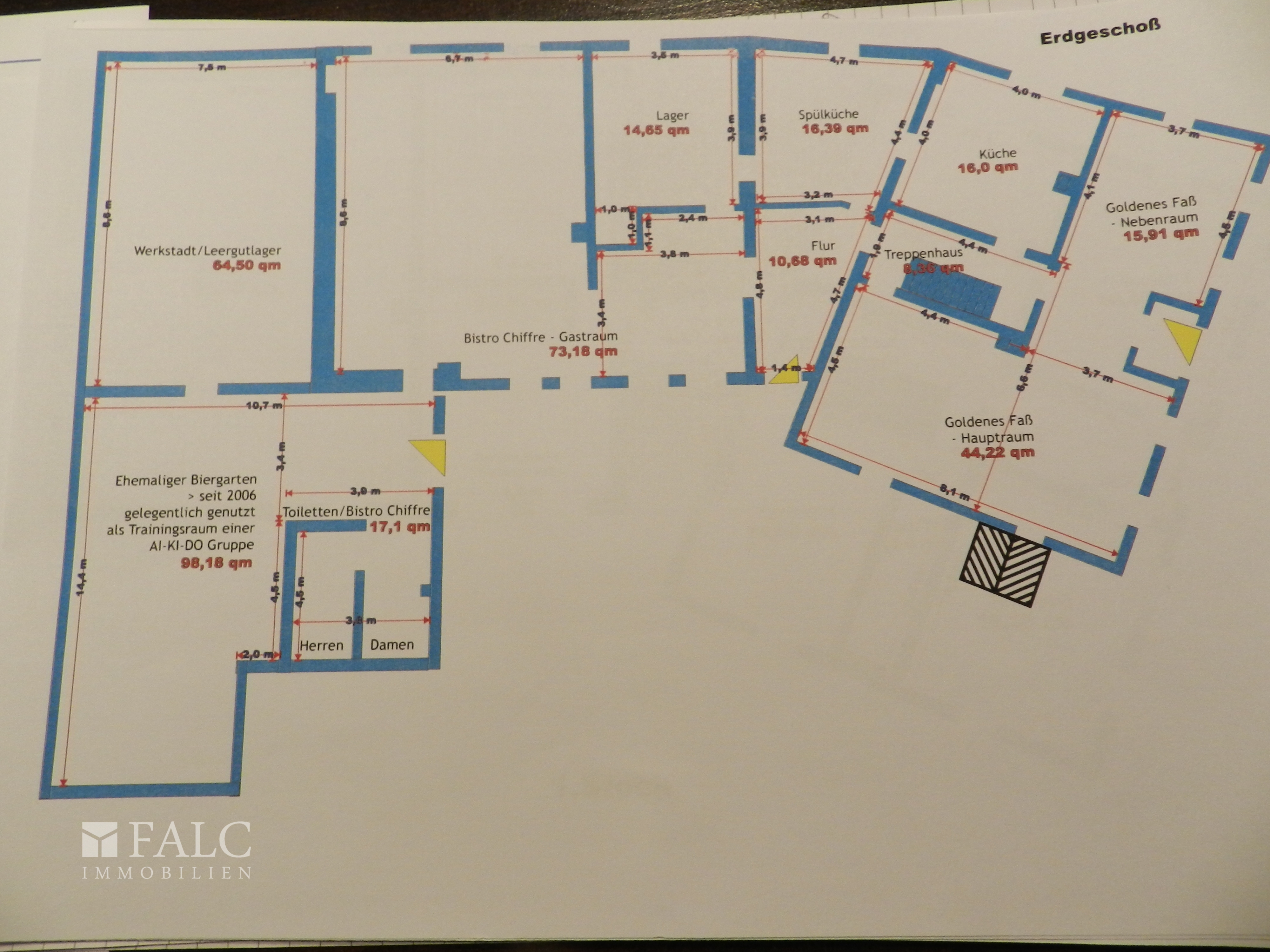 Ausstattung Anschluss an Bistro: 1. Leergutlager/Werkstatt ca. 64² 2. Einstiger Biergarten (seit 2006) 98² 3. Toiletten Bistro für Damen und Herren. und Eingangsbereich zum Gastraum ca. 17²