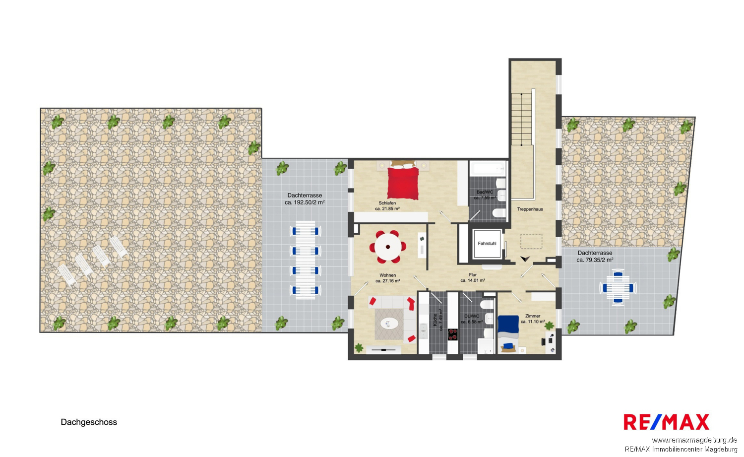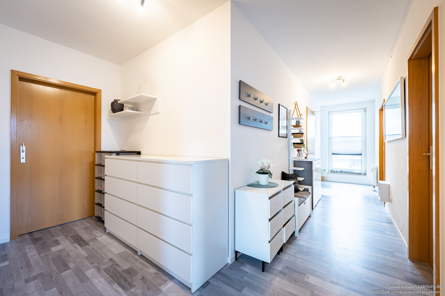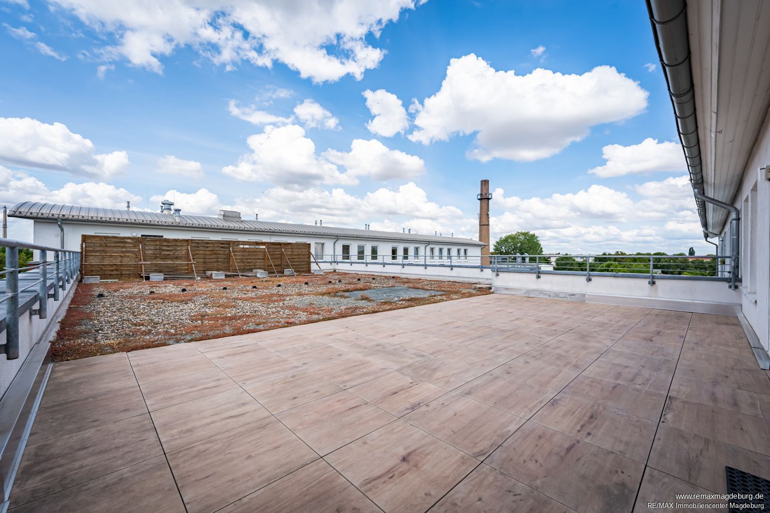 Die Wohnung verfügt über zwei moderne Badezimmer. Eines ist mit einer Dusche ausgestattet, ideal für den schnellen Start in den Tag, während das andere eine Badewanne bietet und vom Schlafzimmer begehbar ist. Ein weiteres Highlight dieser Wohnung ist die zweite ca. 79m² große Terrasse, welche einen spektakulären Blick auf den Magdeburger Dom gewährt – ein echtes Alleinstellungsmerkmal!