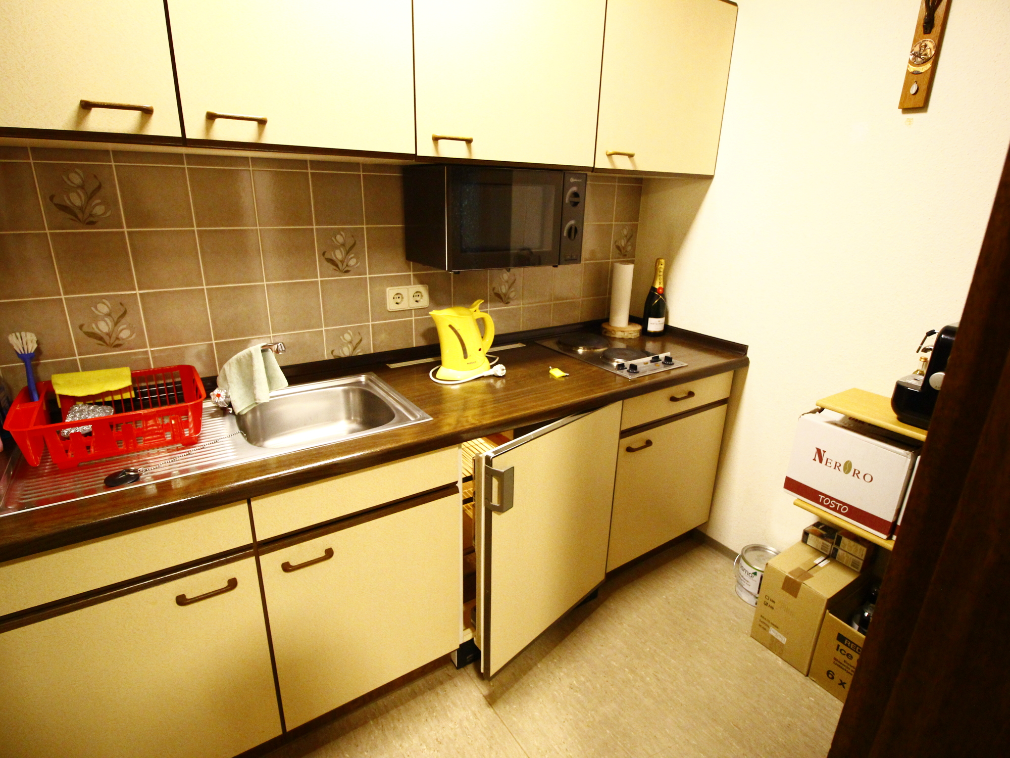 Die separate Küche ist funktional geschnitten und mit einer Einbauküche ausgestattet. Arbeitsflächen und Stauraum sind kompakt angeordnet, so dass der Raum effizient genutzt werden kann.