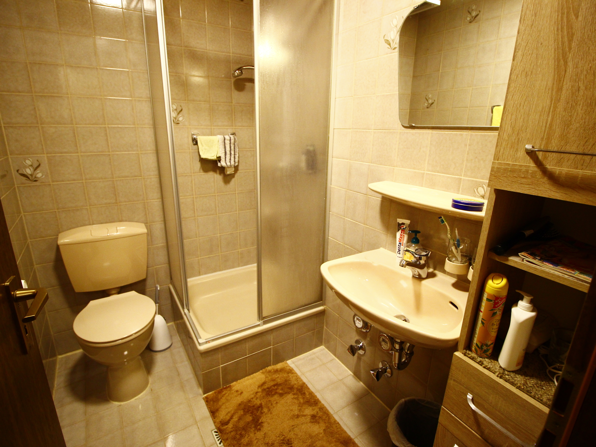 Das Schlafzimmer ist als ruhiger Rückzugsort gut dimensioniert und bietet Platz für ein Bett sowie ergänzende Möbel. Auch hier sorgen Fenster für eine freundliche Atmosphäre. Das Badezimmer ist zeitlos gefliest und verfügt über eine Dusche, WC und Waschbecken.