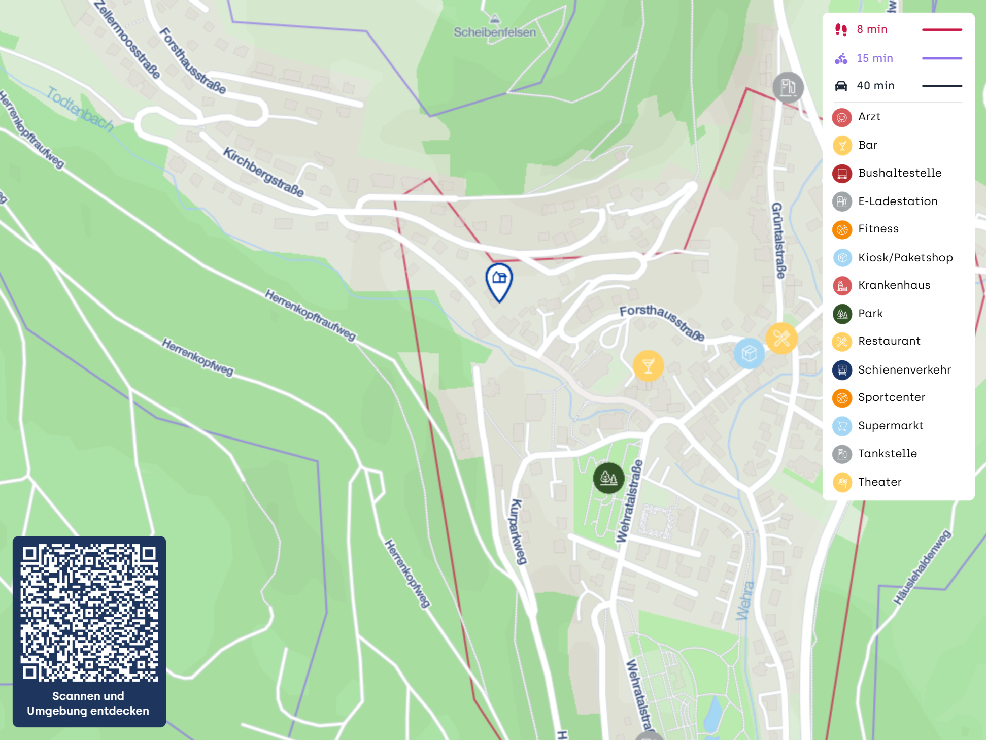 Die Wohnung liegt in Todtmoos in einer angenehm ruhigen, zugleich gut angebundenen Ortslage. Für den Alltag sind kurze Wege gegeben: Ein Supermarkt wie Schmidt’s Edeka ist in der Nähe. Für entspannte Stunden im Grünen bietet sich der Alte Kurpark in der direkten Umgebung an. Die Anbindung an den öffentlichen Nahverkehr ist praktisch: Der Todtmoos Busbahnhof ist ca. 0,5 km entfernt. Für Reisen überregional sind die Flughäfen Basel Mulhouse und Zürich jeweils in etwa einer Stunde mit dem Auto erreichbar. Die Autobahn A5 ist mit dem Auto gut erreichbar. Kulturelle Highlights wie das Besucherbergwerk und das Heimatmuseum sind ebenfalls schnell erreichbar, wie auch viele Ausflugsziele im Schwarzwald. Diese Lage vereinbart naturnahes Wohnen mit guter Erreichbarkeit und Versorgung. Todtmoos ist ein heilklimatischer Kurort und liegt im Süden des Hochschwarzwaldes im oberen Wehratal. Es werden Sommer- wie Winteraktivitäten angeboten. HERZLICH WILLKOMMEN IN TODTMOOS