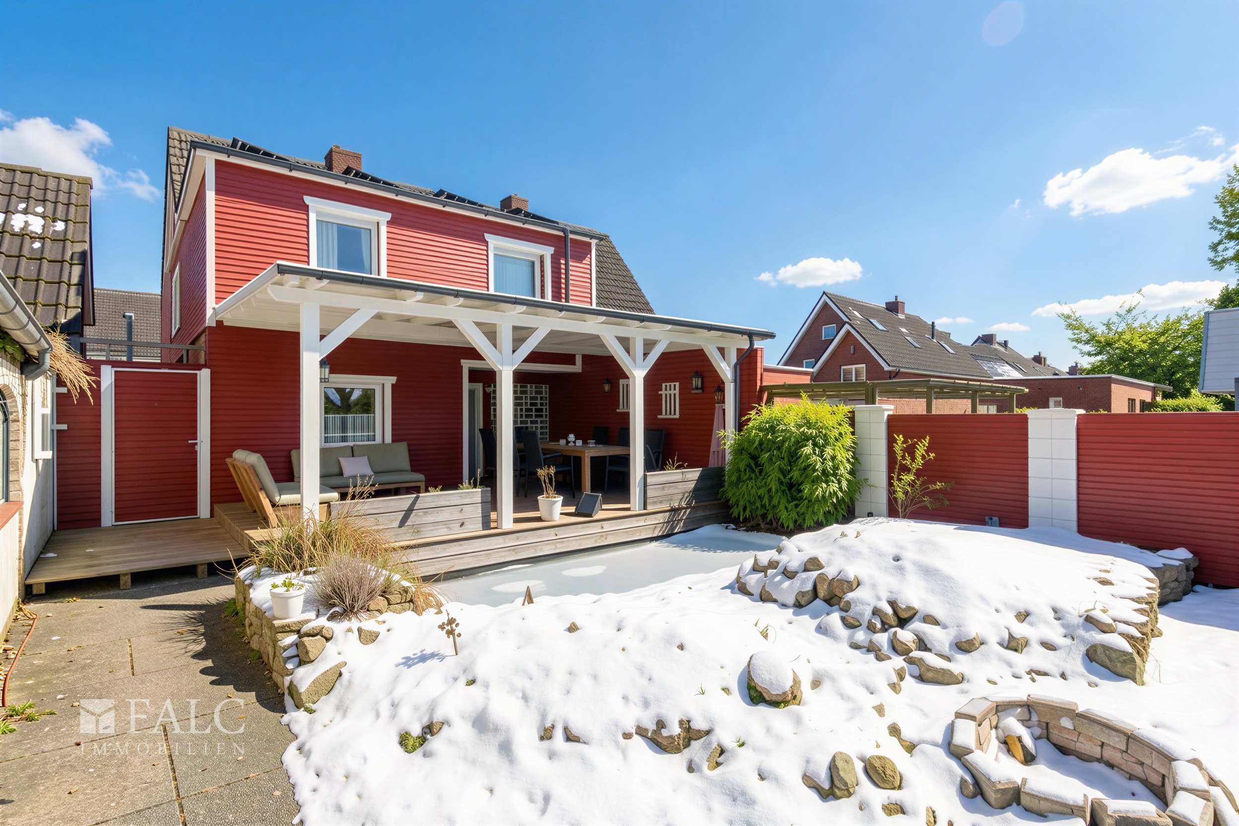 Von der Küche aus führt der Weg weiter in Richtung Außenbereich, wo die große Holzterrasse hinter dem Haus einen klaren Schwerpunkt setzt. Hier entsteht ein geschützter Platz für Mahlzeiten im Freien und ruhige Stunden, begleitet von einem kleinen Teich, der den Bereich optisch gliedert. Der Garten schließt sich großzügig an und bietet mit einem eingefassten Pool eine weitere Nutzungsmöglichkeit, die sich je nach Jahreszeit in den Tagesablauf einbinden lässt. Durch die direkte Anbindung der Terrasse an den Wohnbereich und die Küche wirken Innen und Außen als zusammenhängender Lebensraum, der den Wohnalltag erweitert.