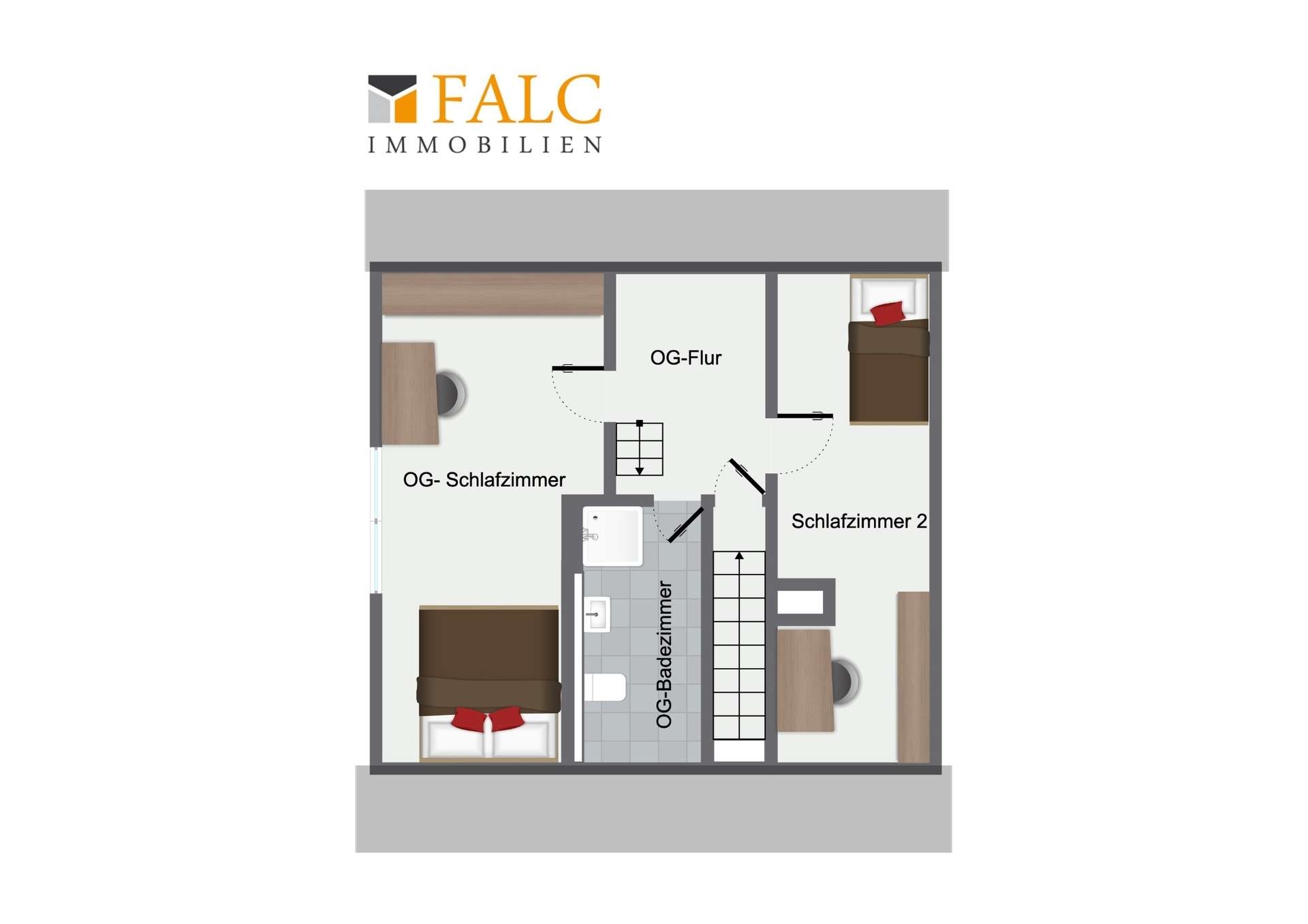 Im Obergeschoss erwarten Sie zwei gut geschnittene Schlafzimmer, die vielfältige Nutzungsmöglichkeiten eröffnen – ob als Elternschlafzimmer, Kinderzimmer oder Homeoffice. Das moderne Badezimmer mit Dusche sorgt auf dieser Etage für zusätzlichen Komfort. Über eine Treppe im Flur gelangen Sie zudem auf den Dachboden, der zusätzlichen Stauraum bietet.