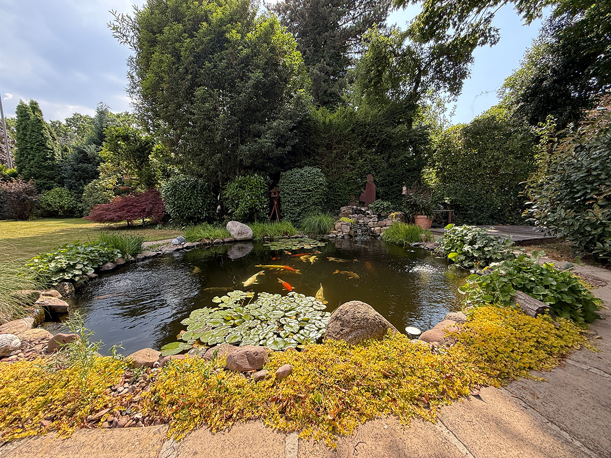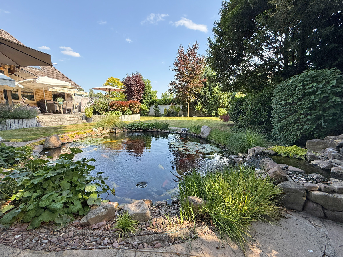 Besonderes Highlight ist das liebevoll angelegte 882 m² große Grundstück mit Teich, Bachlauf, großer Terrasse und sonniger Ausrichtung. Zwei Garagen, ein Carport und weitere Stellplätze runden das Angebot ab. Die Terrasse sowie die Hoffläche wurden vor rund 8 Jahren neu gestaltet.