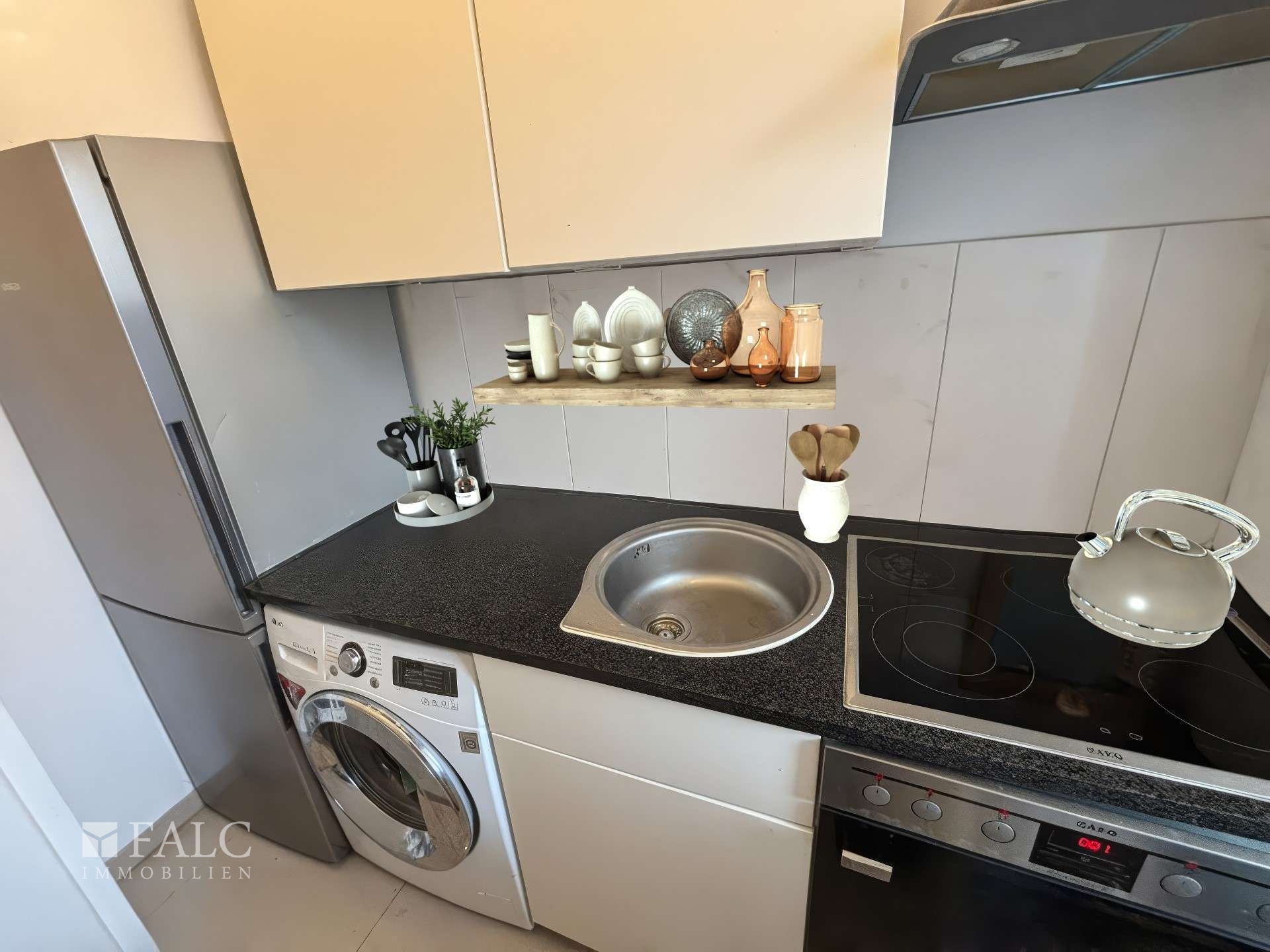 Die Küche ist funktional gestaltet und bietet alles, was Sie für die Zubereitung Ihrer Mahlzeiten benötigen. Sie ist geschickt in den Wohnbereich integriert und ermöglicht so eine offene Gestaltung, die den Raum optisch vergrößert.
