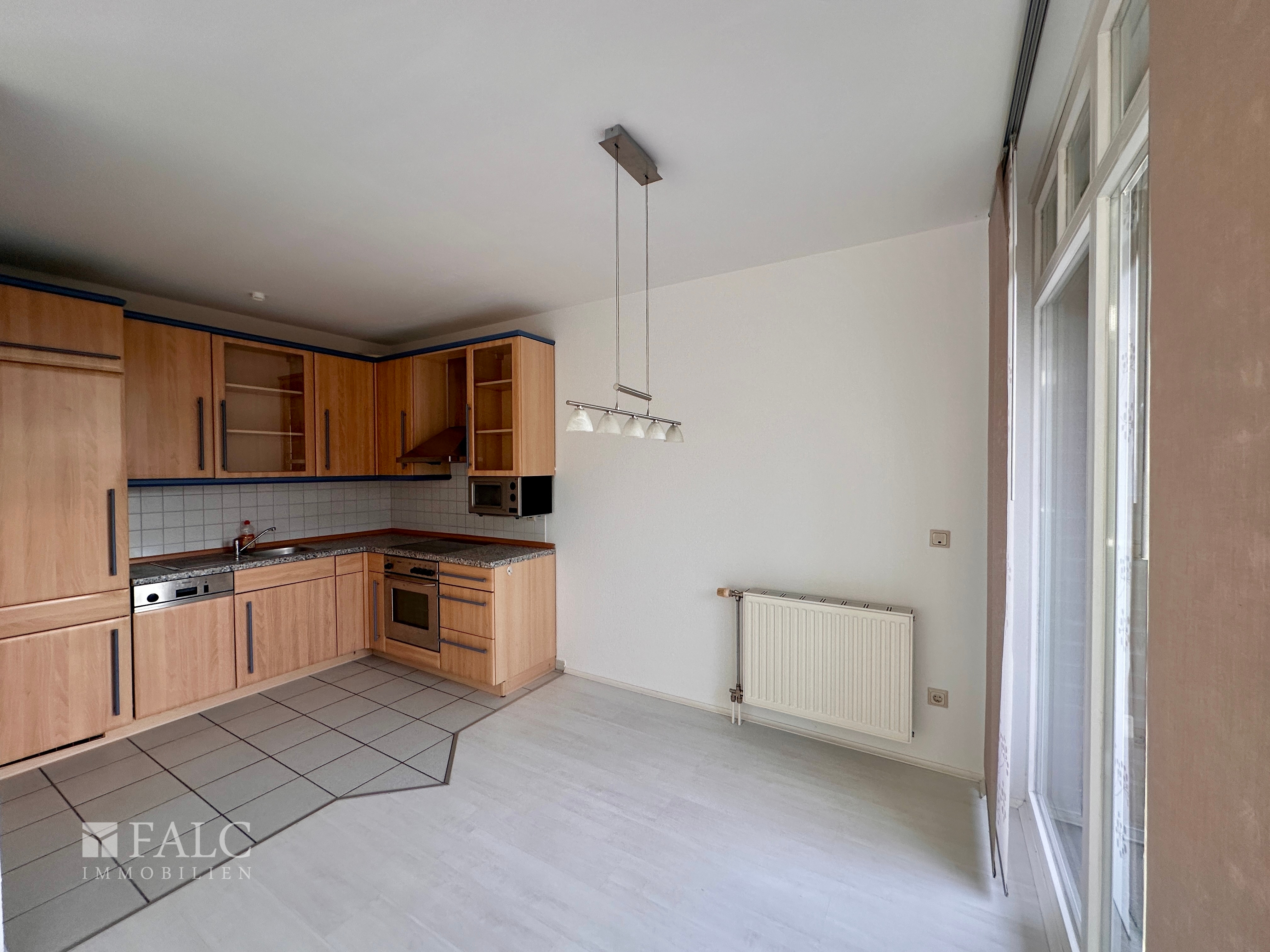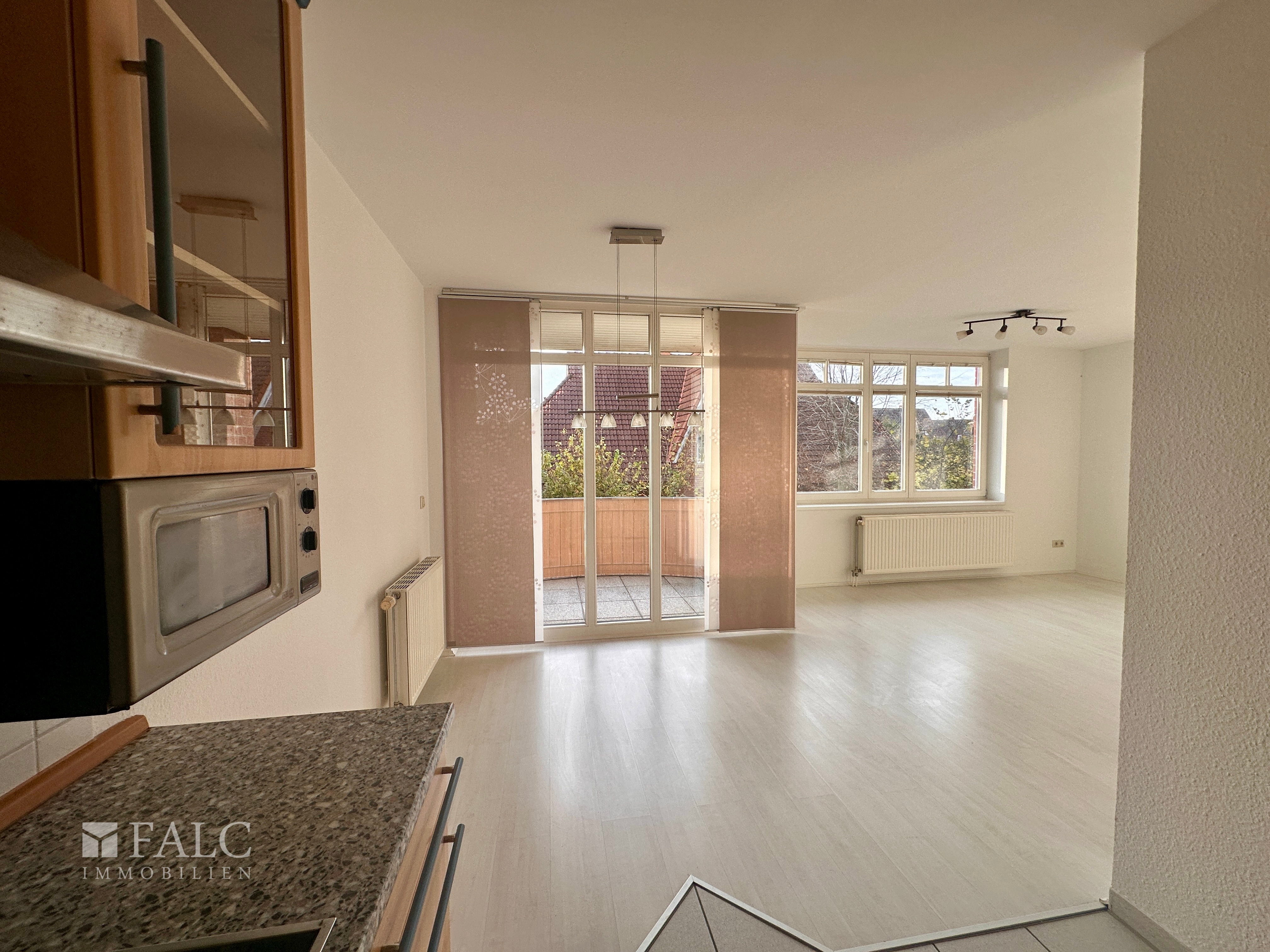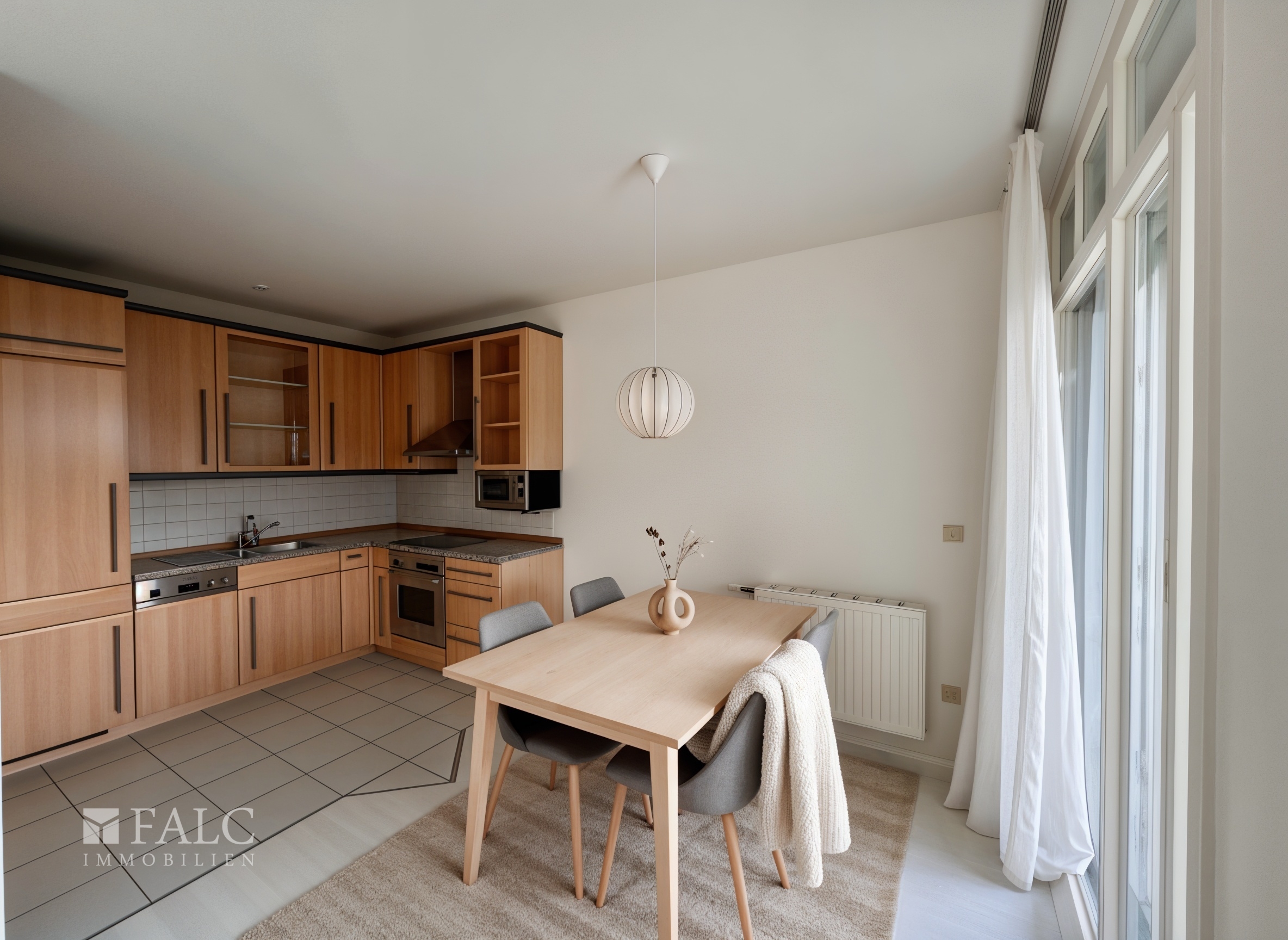 Die Immobilie verfügt über insgesamt drei Zimmer. Das großzügige und helle Wohnzimmer mit seiner offenen Küche lädt Sie zu gemütlichen Stunden ein. Von hier gelangen Sie auf den sonnigen Balkon mit Blick ins Grüne, auf dem Sie wunderbar die Seele baumeln lassen können. In der offenen und zeitlosen Küche mit Einbauküche haben Sie die Möglichkeit gesellige Kochabende zu genießen. Hier findet auch Ihr Esstisch samt Stühlen Platz. Nach einem ausgefüllten Tag lässt sich der Feierabend hier gut einleiten.