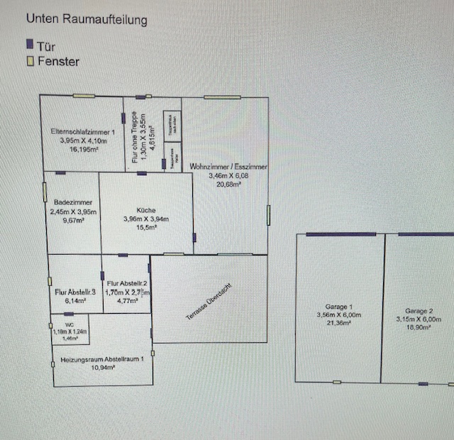 Eingang Flur: ca. 4,61m² Elternschlafzimmer: ca. 16,19m² Badezimmer: ca. 9,67 m² Küche: ca. 15,50 m² Wohn- Esszimmer: ca. 20,68 m² HWR: ca. 6,14 m² Flur Rückseite: ca. 4,77 m² Gäste WC: ca. 1,46 m² Heizungsraum: ca. 10,95 m²