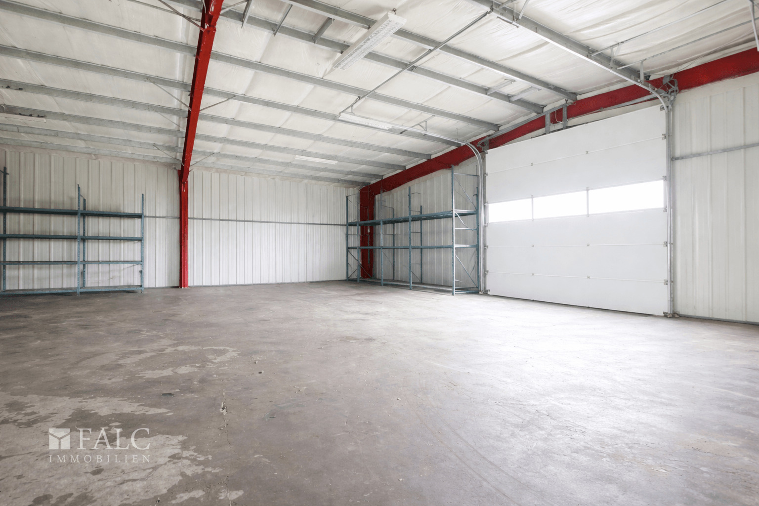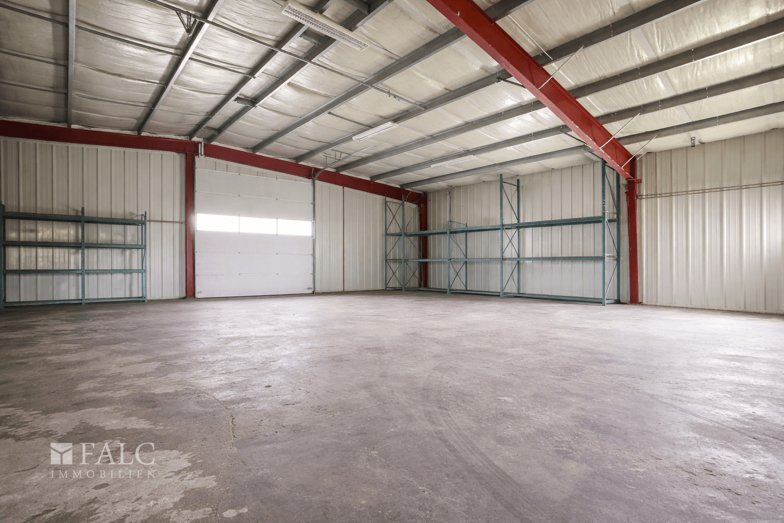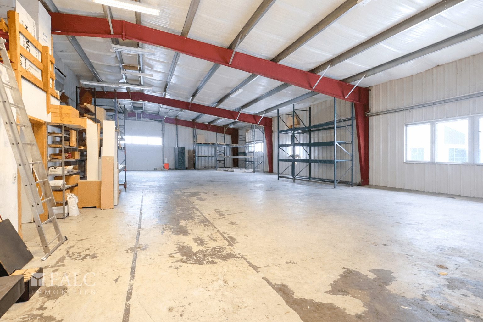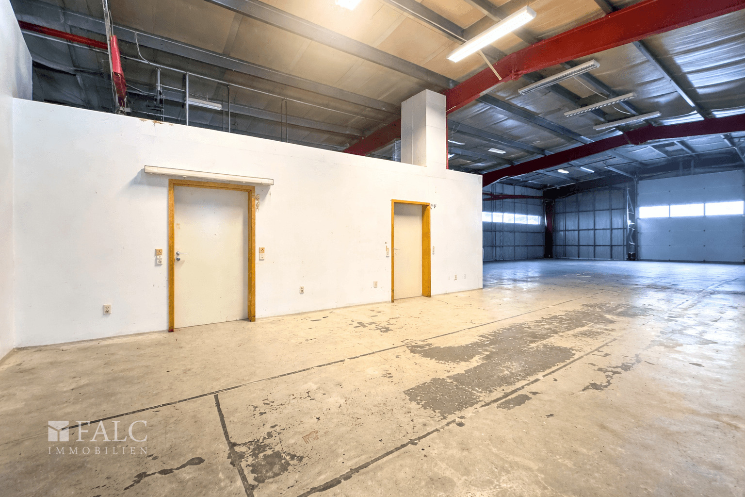 Ein wesentlicher Bestandteil des Objekts ist die großzügige, L-förmig geschnittene Lagerhalle. Diese ist sowohl direkt vom Bürobereich aus zugänglich als auch separat über ein Rolltor von außen erreichbar, was eine komfortable Warenanlieferung und effiziente Logistikabläufe ermöglicht. Innerhalb der Hallenfläche befinden sich zudem zwei separate Lagerräume, die sich ideal als abgeschlossene Lager- oder Materialbereiche nutzen lassen.