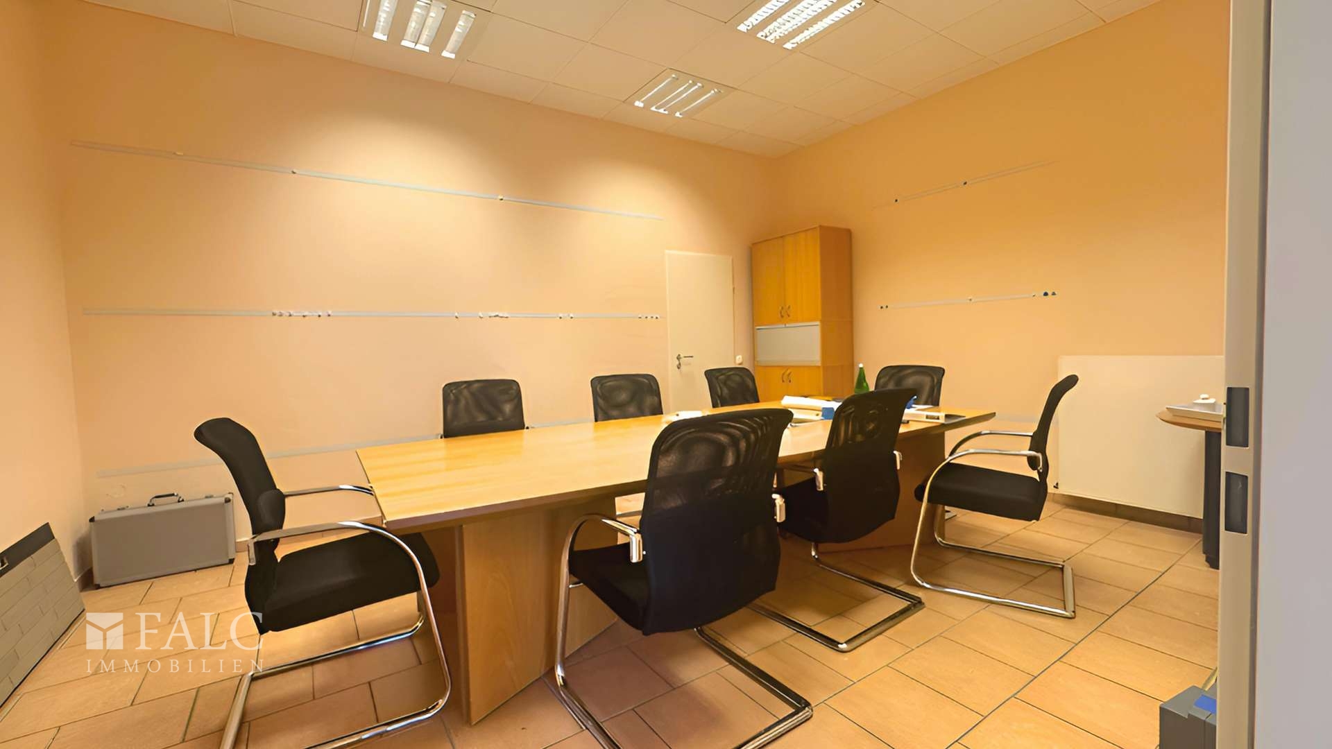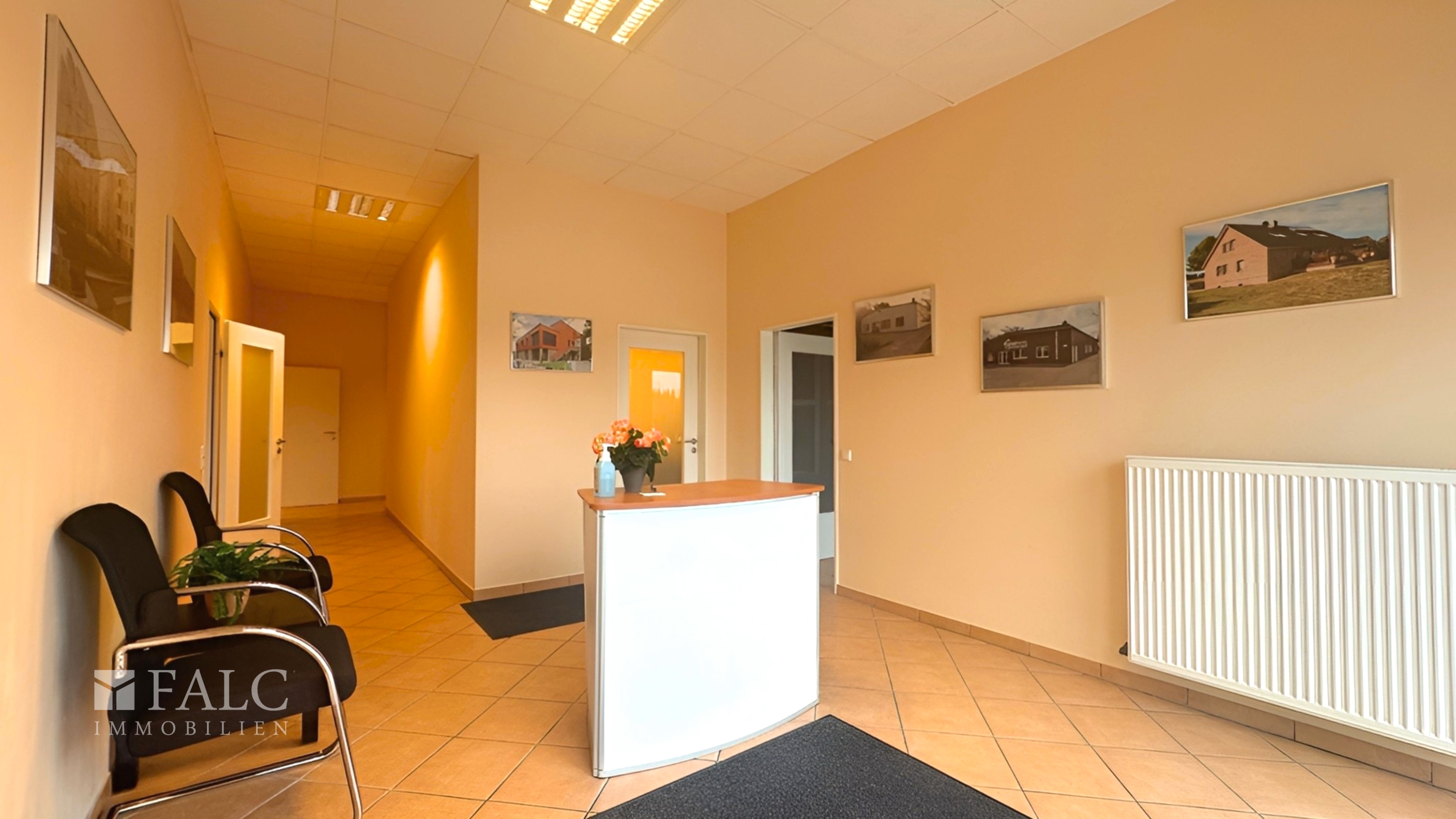 Der Zugang zum Gebäude erfolgt über einen Empfangs- bzw. Flurbereich, der als zentrale Verteilstelle innerhalb des Bürotraktes dient. Von hier aus sind alle Räume bequem erreichbar. Insgesamt stehen neun Räume zur Verfügung, die aktuell unterschiedlich genutzt werden. Vier Räume dienen als Büroräume, ein Raum wird als Besprechungs- bzw. Versammlungsraum genutzt und vier weitere Räume fungieren als Ausstellungsflächen. Durch zusätzliche Verbindungstüren zwischen den einzelnen Räumen sind eine flexible Nutzung sowie kurze interne Wege gewährleistet.