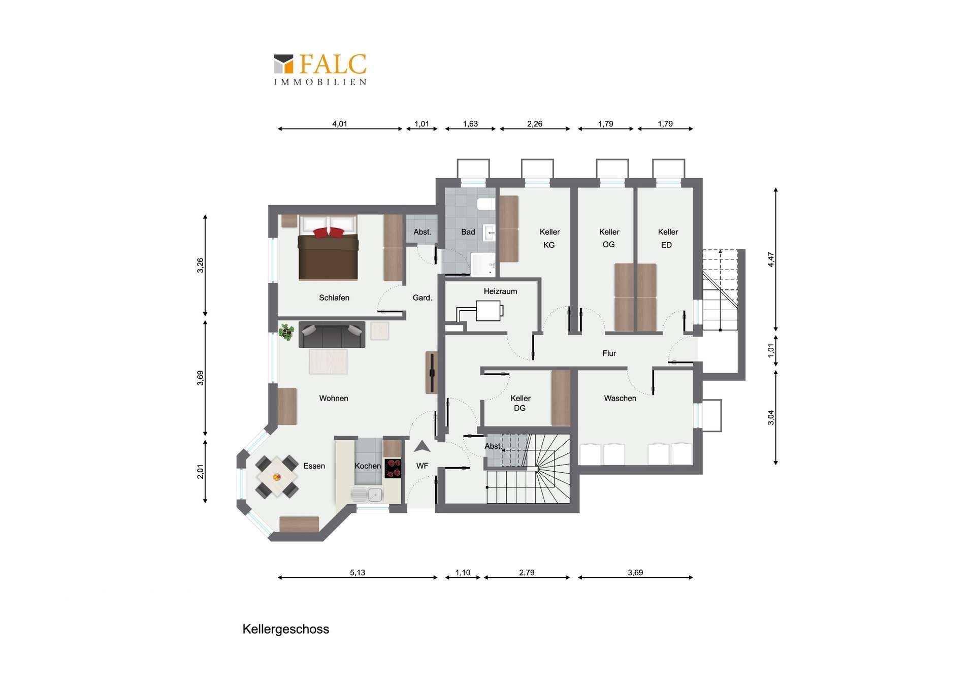 Die Wohnung im Dach- und Kellergeschoss sind ähnlich aufgeteilt. Sie haben jedoch jeweils nur ein Schlafzimmer.