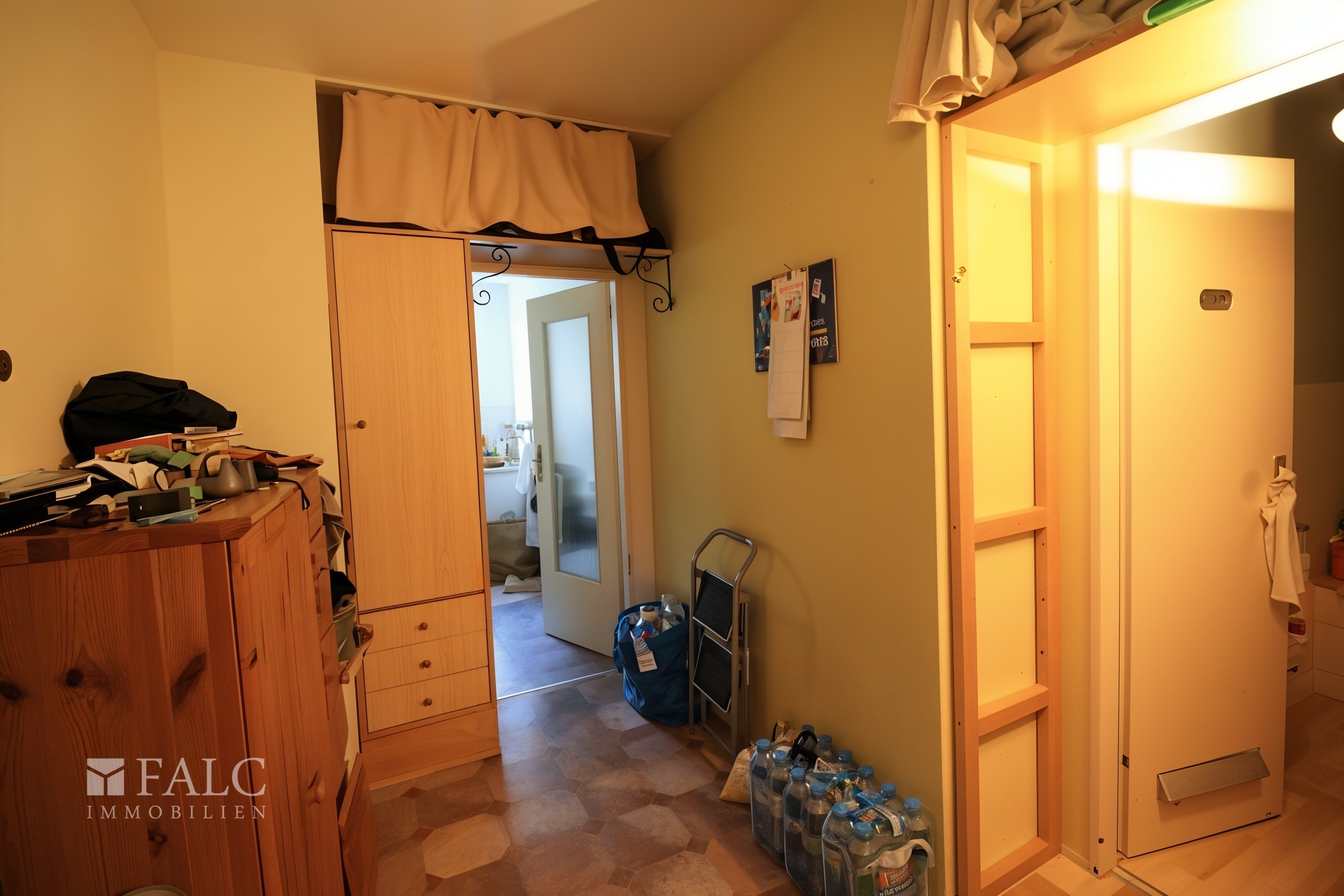 Flur mit ausreichend Stellflächen, Küche mit Einbauschränken, Bad mit Toilette, Handwaschbecken und Badewanne. Heller Wohn-Schlafbereich mit tollem Balkon.