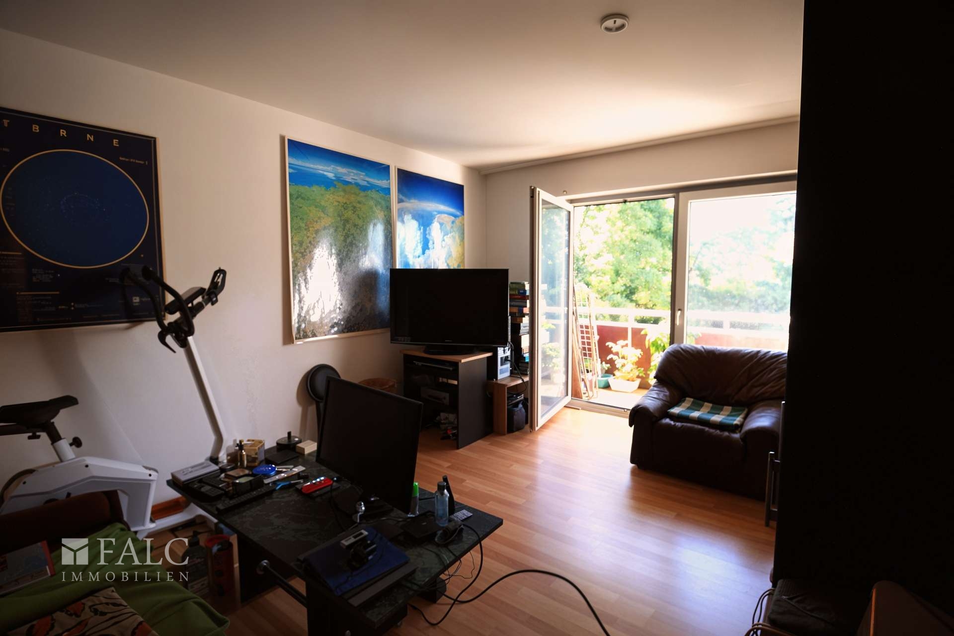 Weiter geht es in das großzügige Wohn- und Schlafzimmer, das durch seine flexible Nutzung besticht. Große Fenster lassen viel Licht herein und bieten einen Blick auf den Balkon. Der Raum ist so geschnitten, dass er sowohl als gemütlicher Wohnbereich als auch als Schlafbereich genutzt werden kann.