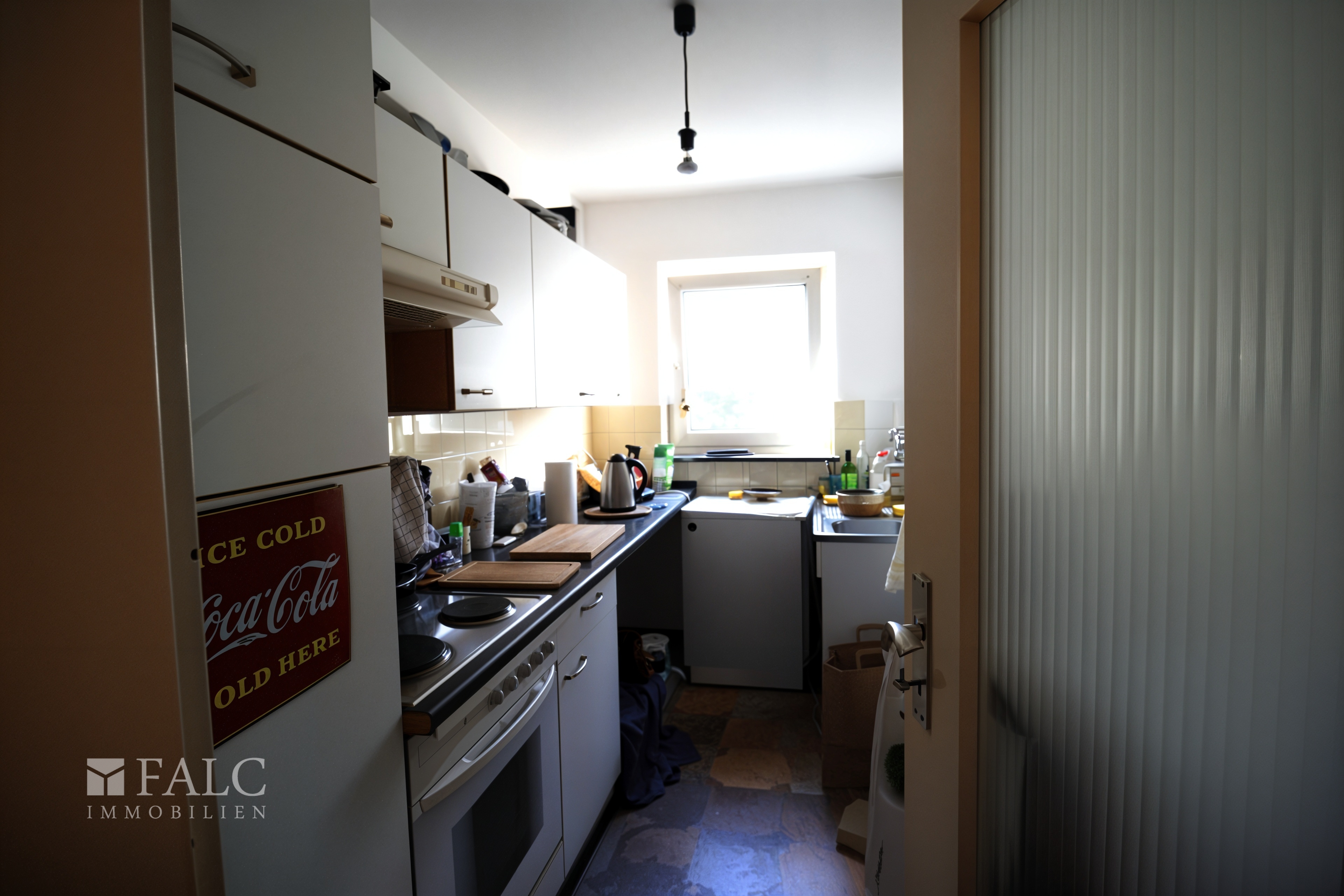 Gegenüber vom Eingang befindet sich die Küche, die mit einer Küchenzeile ausgestattet ist und über ein Fenster verfügt, das für ausreichend Tageslicht sorgt.