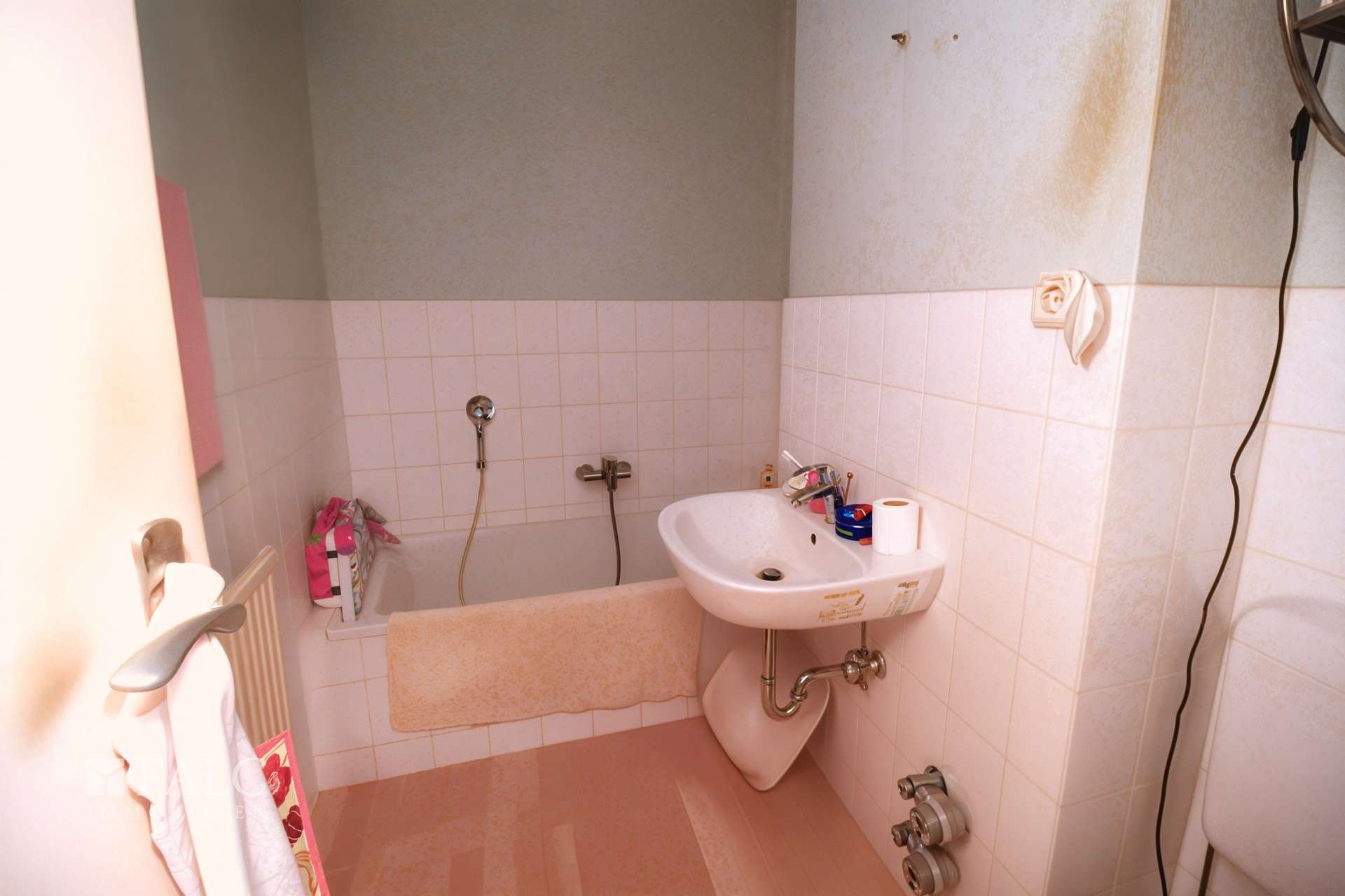 Rechts vom Eingang, direkt über den praktischen Flur gelangen sind in das Badezimmer. Es ist funktional gestaltet und mit einer Badewanne ausgestattet, die zum Entspannen einlädt. Die hellen Fliesen verleihen dem Raum eine freundliche Atmosphäre.