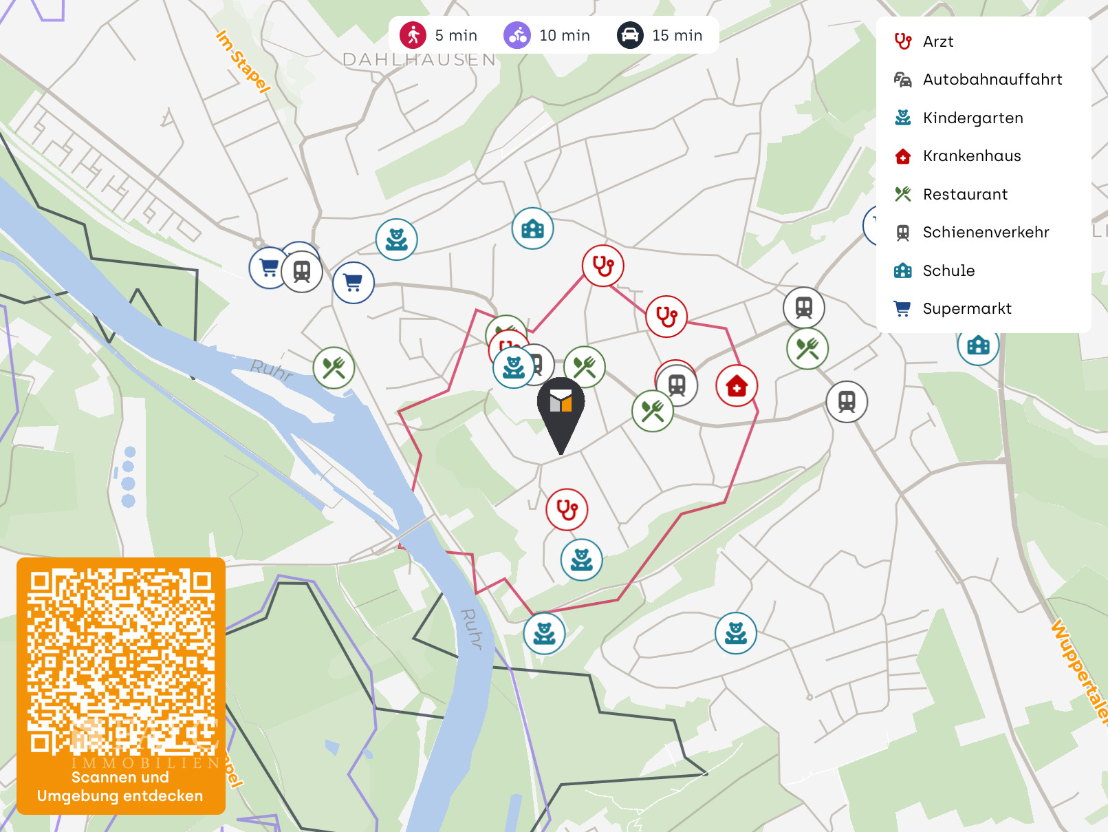 Ein besonderes Highlight der Lage ist die fußläufige Nähe zur Ruhr. In nur wenigen Minuten erreicht man die naturnahen Wege entlang des Flussufers – ideal für Spaziergänge, Joggingrunden, Fahrradtouren oder einfach zum Entspannen im Grünen. Diese direkte Nähe zu Natur und Wasser sorgt für eine hohe Lebensqualität und macht die Wohnlage besonders reizvoll.