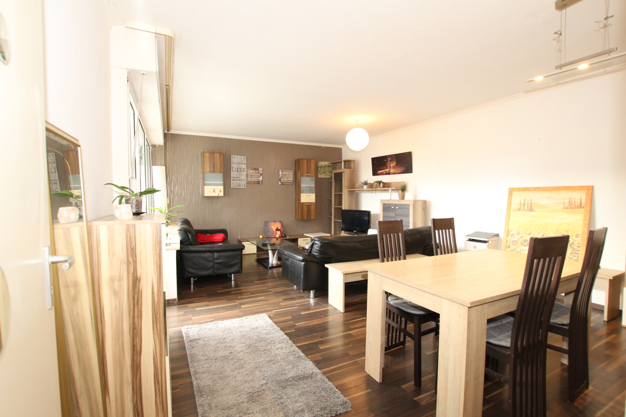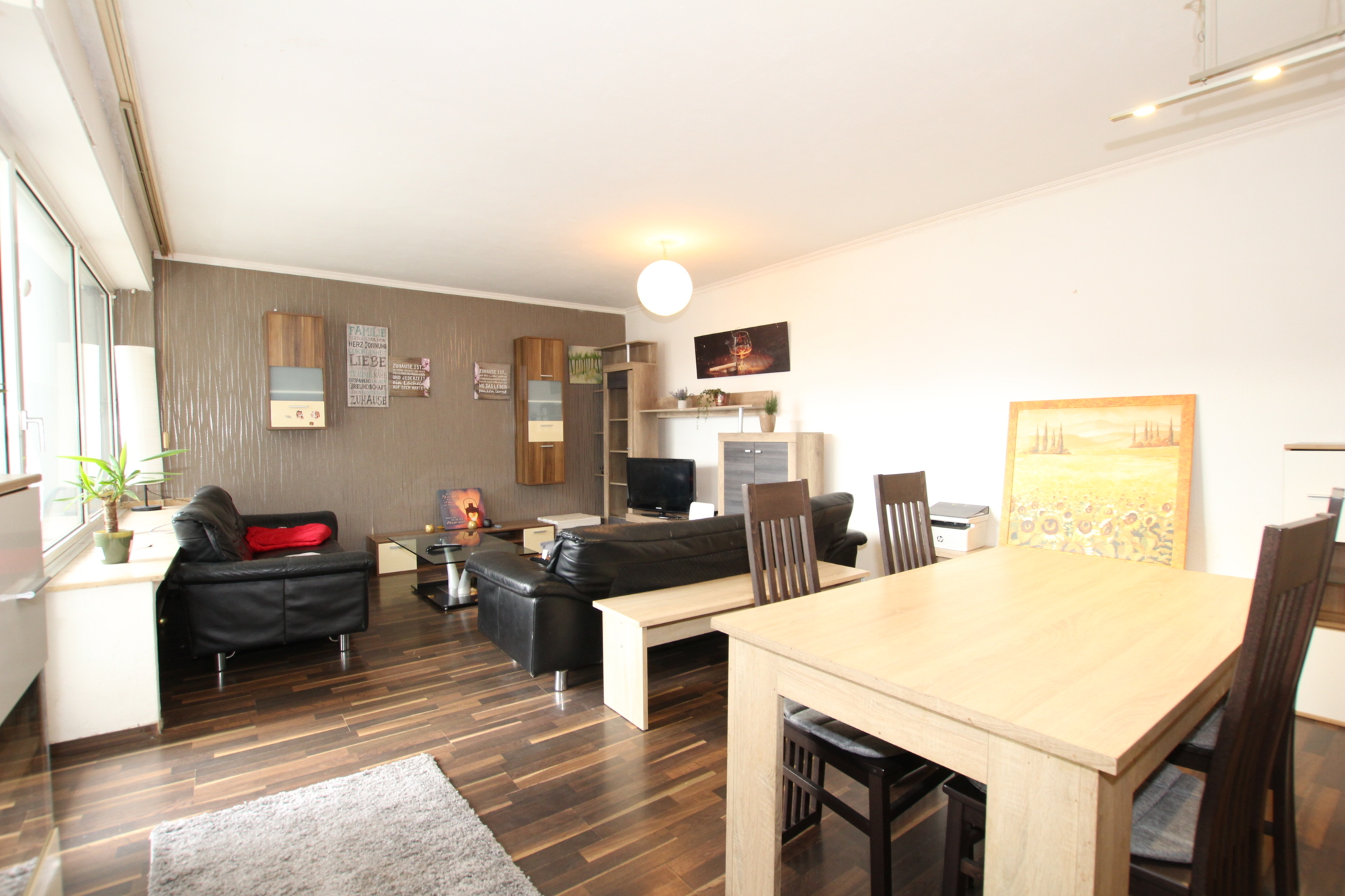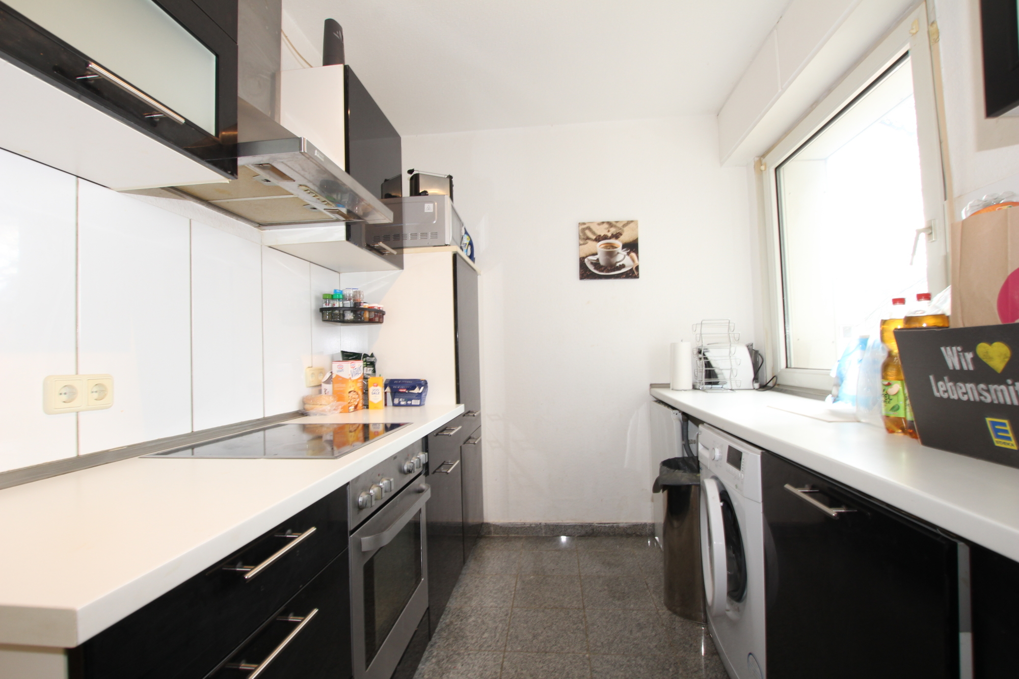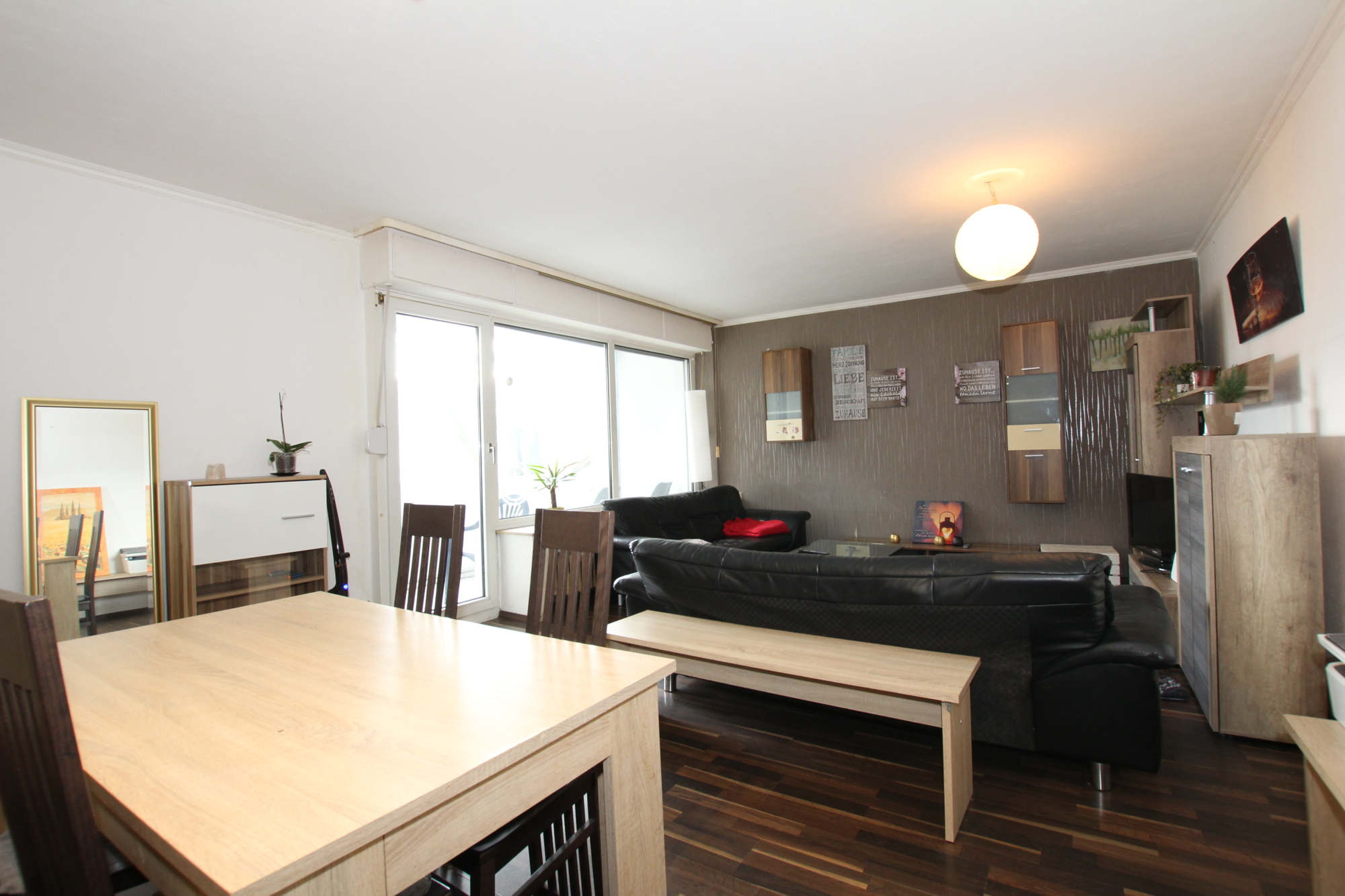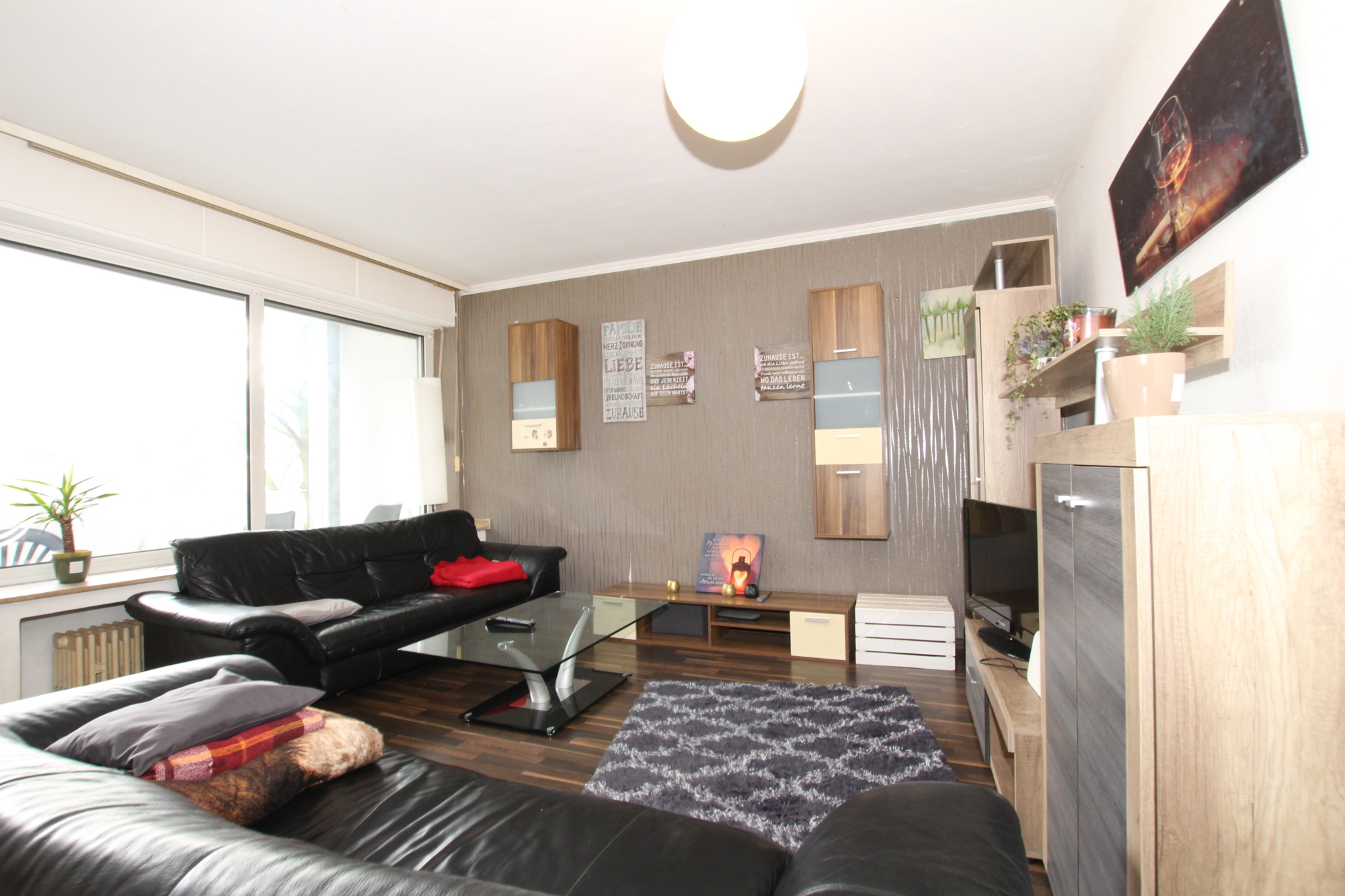 Die Aufteilung selbst gestaltet sich wie folgt: Vom Flur aus erreichen Sie alle Zimmer. Das große Wohnzimmer mit integriertem Essbereich, das viel Platz für gemütliche Stunden und gesellige Abende bietet. Von hier aus haben sie einen direkten Zugang auf den Balkon, hier lässt sich sowohl der Frühstückskaffee genießen, während man in die Sonne blinzelt als auch am Abend die Freunde bei einem Glas kalten Veltins empfangen. Die Küche ist inklusive Waschmaschine, Spülmaschine und Elektrogeräten voll ausgestattet. Ferner steht Ihnen ein Tageslichtbad mit Badewanne, WC und Waschbecken das für Wohlfühlmomente sorgt zu Verfügung. Das Schlafzimmer, bietet ausreichend Platz für ein großes Bett und einen geräumigen Kleiderschrank. Ein Abstellraum verschafft zusätzlichen Stauraum.