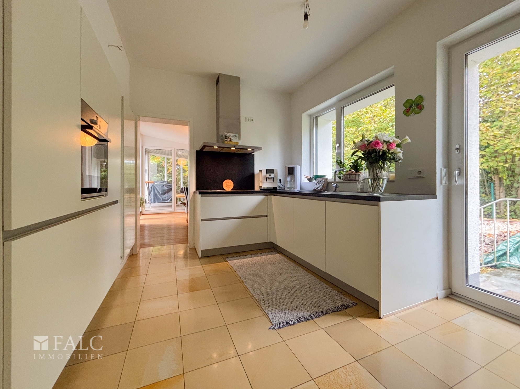 Die Küche ist funktional gestaltet und bietet ausreichend Arbeitsfläche sowie Stauraum. Sie ist der ideale Ort, um kulinarische Köstlichkeiten zuzubereiten. Von hier aus gelangen Sie direkt auf die Terrasse, die sich perfekt für sommerliche Grillabende eignet.
