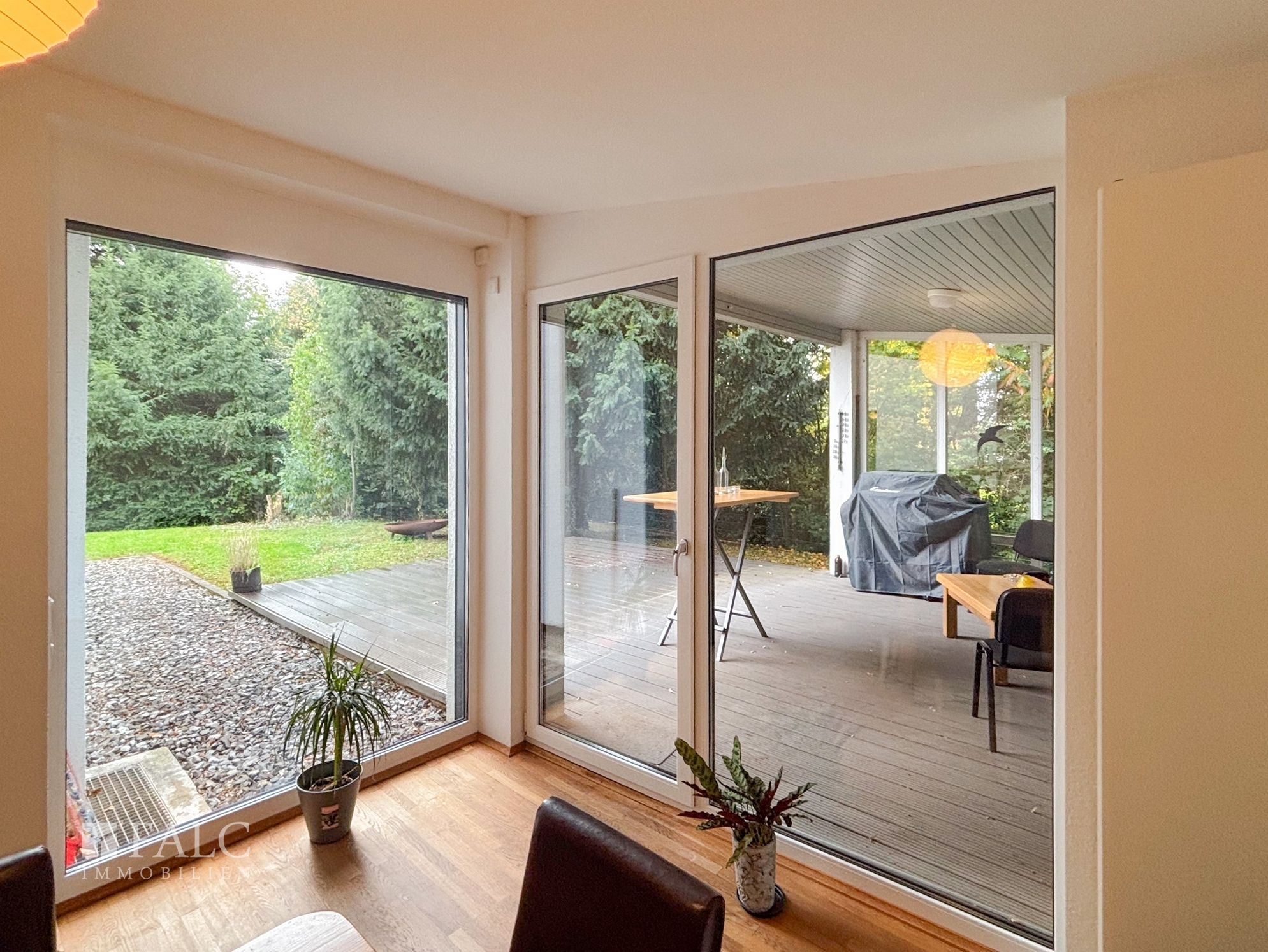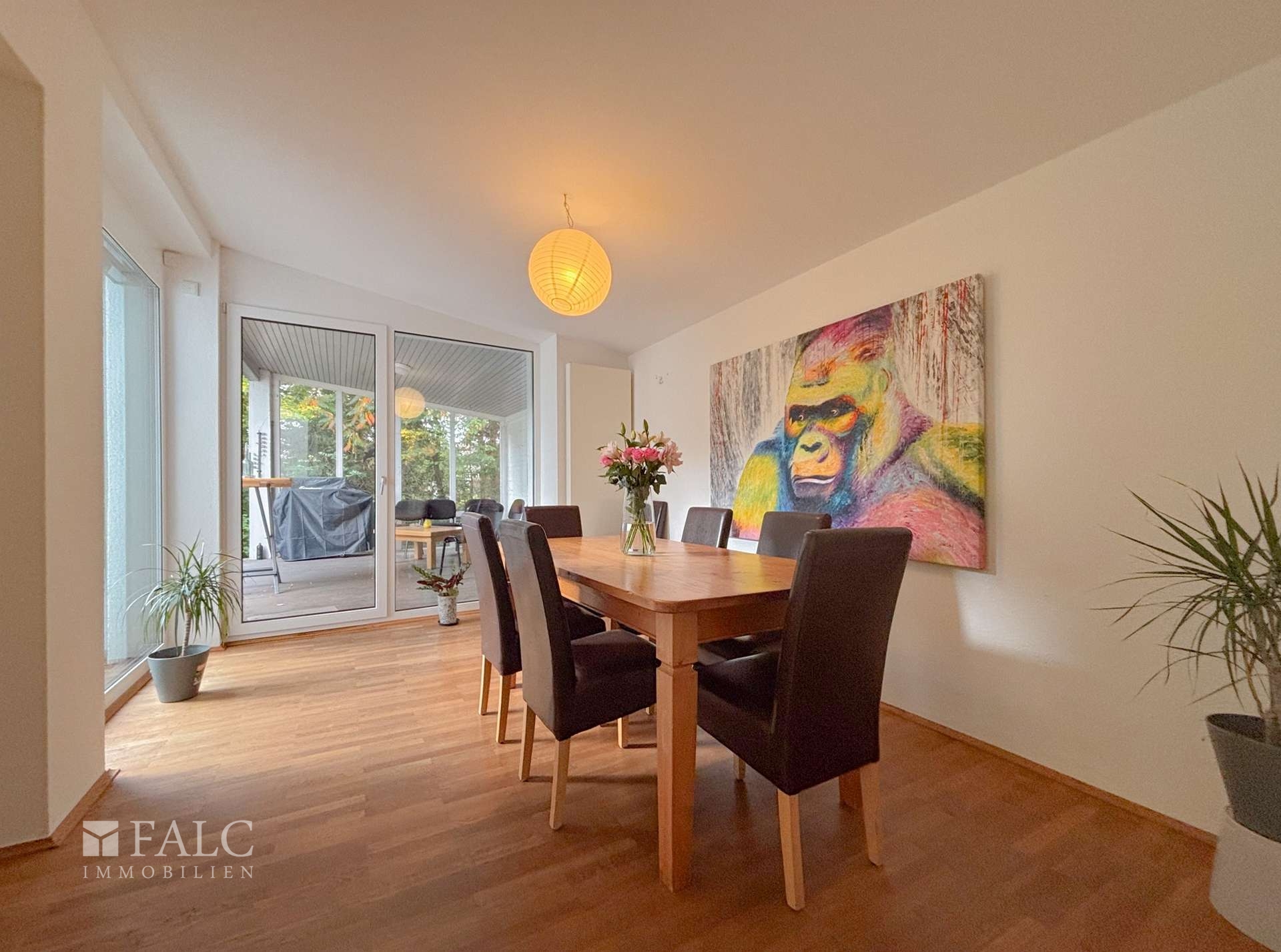 Das Herzstück des Hauses bildet das helle Wohnzimmer, das durch große Fenster viel Tageslicht hereinlässt und einen direkten Zugang zum Garten bietet. Hier können Sie entspannte Stunden mit der Familie verbringen oder Gäste empfangen. Angrenzend befindet sich der Essbereich, der ebenfalls viel Platz für gemeinsame Mahlzeiten bietet.