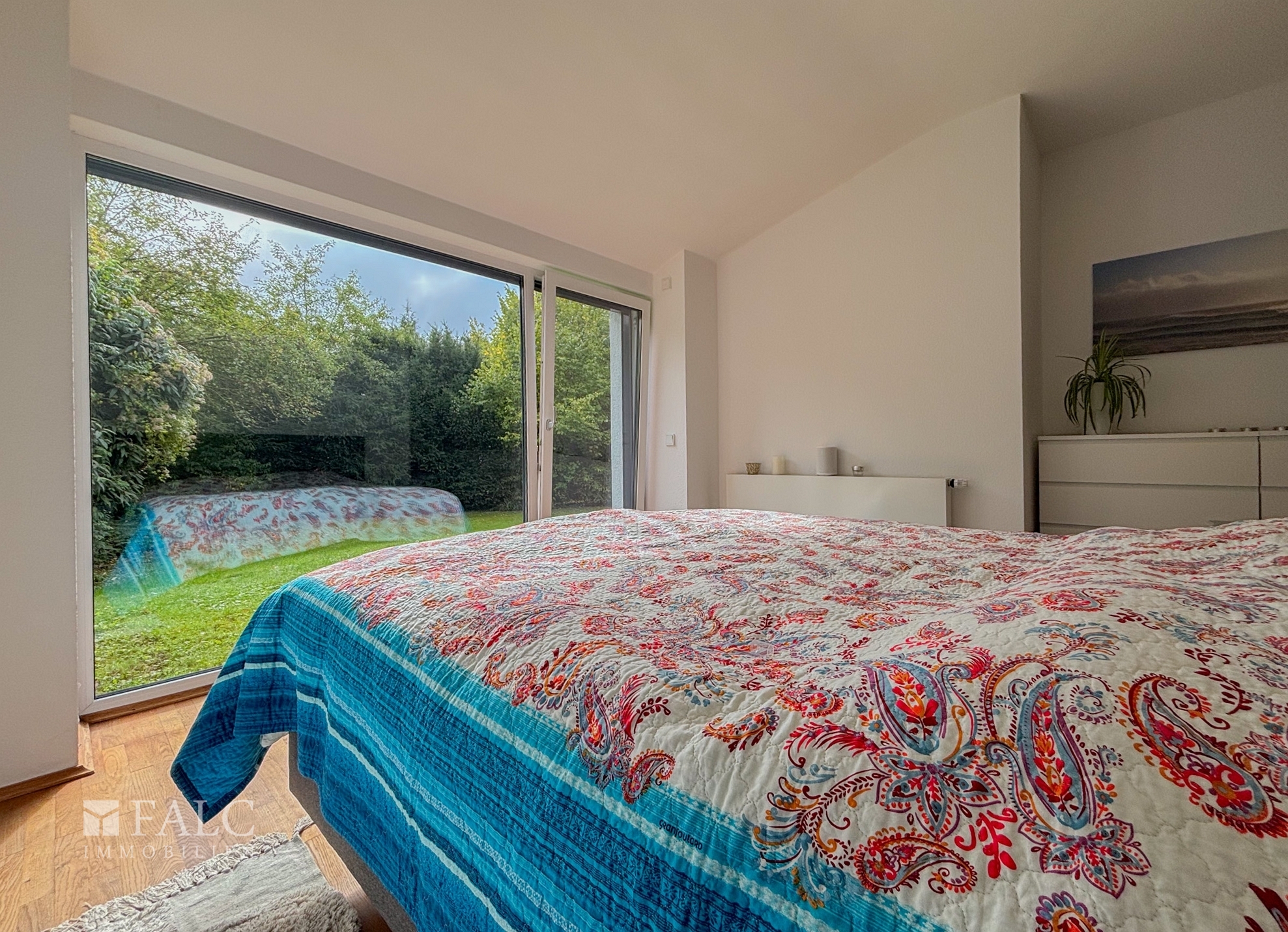 Das Haus verfügt über drei Schlafzimmer, die individuell gestaltet werden können. Jedes Zimmer bietet einen Blick ins Grüne und sorgt für eine ruhige Atmosphäre. Das Badezimmer ist modern ausgestattet und bietet sowohl eine Badewanne als auch eine Dusche. Zusätzlich gibt es ein praktisches Gäste-WC.