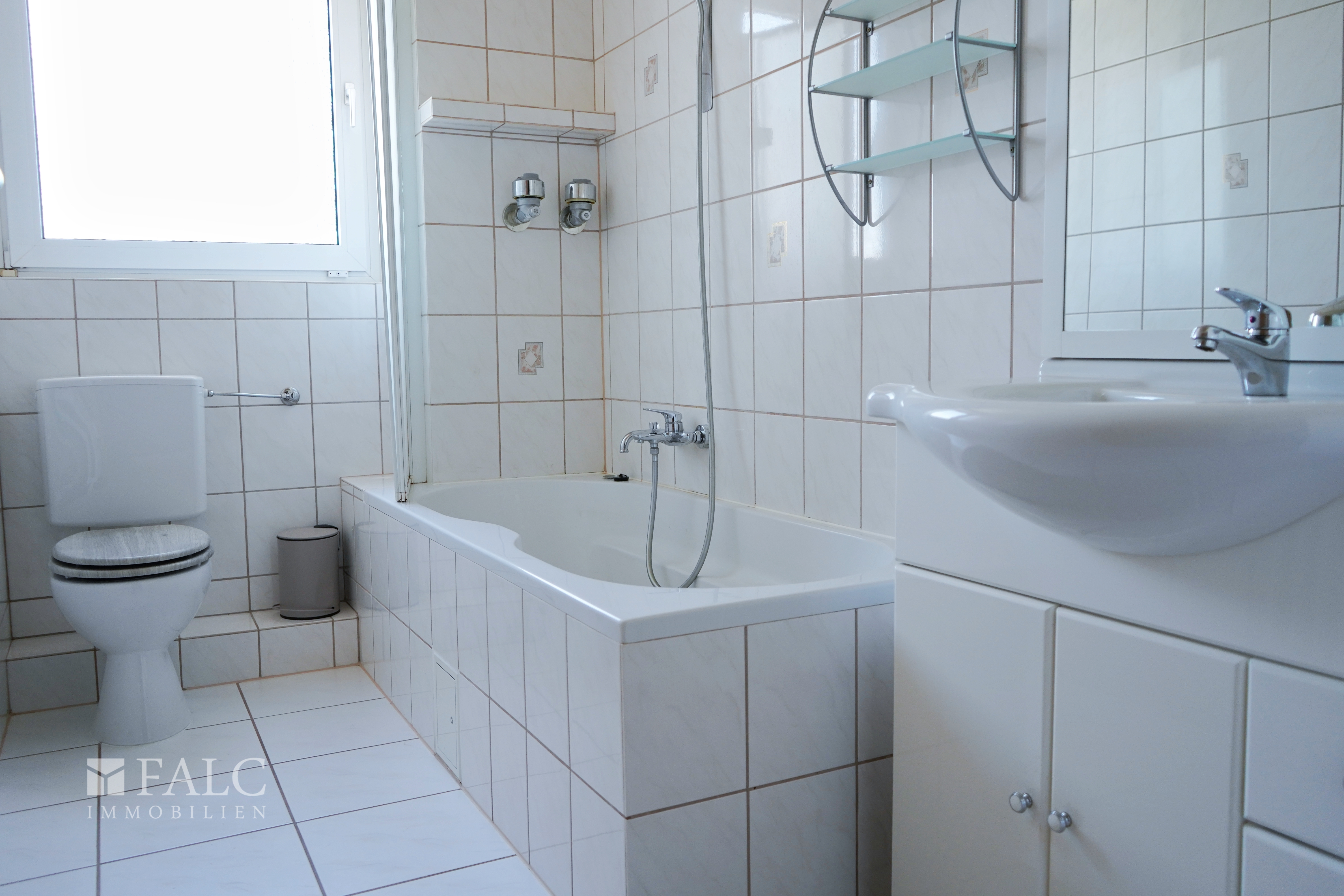 Das Badezimmer ist funktional gestaltet und verfügt über eine Badewanne, ein Waschbecken und eine Toilette. Zusätzlich gibt es ein separates Gäste-WC, das den Komfort für Besucher erhöht.
