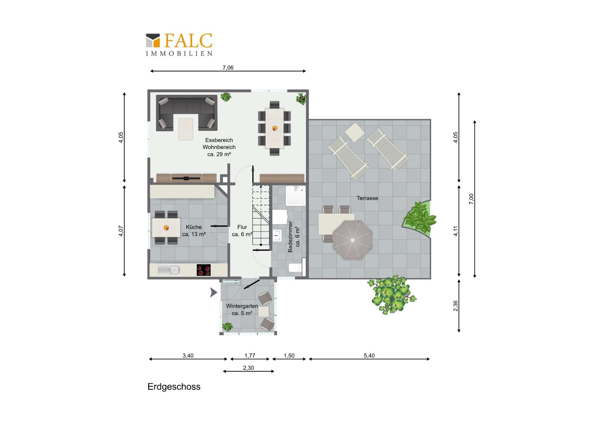Im Erdgeschoss bildet der ca. 29 m² große Wohn- und Essbereich das Herzstück des Hauses. Durch seine Helligkeit und Großzügigkeit entsteht eine angenehme Wohnatmosphäre – ein freier Kaminabzug ermöglicht Ihnen zudem die Installation eines Kamins für noch mehr Wohnkomfort. Ein besonderes Highlight ist der lichtdurchflutete Wintergarten, der gleichzeitig den Eingangsbereich des Hauses bildet – ein wunderbarer Ort zum Entspannen mit tollem Blick. Die hochwertige Einbauküche mit modernen Neff-Geräten ist bereits im Kaufpreis enthalten und lässt keine Wünsche offen.