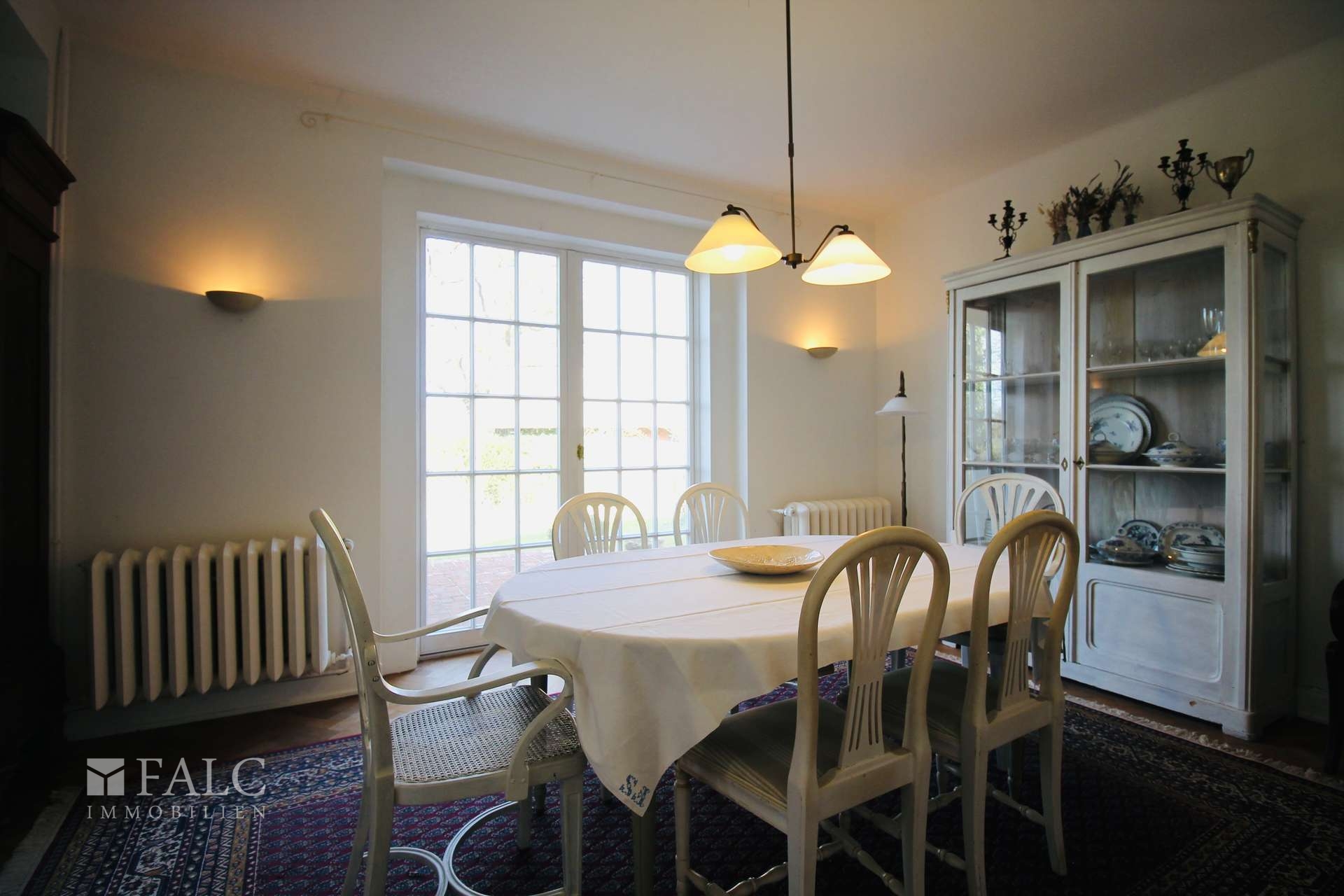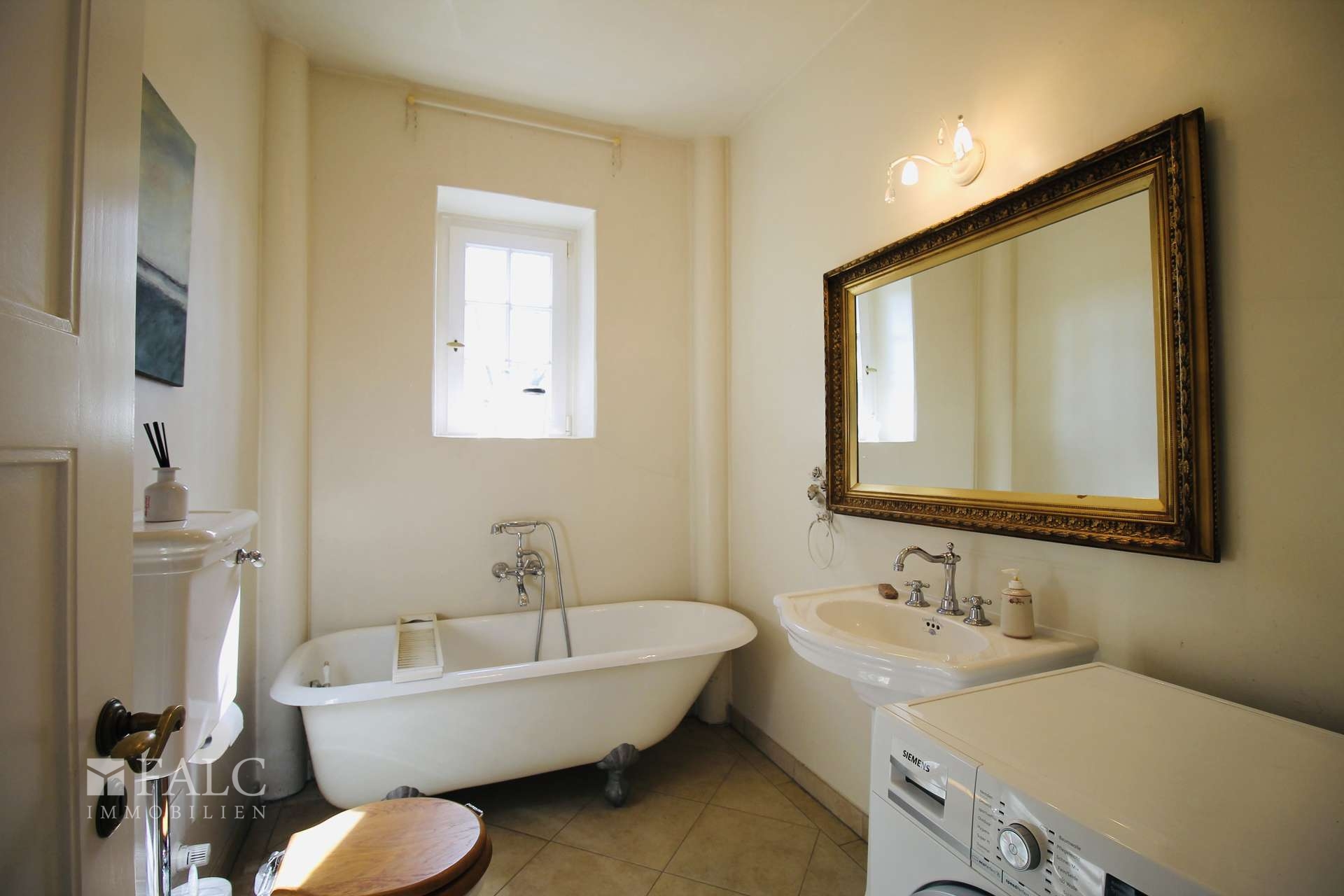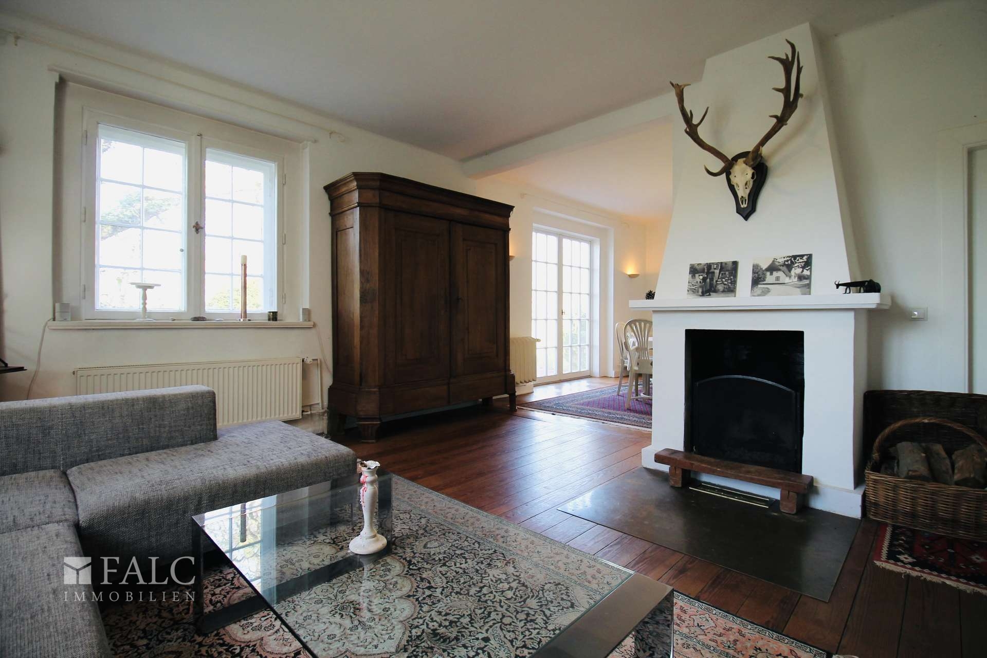 Im Erdgeschoss befindet sich das geräumige Wohnzimmer mit Kamin und angrenzendem Esszimmer, das durch seine großen Fenster viel Tageslicht einfängt und direkten Zugang zur Terrasse bietet. Diese lädt dazu ein, entspannte Stunden im Freien zu verbringen und den Blick in den wundervollen Garten zu genießen. Die Küche, ebenfalls im Erdgeschoss gelegen, ist funktional und bietet genügend Raum für gemeinsame Mahlzeiten. Ein weiteres Highlight ist das Badezimmer, das mit seiner klassischen Ausstattung den Charme vergangener Zeiten bewahrt, dies ist mit einer Badewanne ausgetattet.
