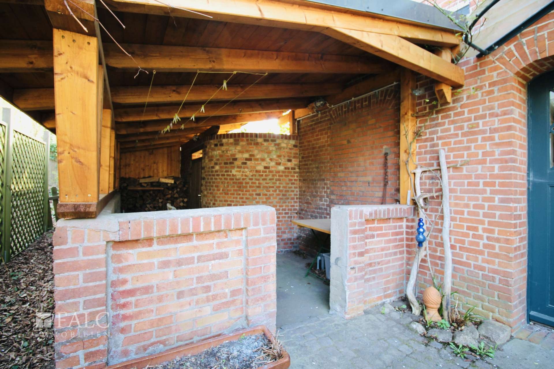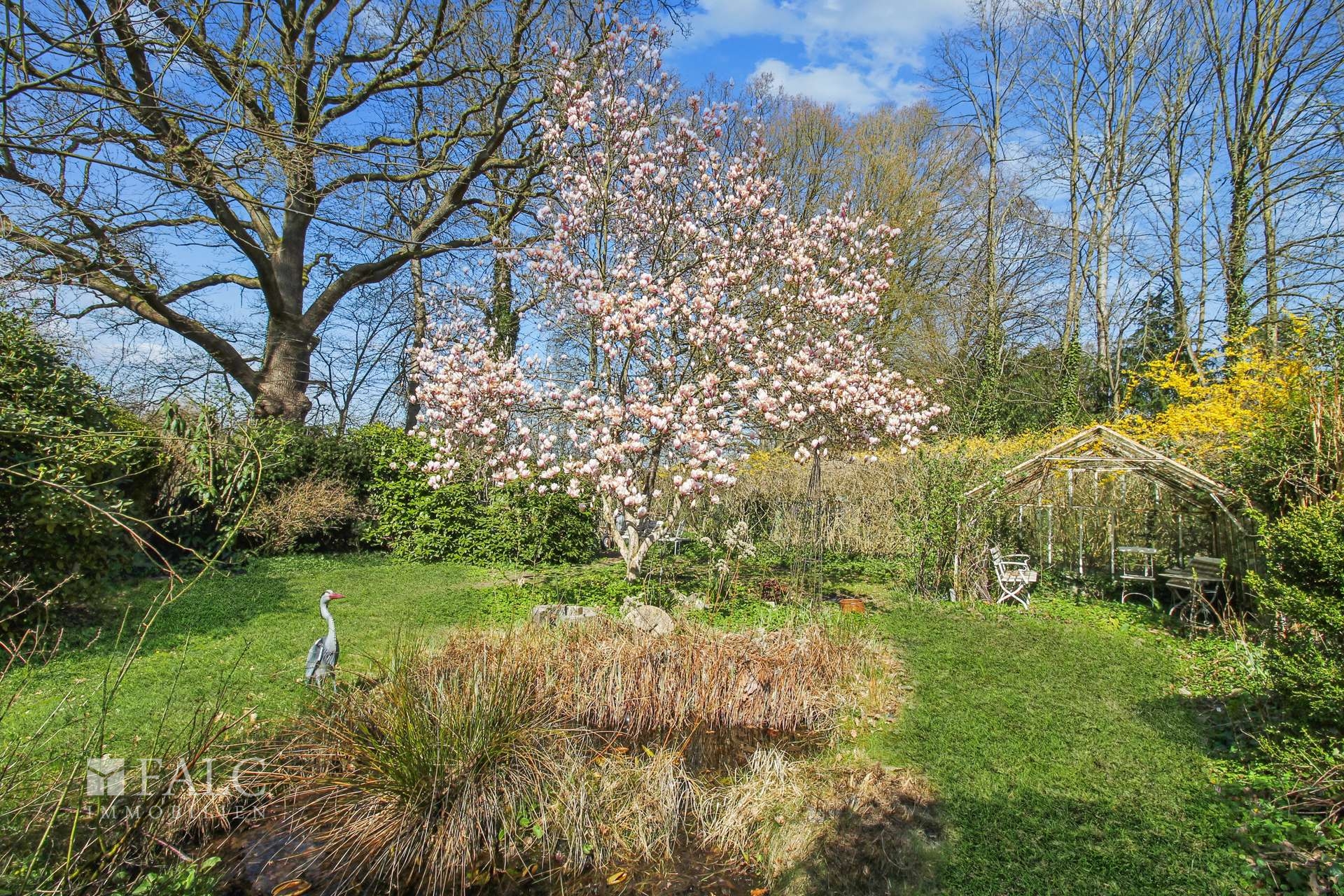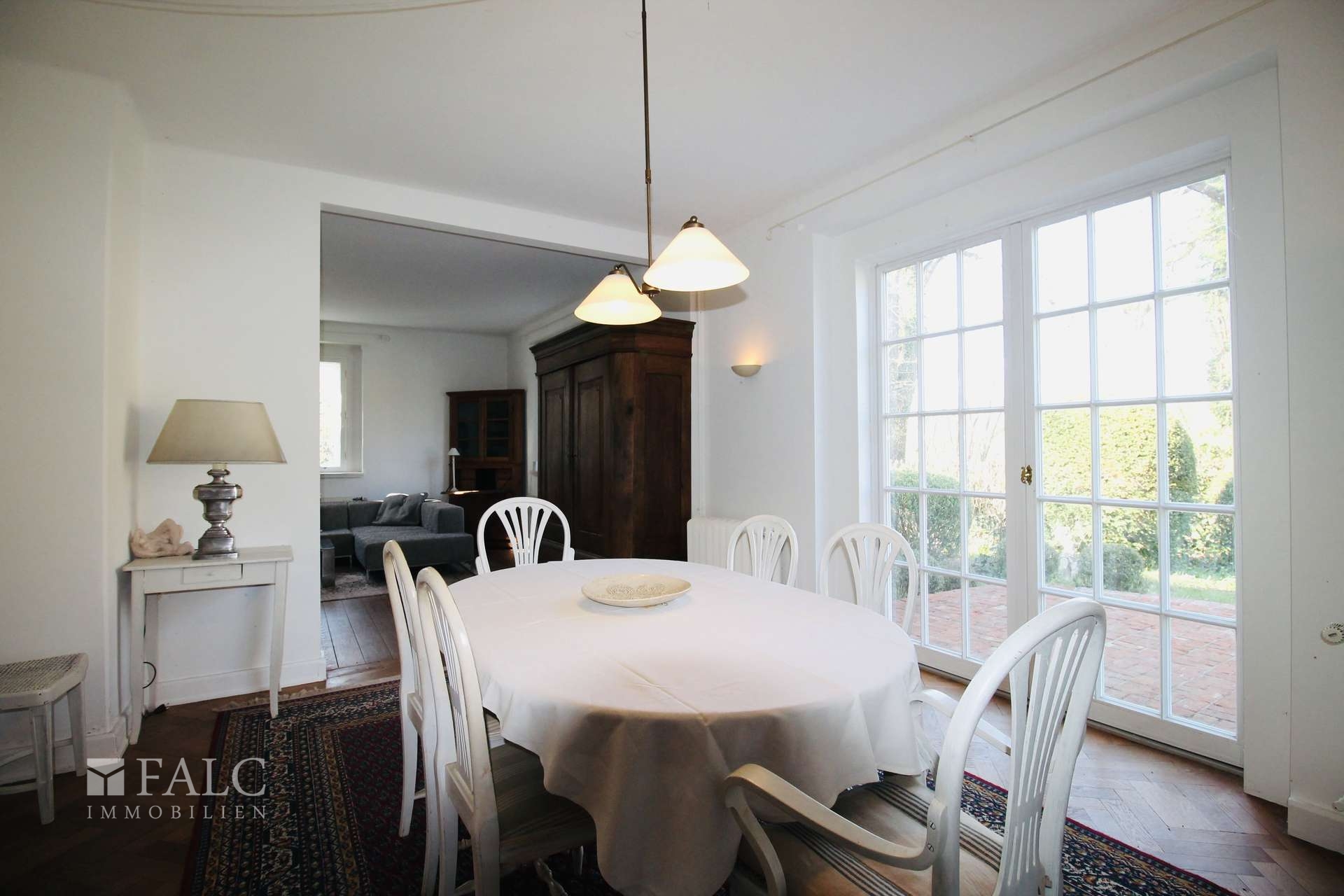 Im Erdgeschoss befindet sich das geräumige Wohnzimmer mit Kamin und angrenzendem Esszimmer, das durch seine großen Fenster viel Tageslicht einfängt und direkten Zugang zur Terrasse bietet. Diese lädt dazu ein, entspannte Stunden im Freien zu verbringen und den Blick in den wundervollen Garten zu genießen. Die Küche, ebenfalls im Erdgeschoss gelegen, ist funktional und bietet genügend Raum für gemeinsame Mahlzeiten. Ein weiteres Highlight ist das Badezimmer, das mit seiner klassischen Ausstattung den Charme vergangener Zeiten bewahrt, dies ist mit einer Badewanne ausgetattet.