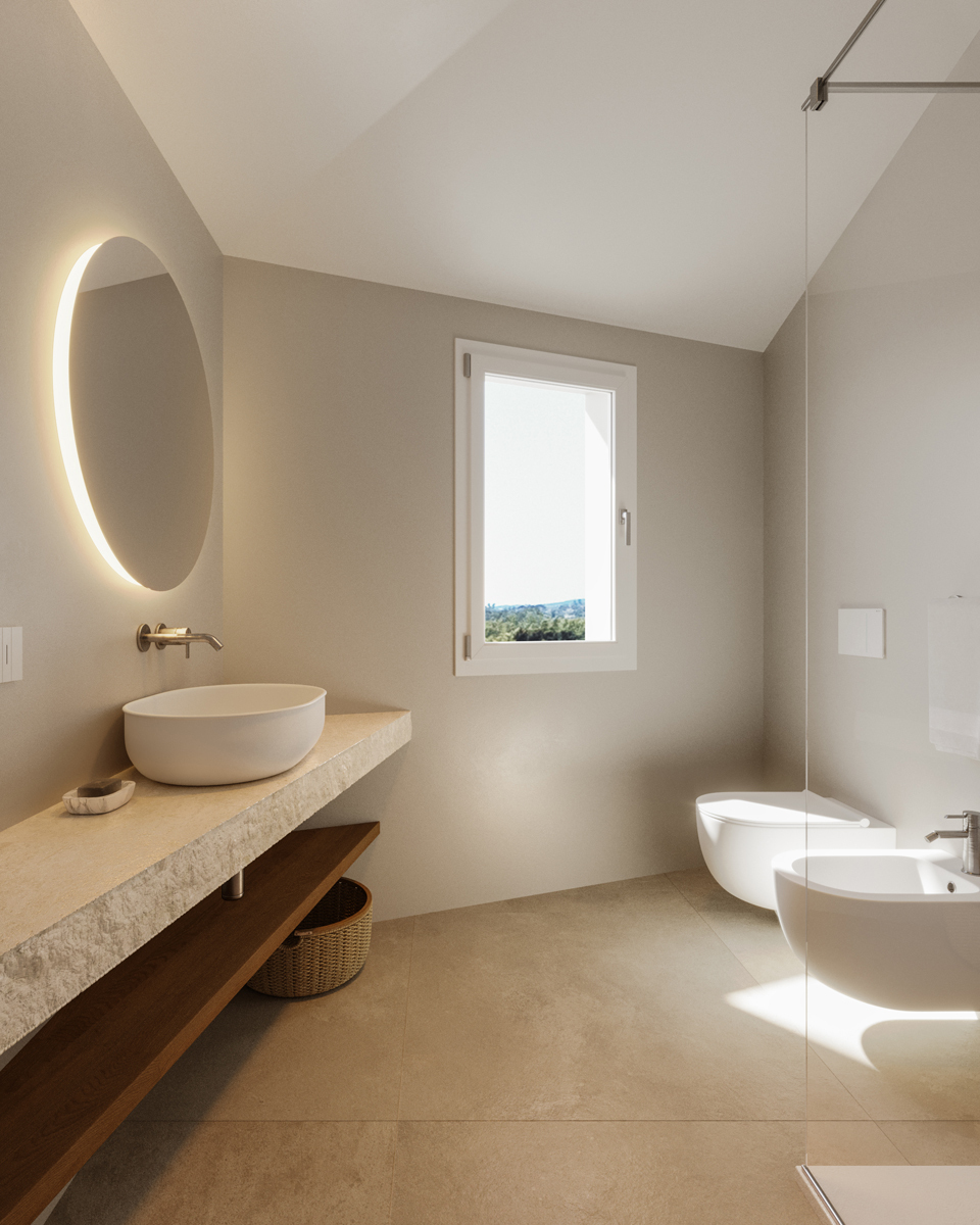 Der Schlafbereich, durch eine Tür vom Wohnbereich getrennt, umfasst zwei Schlafzimmer mit Doppelbett und großen Fenstern. Das Badezimmer verfügt über eine großzügige Dusche, Waschbecken, WC, Bidet und ein Fenster. Im Erdgeschoss befindet sich ein separates Schlafzimmer mit eigenem Bad und eigenem Eingang. In jedem Raum sind innovative Gebläsekonvektoren in attraktivem Design als Heiz- und Kühlsystem installiert, was für angenehme Temperaturen sorgt.