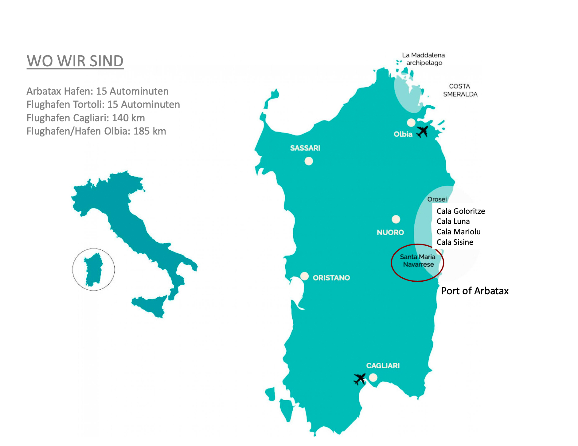 Santa Maria Navarrese liegt strategisch günstig, etwa auf halber Strecke zwischen den großen Flughäfen Olbia (185 km) und Cagliari (140 km). Es ist der perfekte Ausgangspunkt, um alles zu erleben, was die Ogliastra ihren Besuchern zu bieten hat, darunter atemberaubende Wanderungen im Naturschutzgebiet von Supramonte und Gennargentu, Fahrradtouren, Schlauchbootausflüge und kulinarische Genüsse.