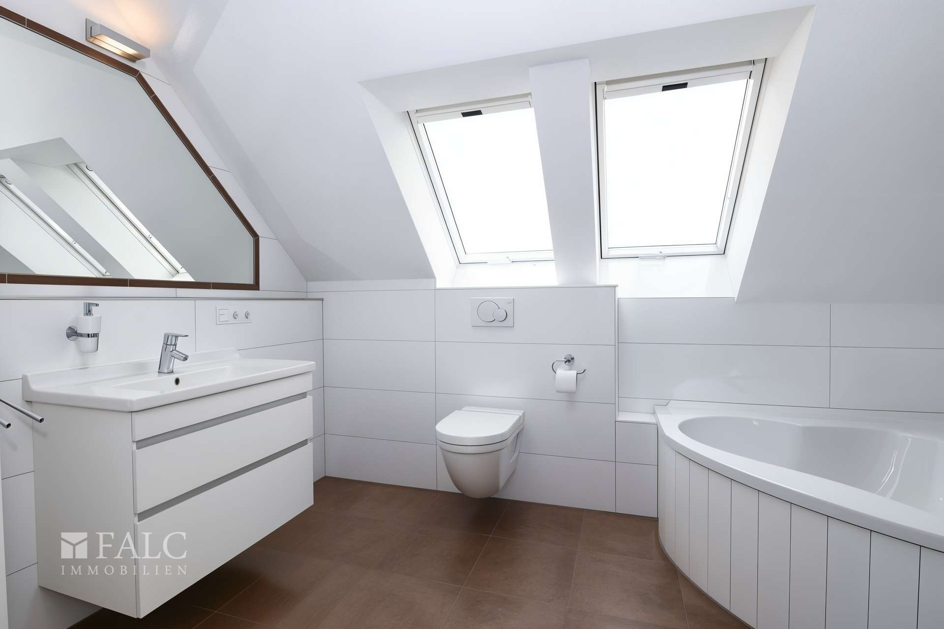 Ihr modernes Tageslichtbad ist mit einer Eckbadewanne, einer separaten Dusche, einem Waschtisch und einem WC ausgestattet. Ein Handtuchheizkörper sorgt für zusätzlichen Komfort. Ein separates Gäste-WC mit Waschtisch ist ebenfalls vorhanden.