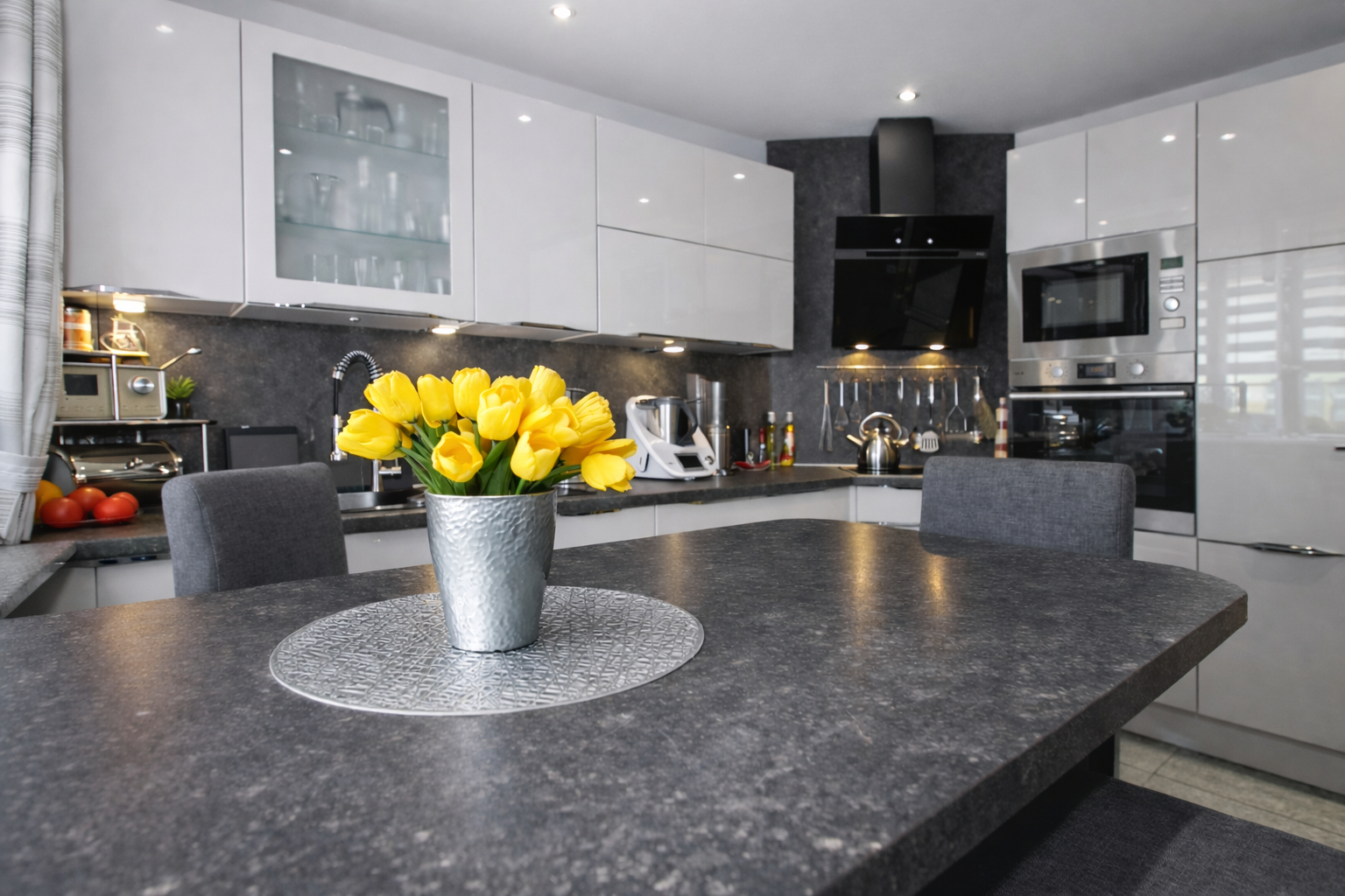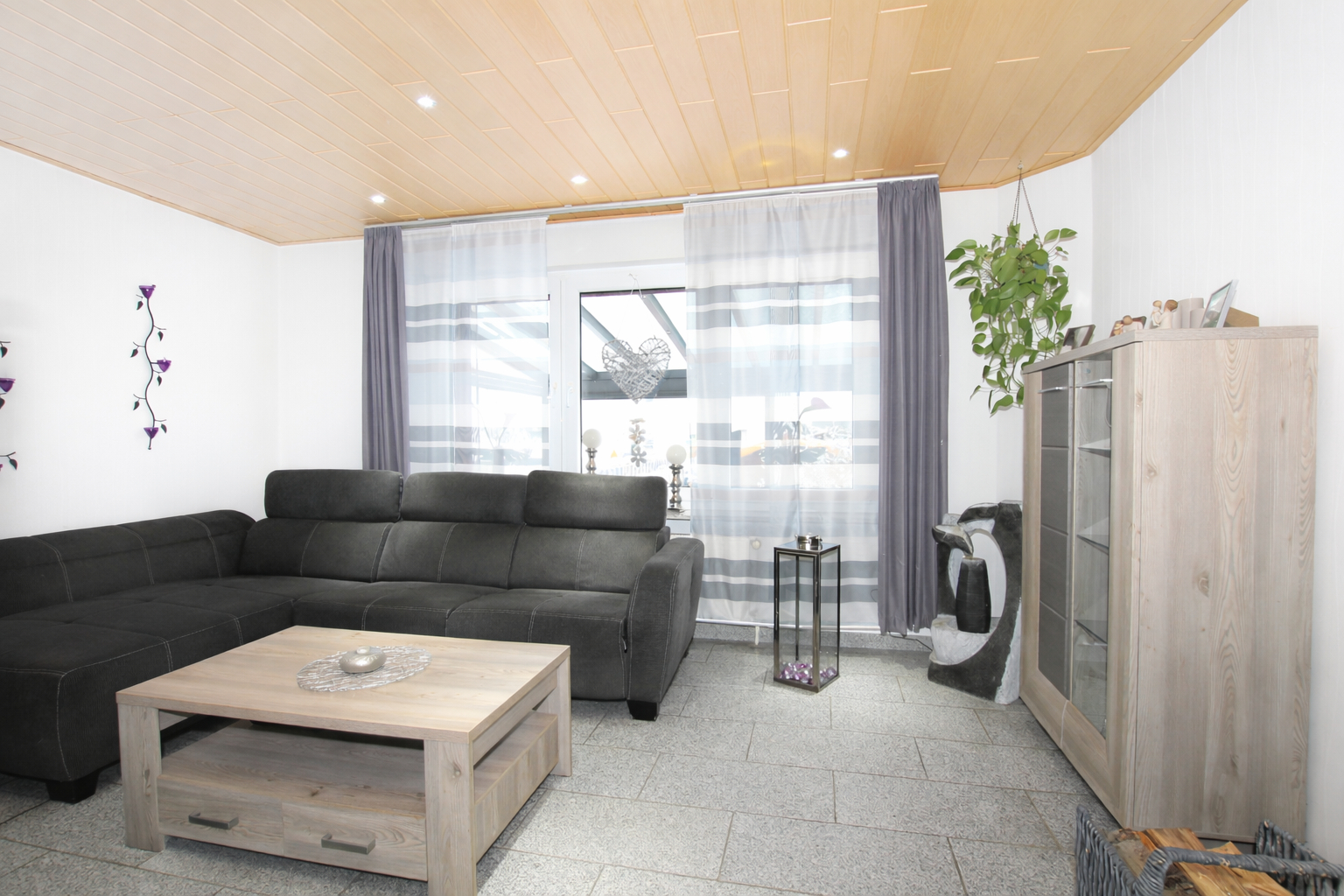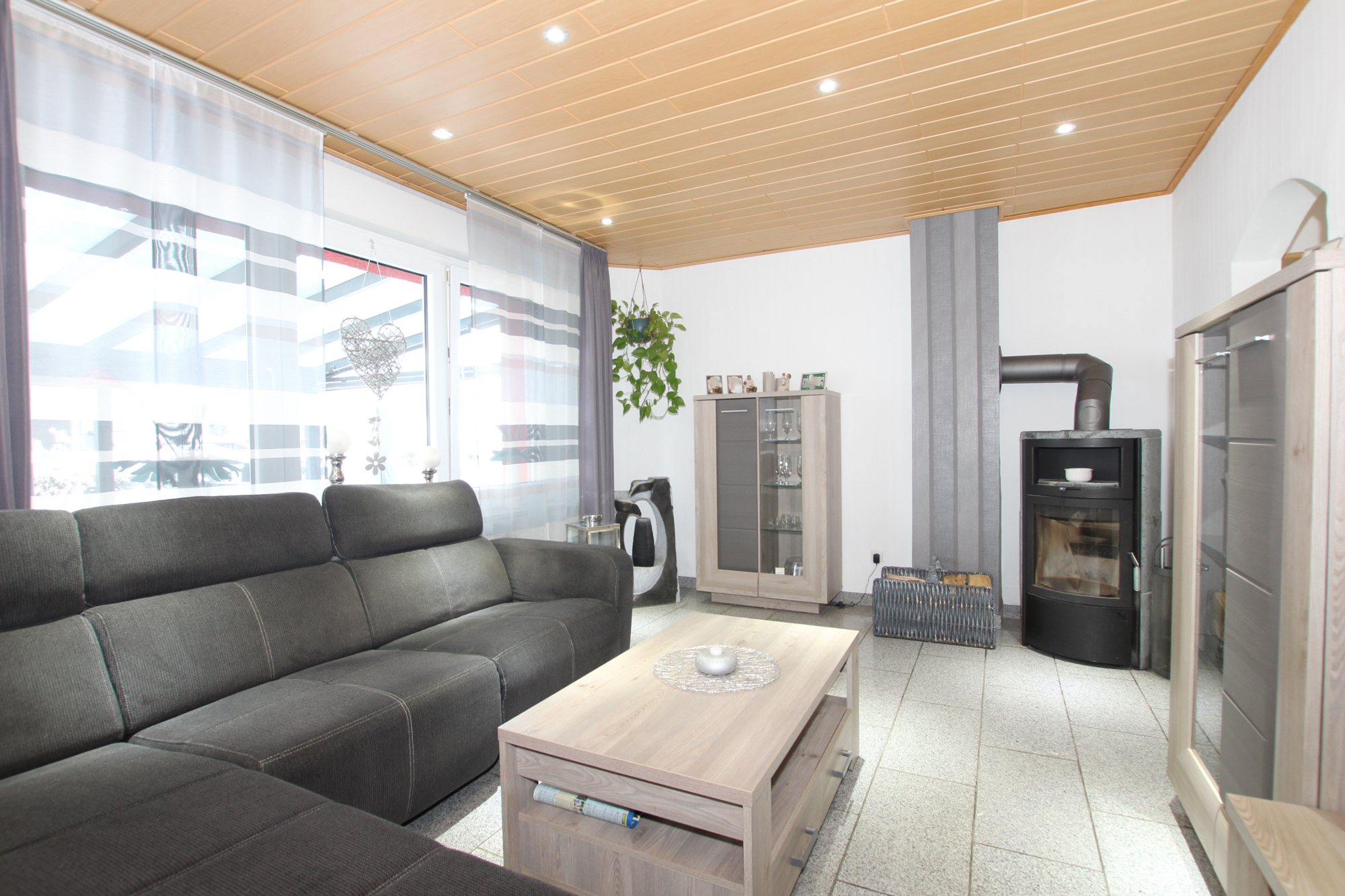 Direkt neben der Küche liegt das Wohnzimmer, ausgestattet mit einem hochwertigen Granitboden und einem Kaminofen, der für gemütliche Wärme sorgt. Ein Zugang zur Terrasse vom Wohnzimmer aus besteht derzeit nicht, kann jedoch ohne weiteres realisiert werden.