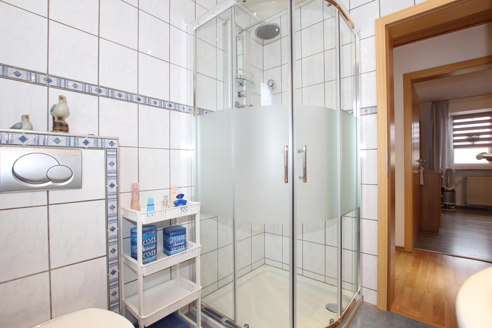 Im ersten Obergeschoss befinden sich zwei Schlafzimmer sowie ein deckenhoch gefliestes Tageslicht Badezimmer, das mit einer Dusche sowie einem Hänge-WC ausgestattet ist. Die Räume sind hell und freundlich, bieten ein angenehmes Wohnambiente und ausreichen Platz für eigene Vorstellungen.