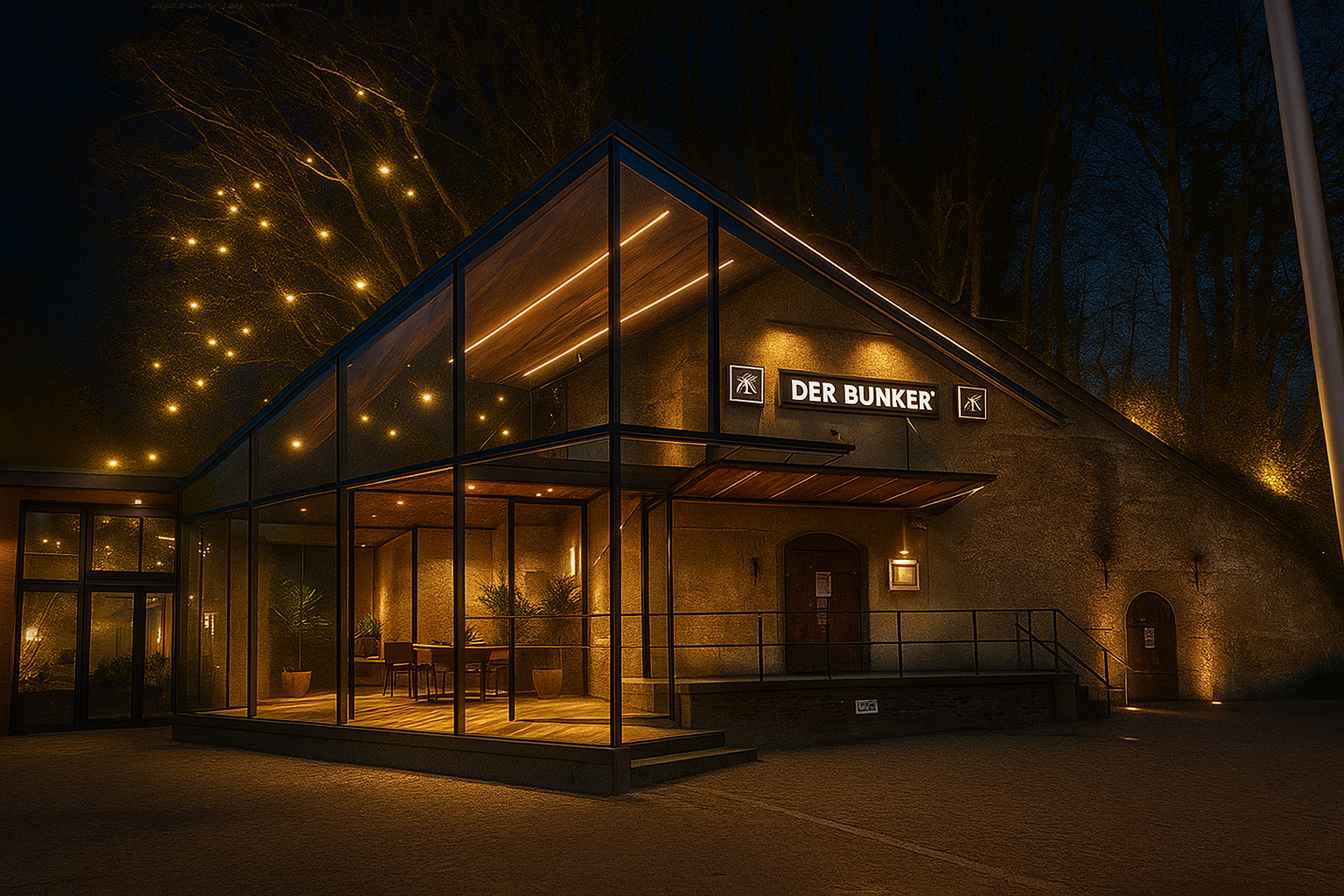 Vision für die Zukunft: „Der Bunker“ bietet die seltene Gelegenheit, Denkmal, Kultur und wirtschaftlich tragfähige Nutzung in einem Leuchtturmprojekt zu vereinen. Die vorliegende Konzeptstudie sieht eine behutsame Öffnung des massiven Bestands vor, ergänzt durch einen modernen, lichtdurchfluteten Glas-Anbau. Der architektonische Kontrast zwischen historischer Substanz und zeitgemäßem Design schafft eine einzigartige Atmosphäre.