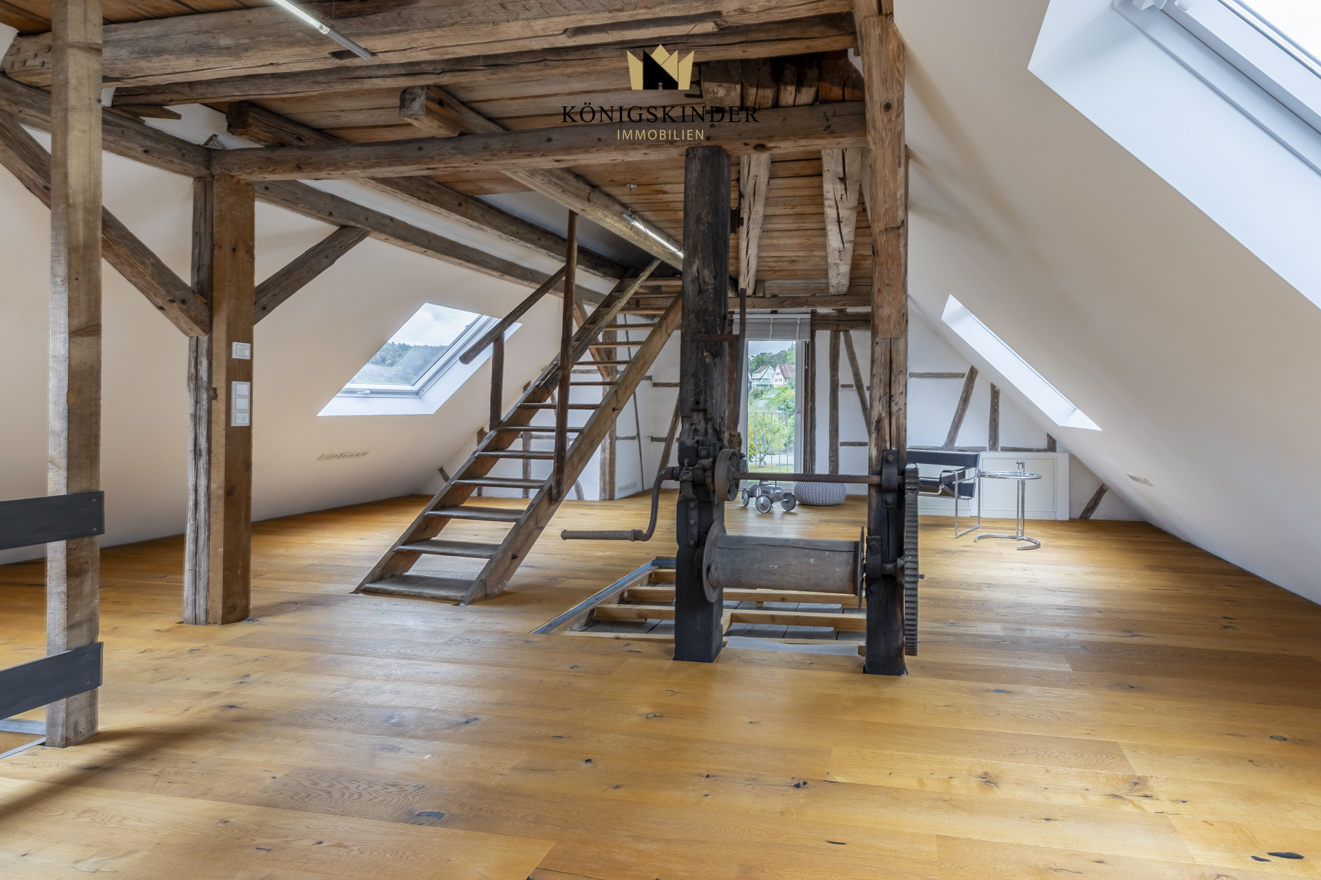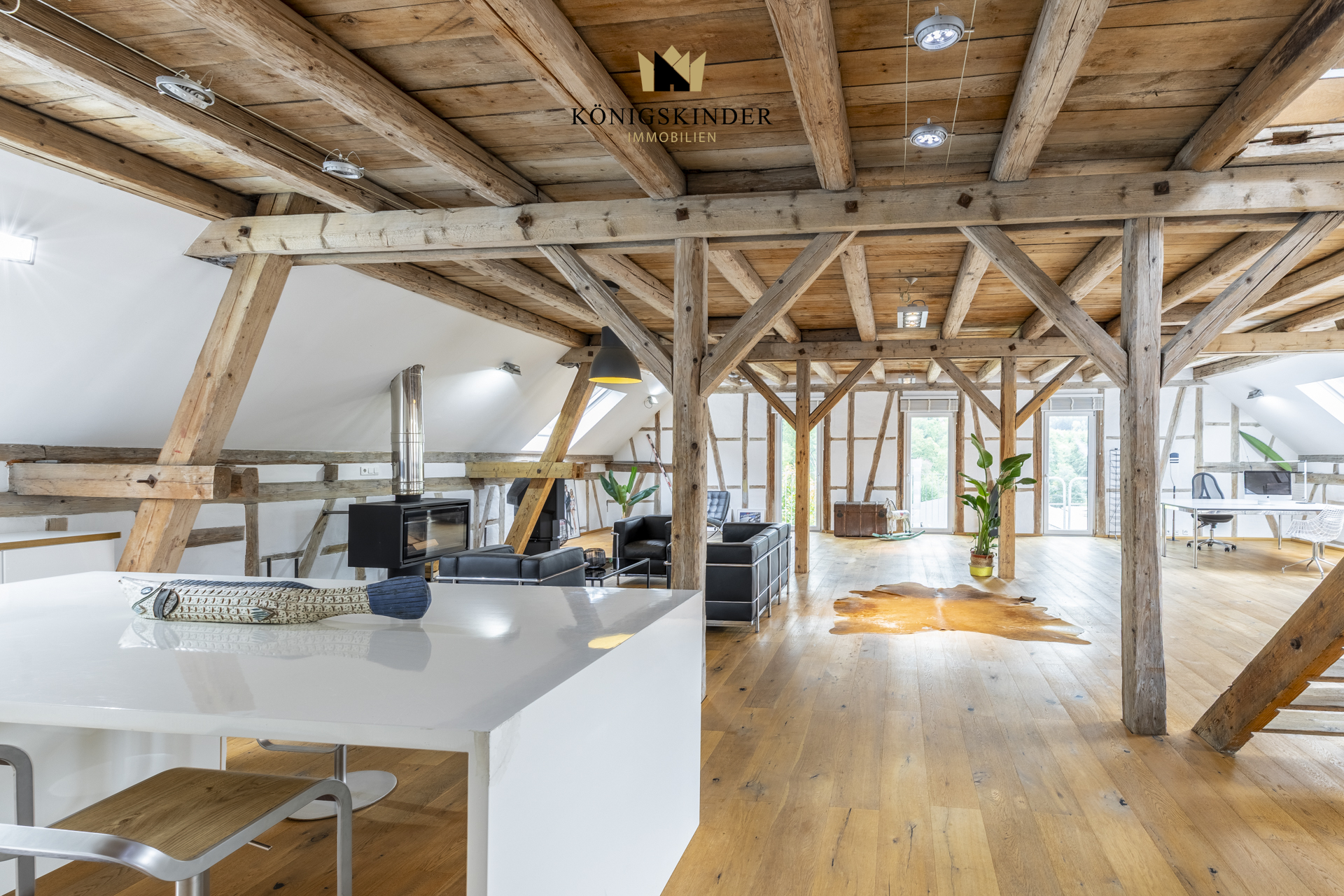 Die sichtbaren Holzbalken, der offene Schnitt und die großzügige Fläche schaffen ein Raumgefühl, das man nicht planen kann – es ist einfach da. Die moderne Küche fügt sich unaufdringlich ins Gesamtbild ein und bietet Platz für gemeinsames Kochen oder kurze Pausen im Arbeitsalltag.