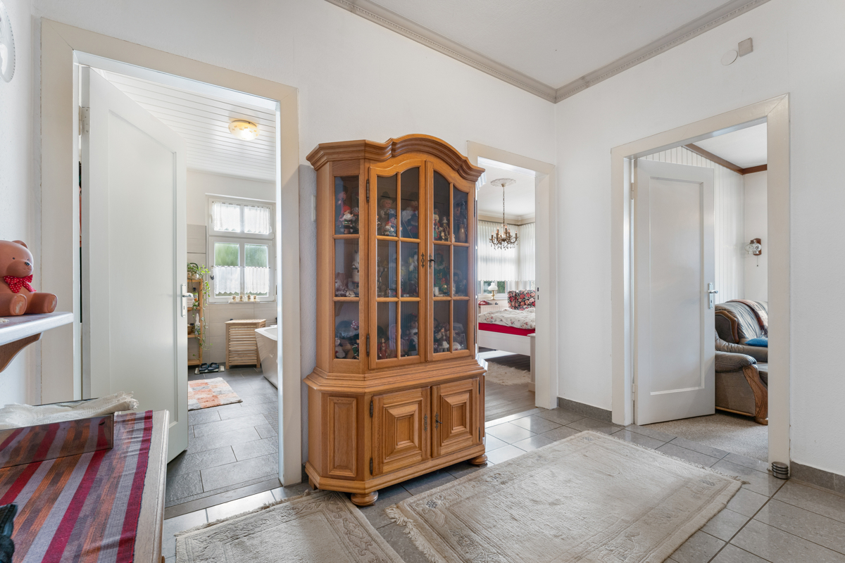 Bereits im Erdgeschoss spürt man die Großzügigkeit des Hauses. Ein weitläufiger Eingangsbereich heißt Sie willkommen und führt in einen einladenden Flur, der als zentraler Punkt der Etage dient. Von hier aus erschließen sich der geschmackvoll gestaltete Wohn- und Essbereich sowie alle weiteren Räume dieser Ebene. Der Flur vermittelt sofort eine warme, wohnliche Atmosphäre und unterstreicht den harmonischen Charakter des gesamten Wohnkonzepts. Das Wohnzimmer lädt zu gemütlichen, entspannten Stunden ein, während der angrenzende helle Wohnraum - derzeit als Schlafzimmer genutzt - ebenso gut als Büro oder Gästezimmer dienen kann. Besonders charmant präsentiert sich das angrenzende Esszimmer – die gute Stube des Hauses –, von dem aus Sie einen wunderbaren Blick in den parkähnlich angelegten Garten genießen und direkt auf die Terrasse gelangen. Die Küche ist praktisch angebunden und überzeugt mit Komfort und guter Ausstattung – ein Ort, an dem das Kochen Freude bereitet. Direkt daran grenzt ein liebevoll gestalteter Wintergarten, der sowohl Pflanzenfreunde als auch Ruhesuchende anspricht und Raum zum Verweilen bietet. Ergänzt wird das Erdgeschoss durch ein komfortables Badezimmer mit ebenerdiger Dusche und Badewanne, ein separates Gäste-WC sowie einen nützlichen Abstellraum für Vorräte und Alltagsgegenstände.