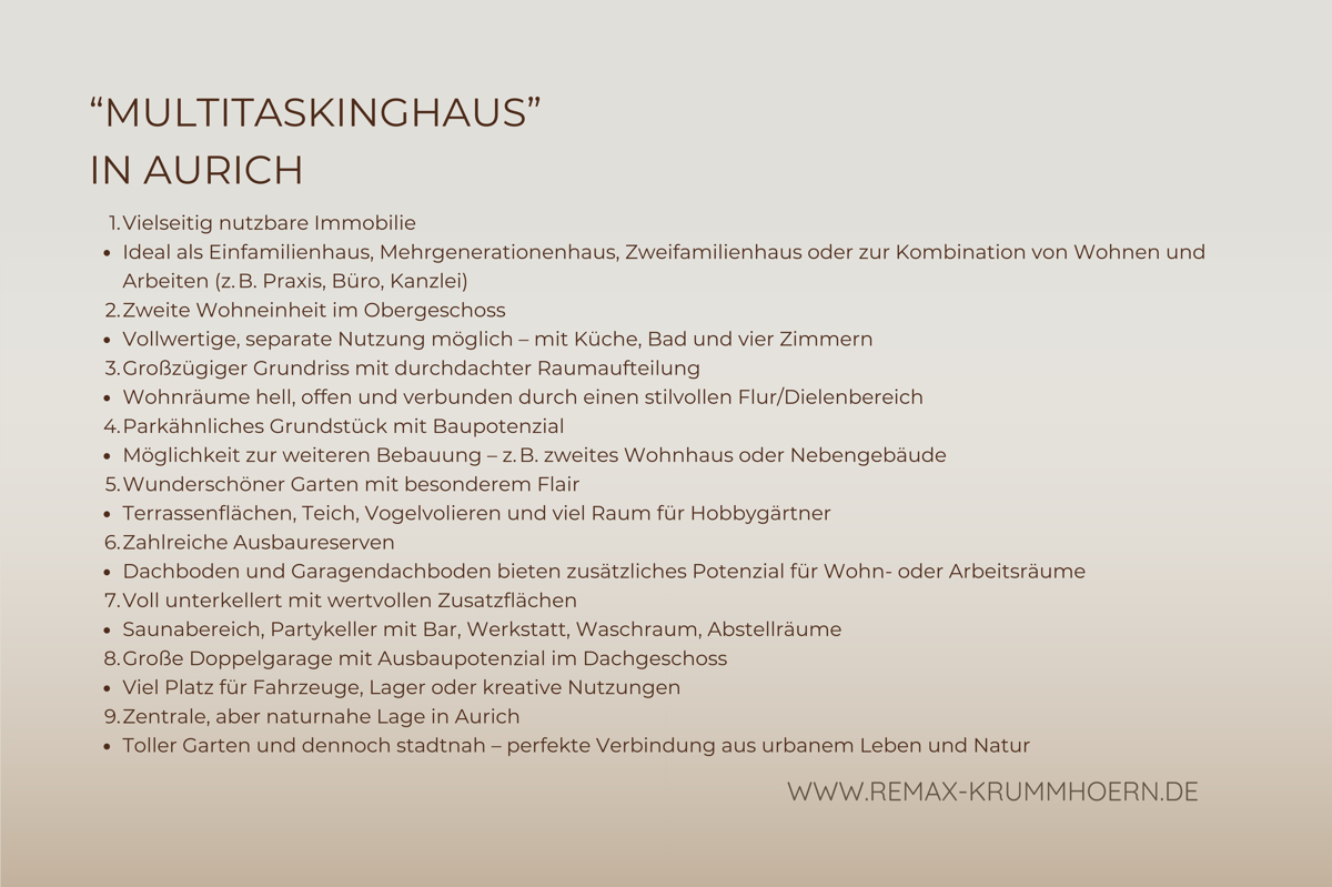 Dieses Multitaskinghaus steht für Lebensqualität in ihrer flexibelsten Form. Es bietet nicht nur Platz, sondern vor allem Möglichkeiten – für Familien, Unternehmer, Kreative und alle, die Wohnen nicht nur als Funktion, sondern als Lebenskonzept verstehen. Ein Haus mit Charakter, (Ausbau)Potenzial und Raum für Visionen, verbunden mit der Kombination aus urbanem Komfort und naturnaher Umgebung machen dieses Angebot zu einem außergewöhnlichen Zuhause.