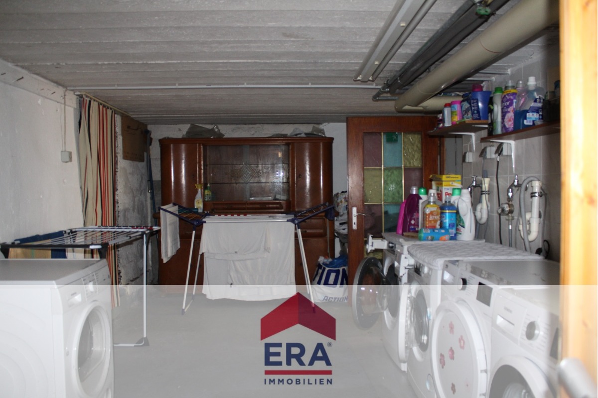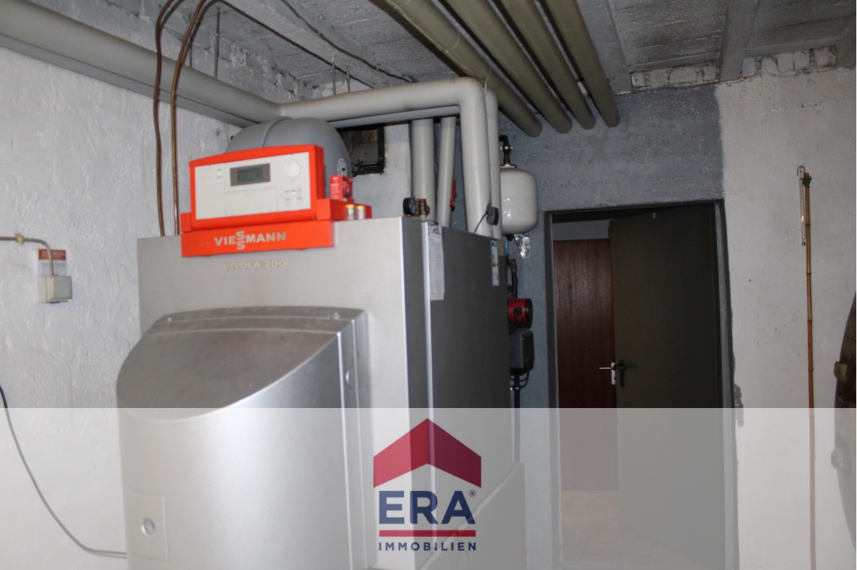 Der Keller des Hauses bietet zwei zusätzliche Räume: Einer dient als gemeinschaftlich genutzte Werkstatt und Waschraum, der andere als zusätzlicher Abstellraum, was den Stauraumbedarf optimal abdeckt. Der Wärmeerzeuger stammt aus dem Jahr 2004.
