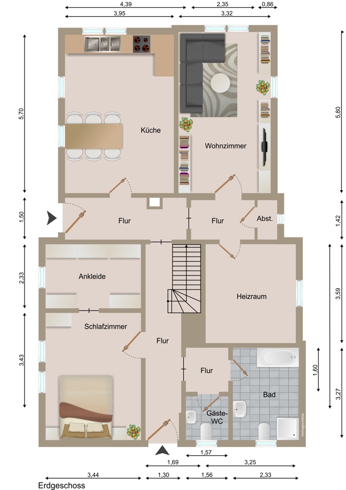 Die Wohnfläche verteilt sich auf insgesamt vier Zimmer, ergänzt durch funktionale Nebenräume. Im Erdgeschoss befindet sich ein komfortables Schlafzimmer mit angrenzendem Ankleidezimmer, ideal für ebenerdiges Wohnen. Ebenfalls im Erdgeschoss liegen die Küche, ein modern ausgestattetes Badezimmer mit Badewanne, Dusche, WC und Waschbecken, ein separates Gäste-WC sowie ein Heizungsraum.