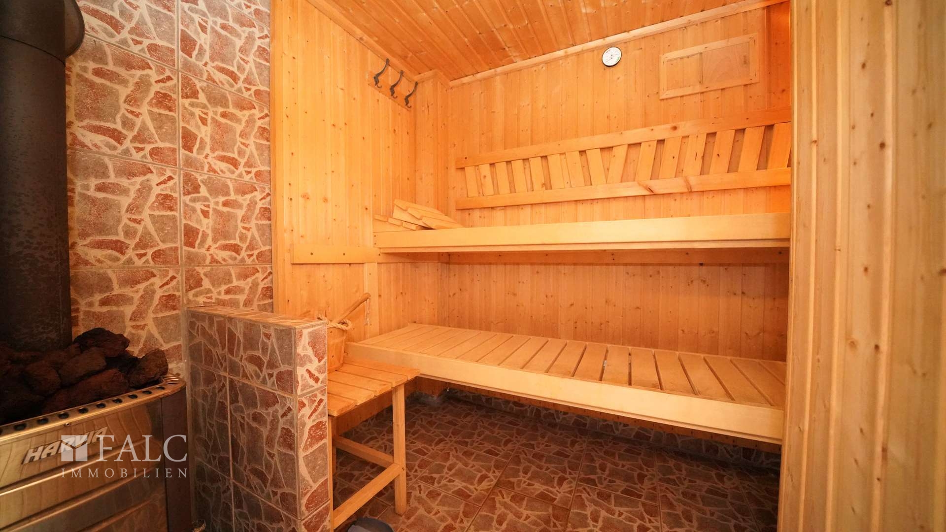 Oder Sie schwitzen erst noch eine Runde in der hauseigenen Sauna, die sich in der Verlängerung der Garage befindet. Eine besondere Atmosphäre verbreitet der Holzgeruch, mit dem die Sauna befeuert wird. Selbstverständlich wurde hier weiter gedacht und eine Dusche und ein WC verbaut.