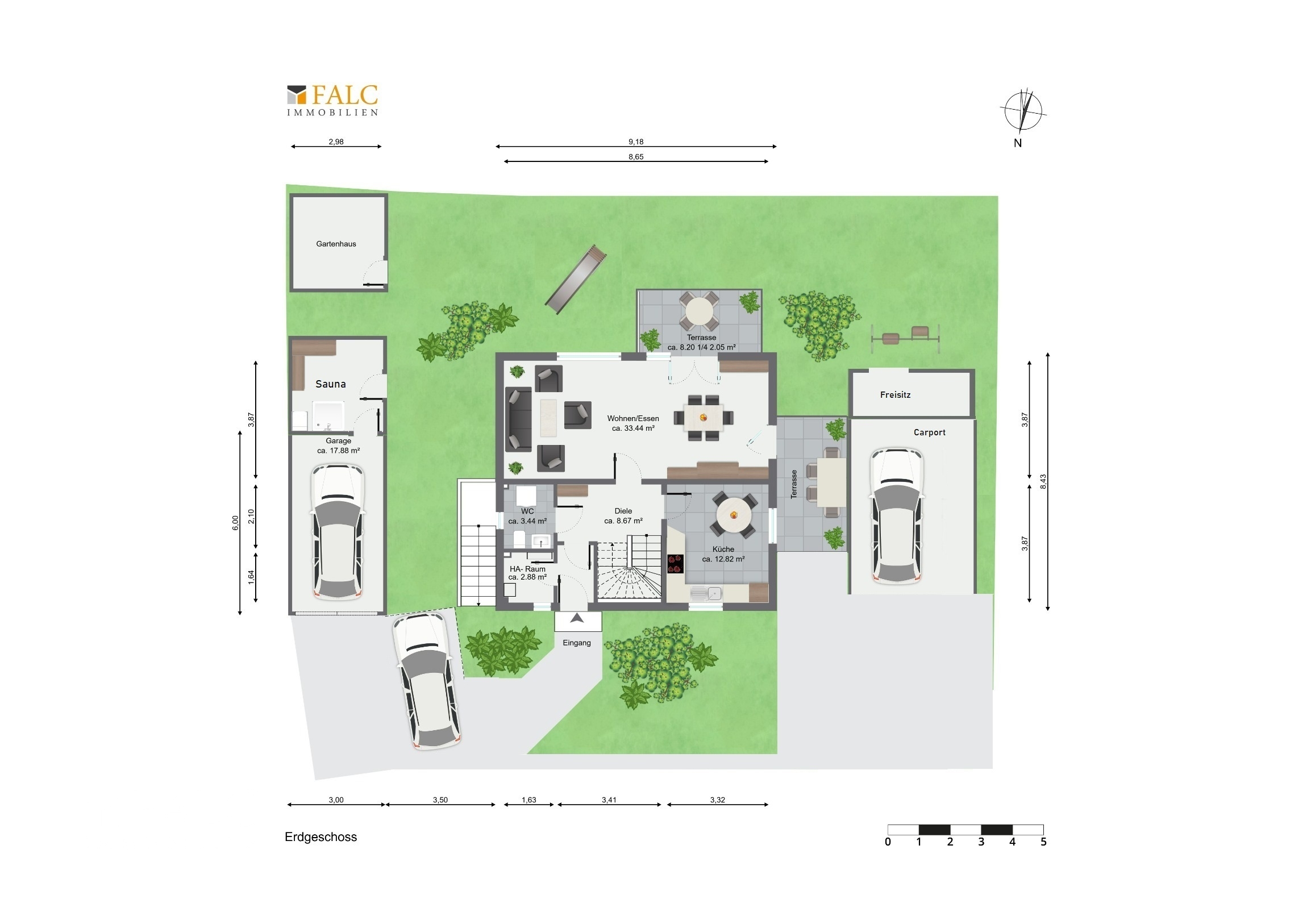 Ihre Fahrzeuge können Sie geschützt in der Garage mit Werkstatt inklusive Wasseranschluss sowie im Carport abstellen, davor finden auch Ihre Besucher genügend Stellfläche. In der Verlängerung der Garage finden Sie eine Sauna für bis zu vier Personen vor, diese wird mit Holz betrieben, was eine besondere Atmosphäre erzeugt.