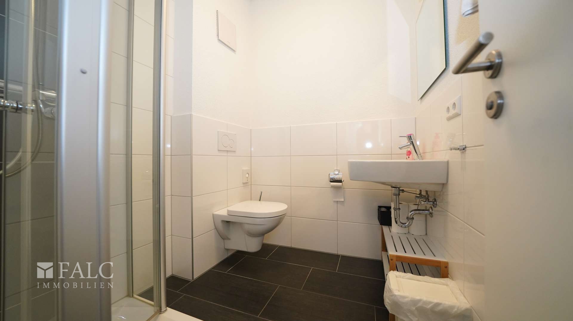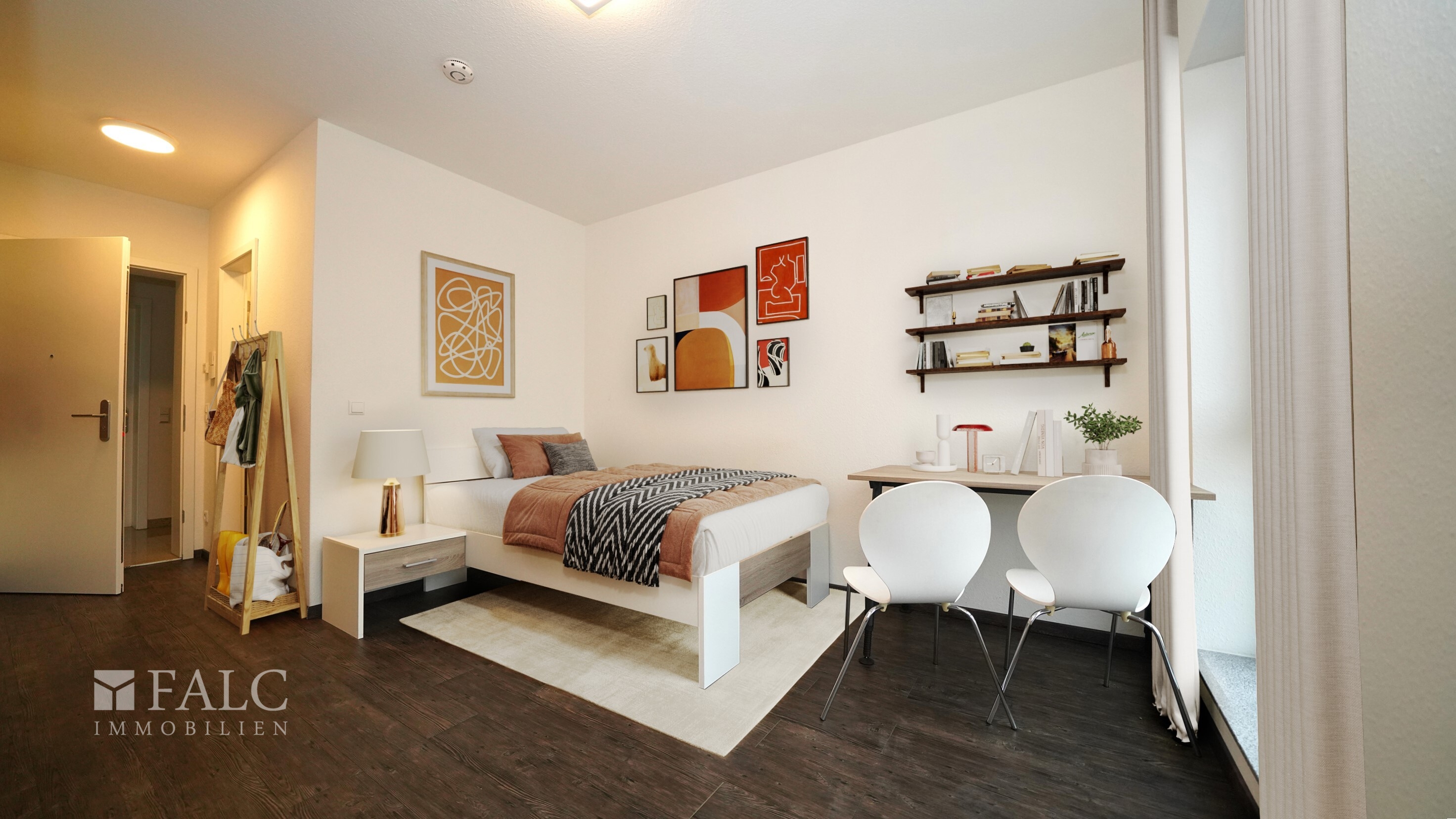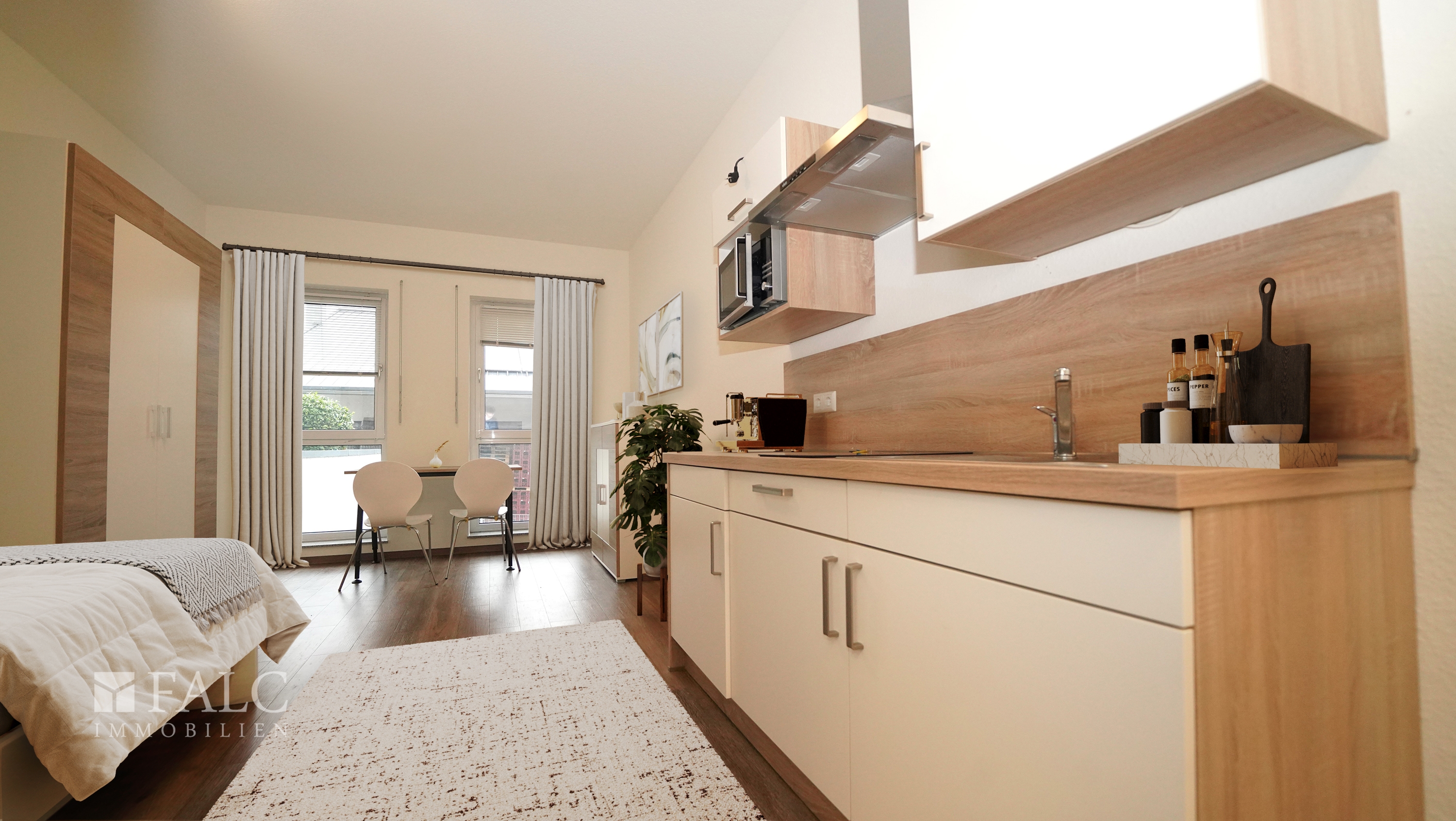 Das offene Wohn- und Schlafzimmer ist ideal für eine individuelle Gestaltung und lädt zum Entspannen ein. In der kleinen, aber funktionalen Küche finden Ihre Mieter alles, was sie für ein entspanntes Kochen brauchen: Stauraum, Kochstelle, Mikrowelle mit Backofenfunktion und eine Ablufthaube. Das Duschbad ist modern und zeitlos in Weiß gehalten.