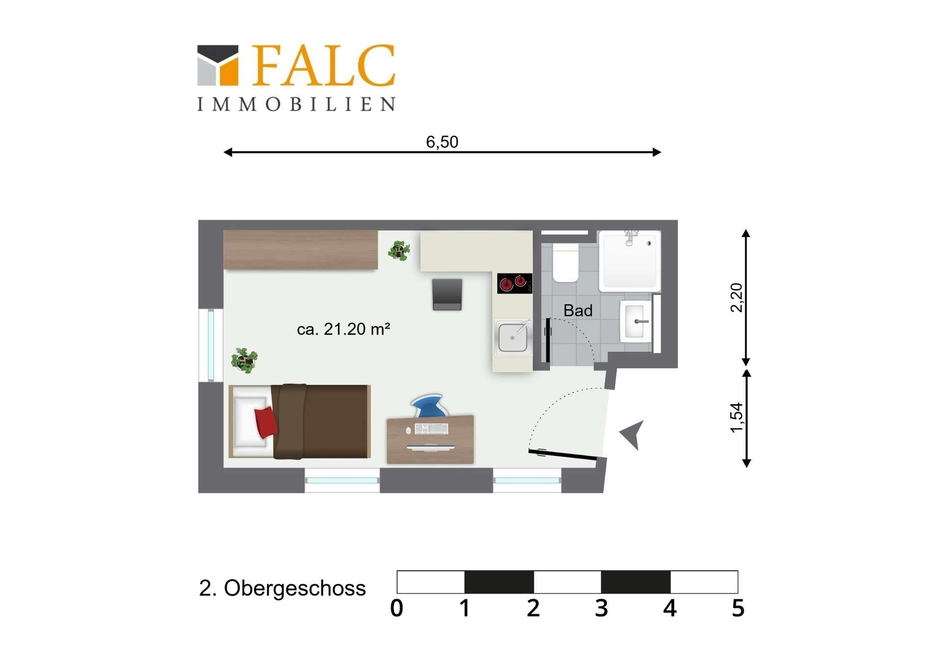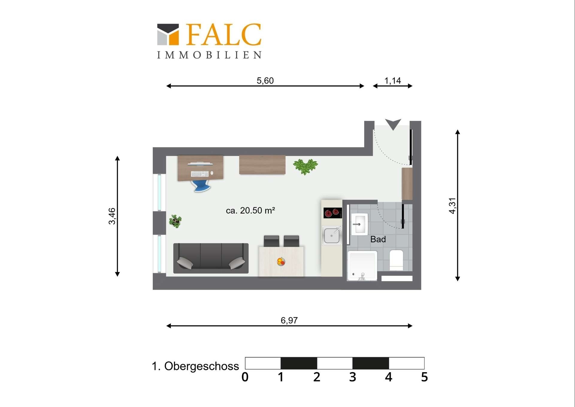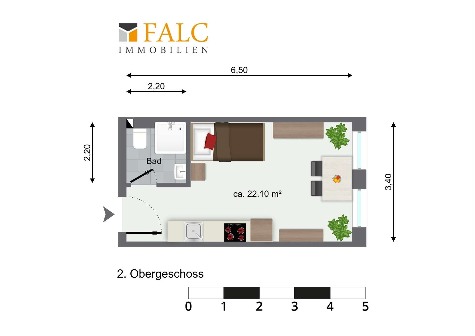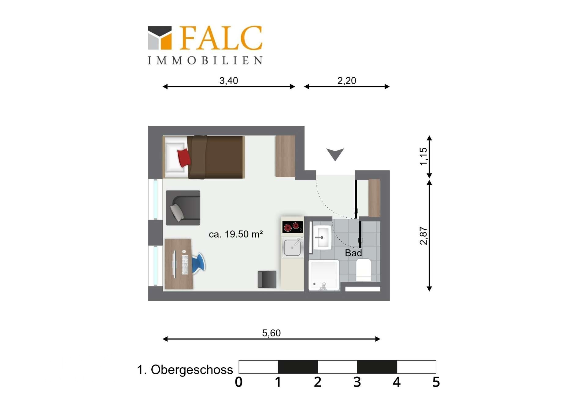 Das offene Wohn- und Schlafzimmer ist ideal für eine individuelle Gestaltung und lädt zum Entspannen ein. In der kleinen, aber funktionalen Küche finden Ihre Mieter alles, was sie für ein entspanntes Kochen brauchen: Stauraum, Kochstelle, Mikrowelle mit Backofenfunktion und eine Ablufthaube. Das Duschbad ist modern und zeitlos in Weiß gehalten.