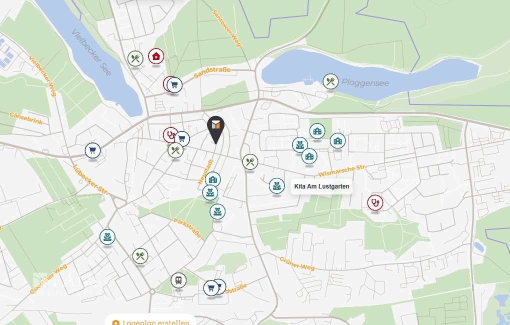 Durch die verkehrsgünstige Lage sind umliegende Städte schnell erreichbar. Die Hansestadt Wismar liegt etwa 20 Kilometer östlich, Lübeck rund 40 Kilometer westlich und die Landeshauptstadt Schwerin ist etwa 33 Kilometer entfernt. Besonders attraktiv ist auch die Nähe zur Ostsee, die sich in nur etwa 15 Kilometern Entfernung befindet und zahlreiche Möglichkeiten zur Erholung und Freizeitgestaltung bietet.